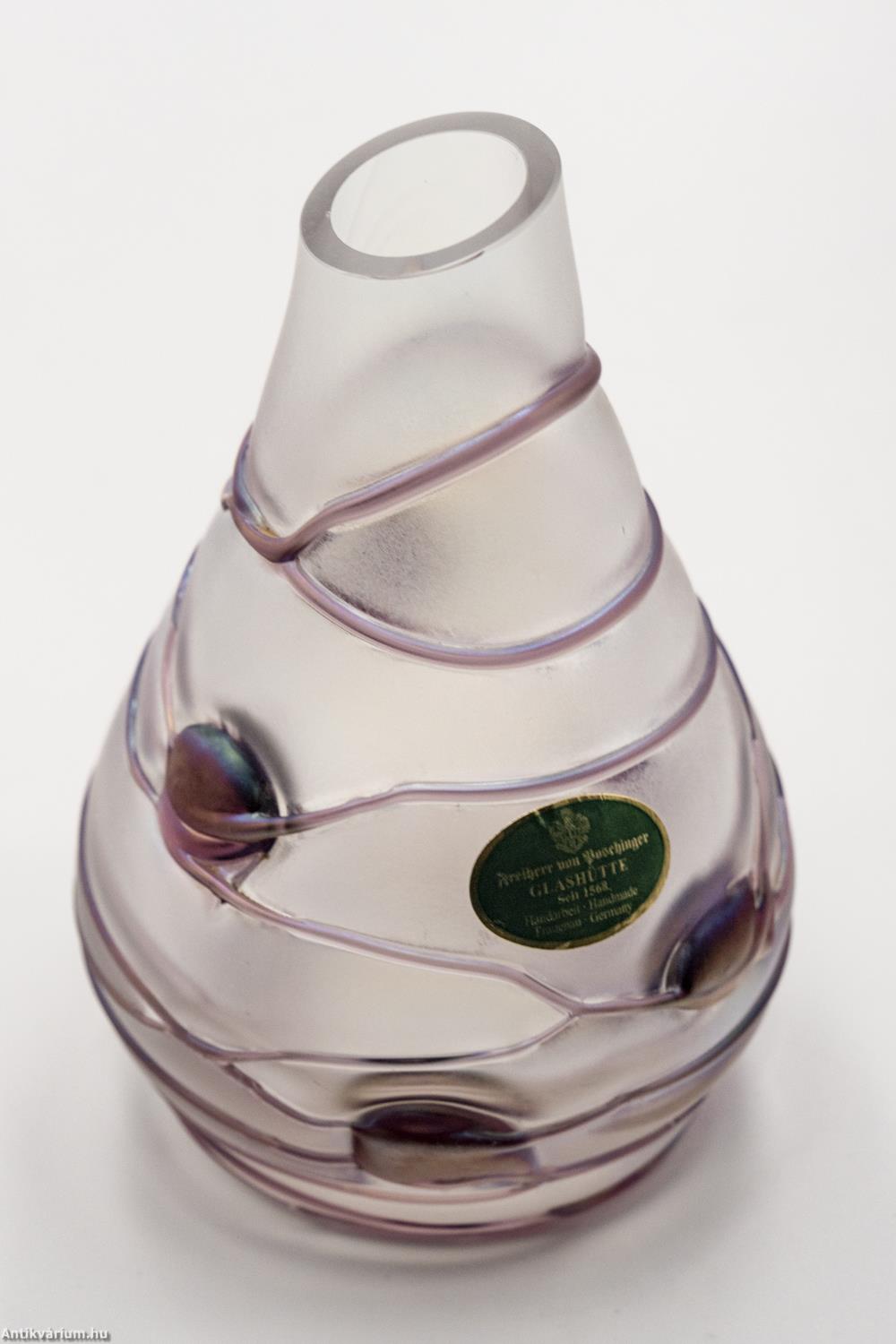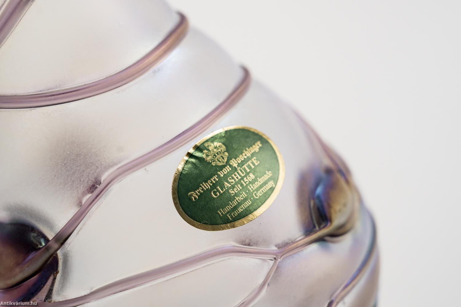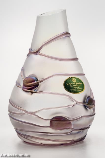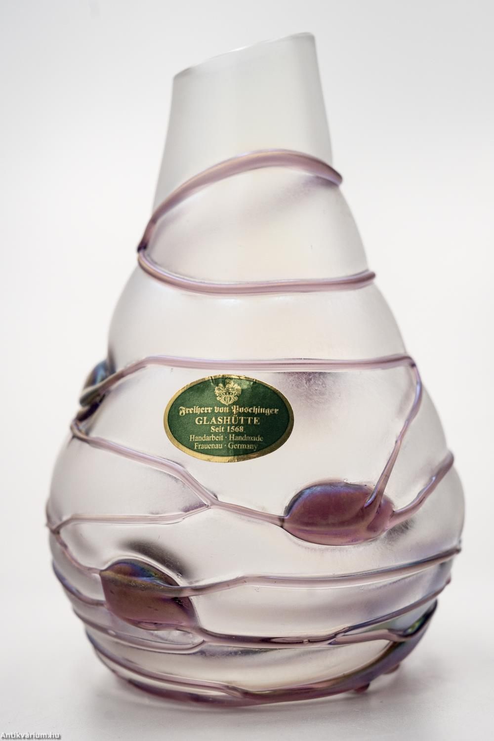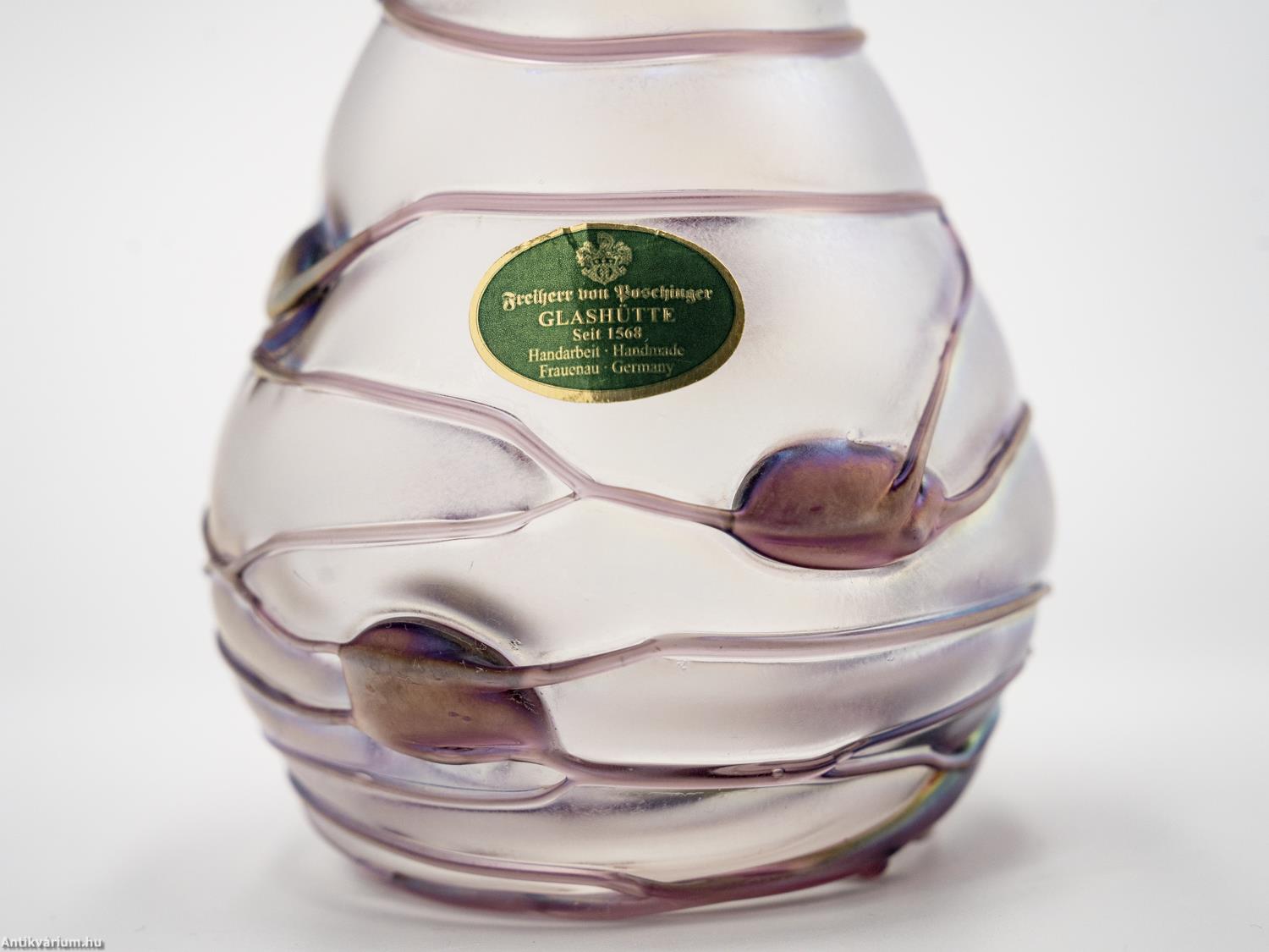 Hibátlan állapotú, Poschinger frauenaui üveggyárából származó jelzett szecessziós stílusú üveg váza a 20. század közepéből. Fújt és kézzel formázott, felülete matt hatású. Irizált rétegét a teljes felületén körbefuttatott lila színű olvadt üvegszálak - és kerek minta díszíti. Az üveg váza felületén gyártói etikett látható: "Freiherr von Poschinger Glasshütte seit 1568 Handarbeit Frauenau Germany" felirattal, talpának szélén beleégetett koronás "p" betű - gyári szignó látható. Finom pasztell harmónia és izgalmas fényjáték együttes hatása teszi különlegessé. Igényes gyűjteményes darab.