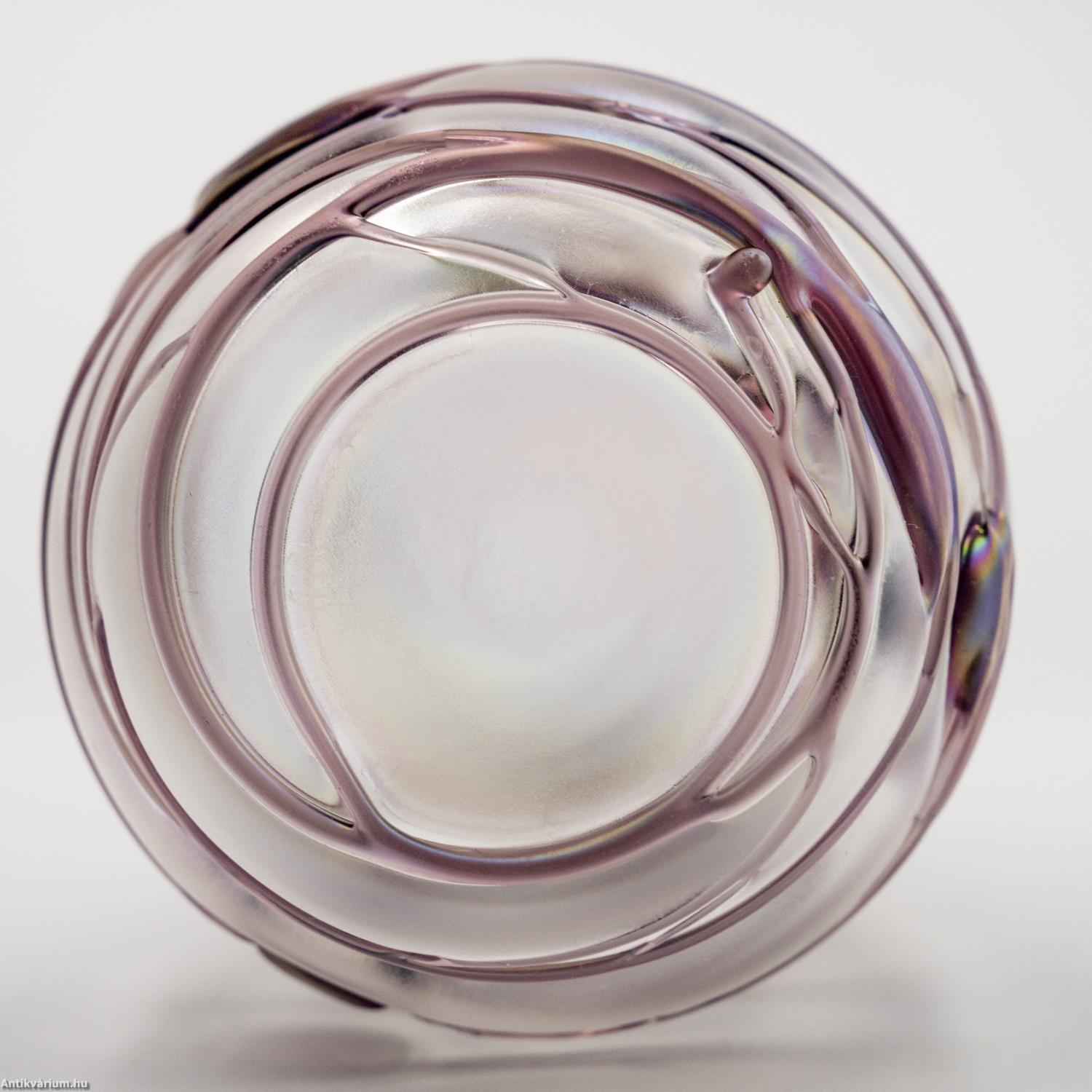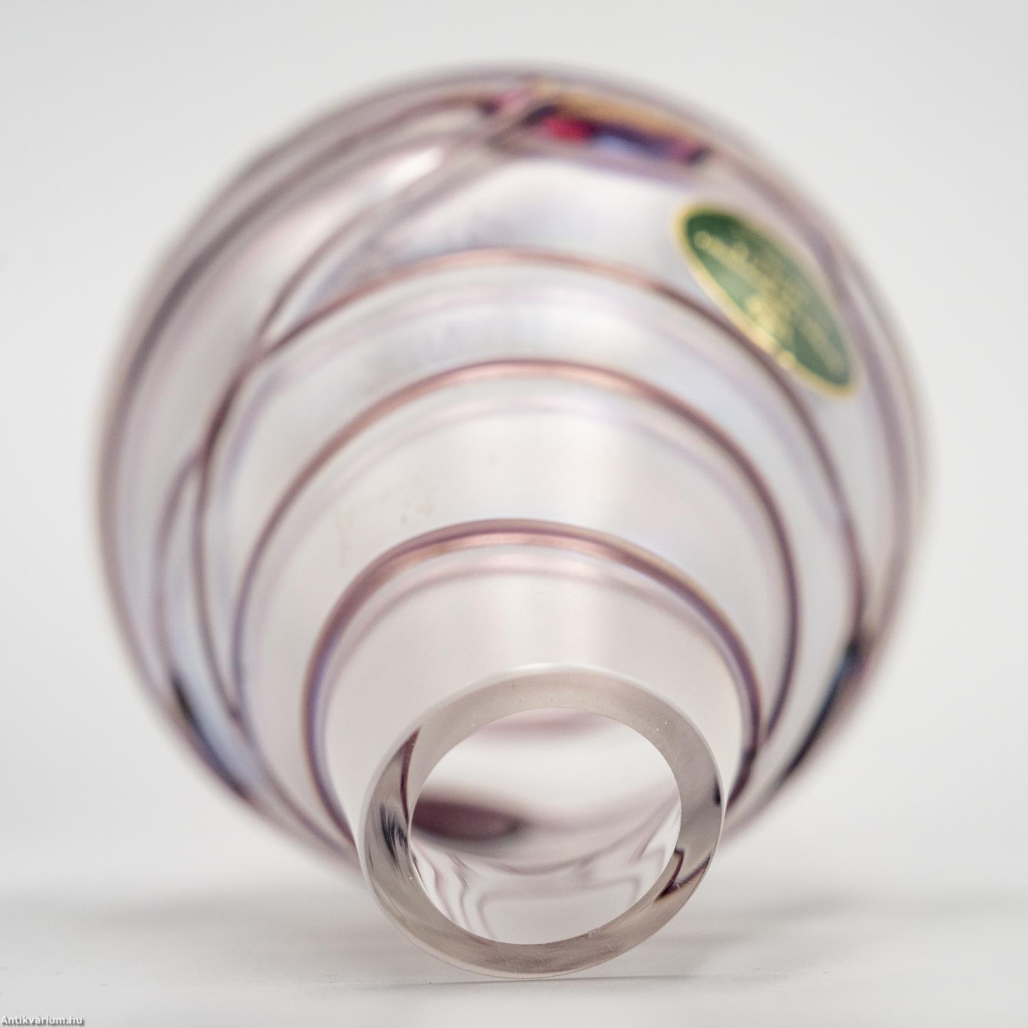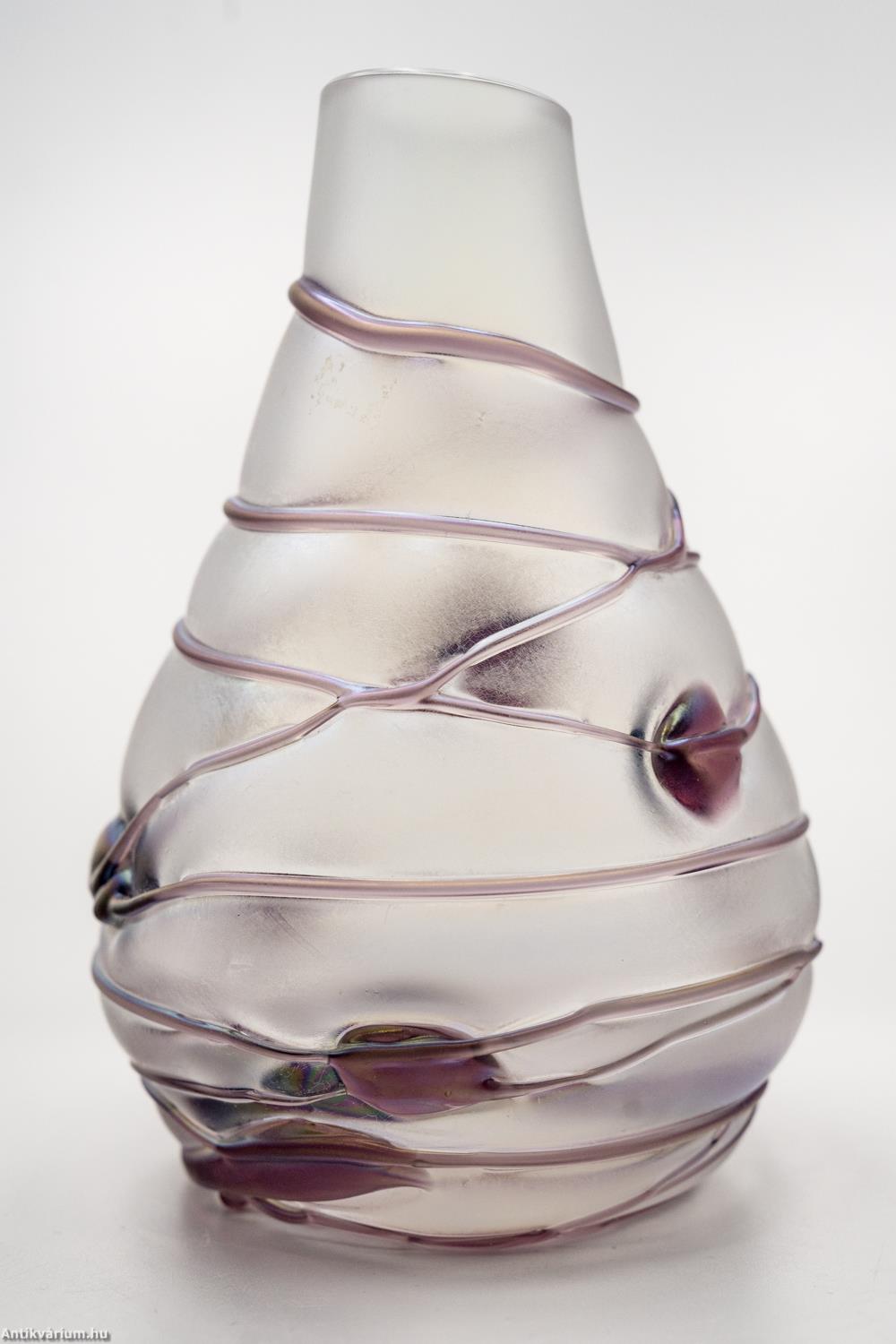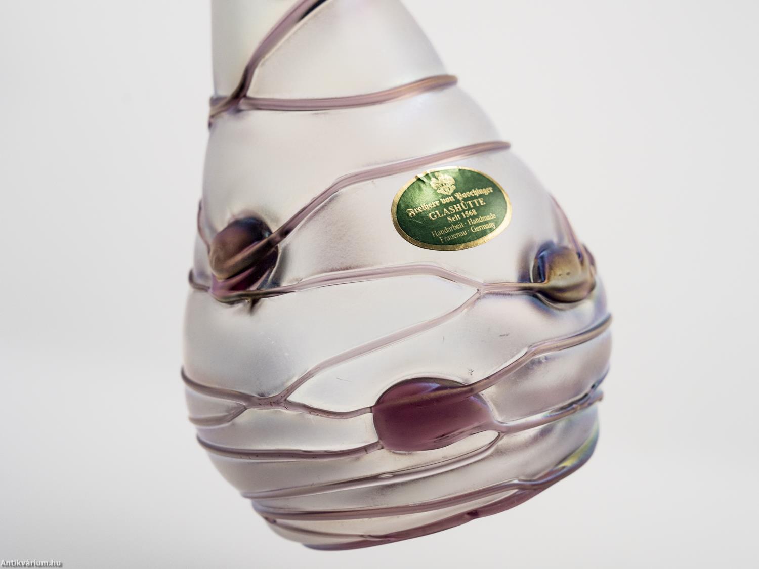 Hibátlan állapotú, Poschinger frauenaui üveggyárából származó jelzett szecessziós stílusú üveg váza a 20. század közepéből. Fújt és kézzel formázott, felülete matt hatású. Irizált rétegét a teljes felületén körbefuttatott lila színű olvadt üvegszálak - és kerek minta díszíti. Az üveg váza felületén gyártói etikett látható: "Freiherr von Poschinger Glasshütte seit 1568 Handarbeit Frauenau Germany" felirattal, talpának szélén beleégetett koronás "p" betű - gyári szignó látható. Finom pasztell harmónia és izgalmas fényjáték együttes hatása teszi különlegessé. Igényes gyűjteményes darab.