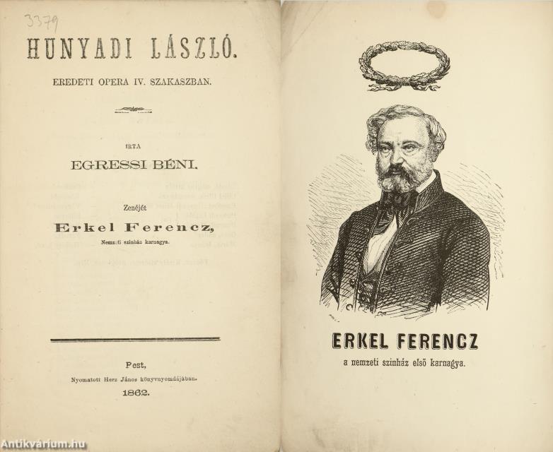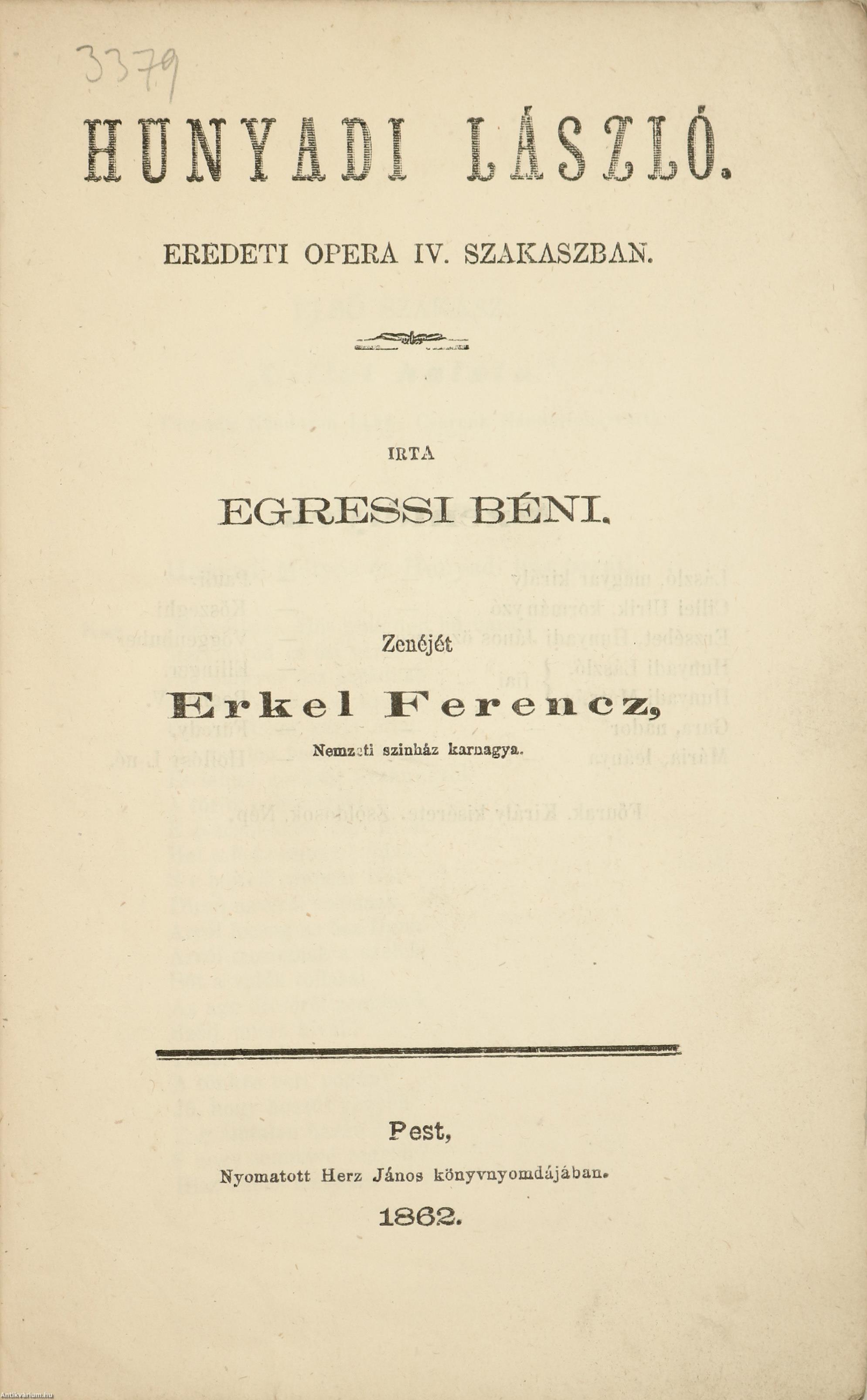Hunyadi László. Eredeti opera IV. szakaszban. Írta: Egressi Béni. Zenéjét: Erkel Ferencz a Nemzeti Színház karnagya.