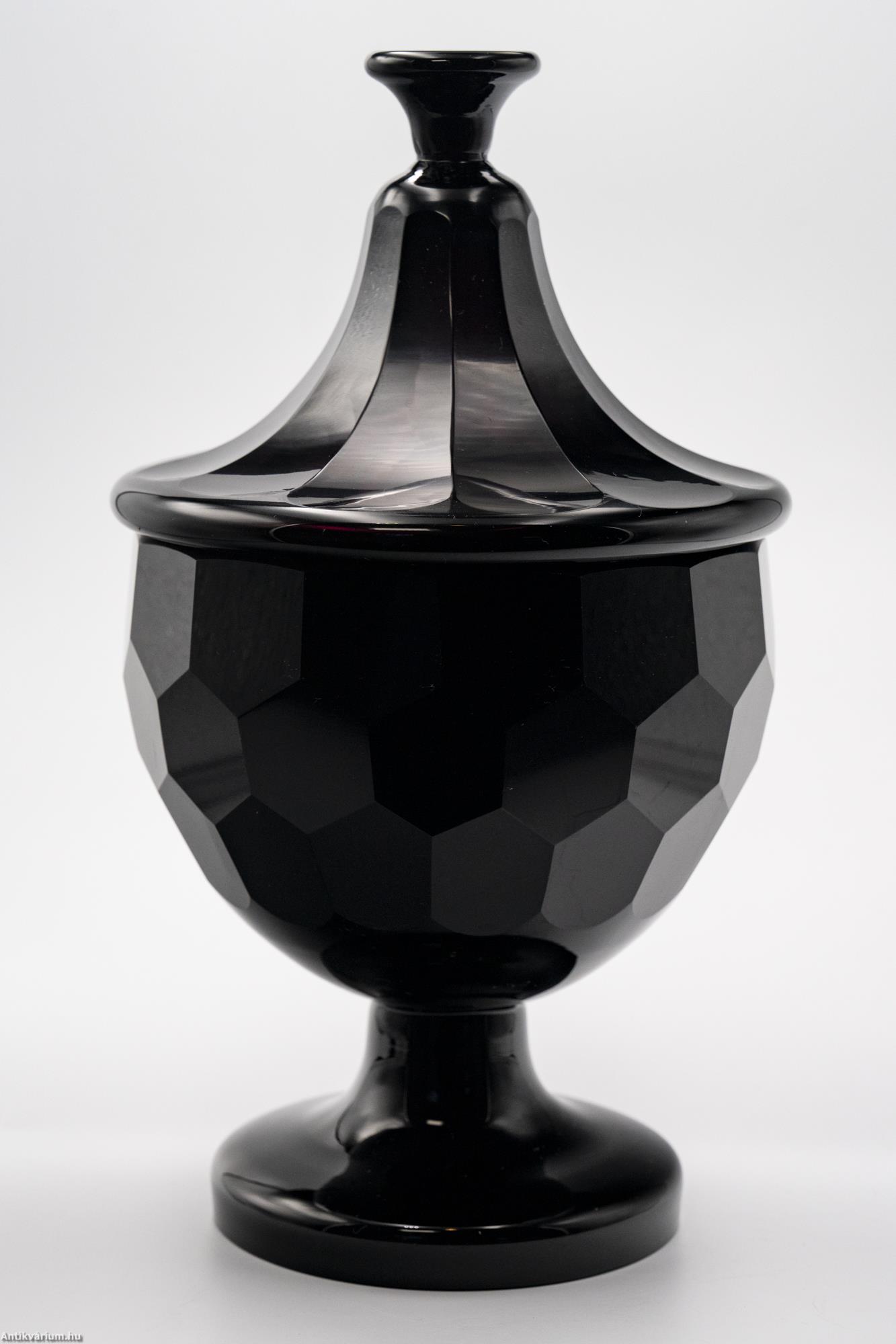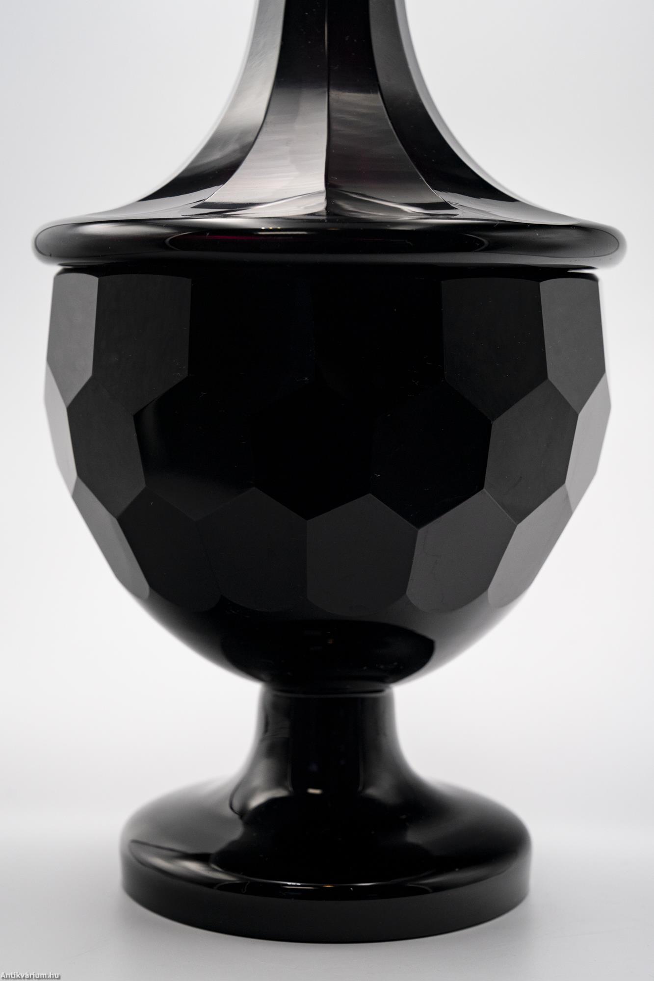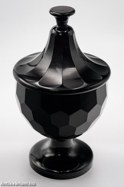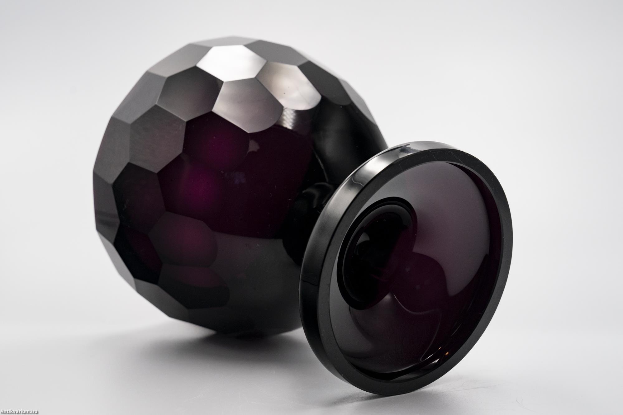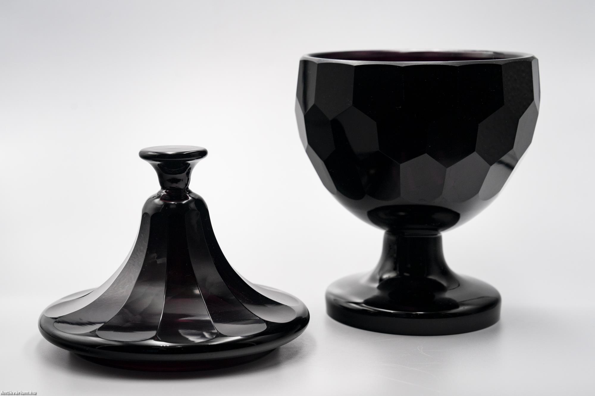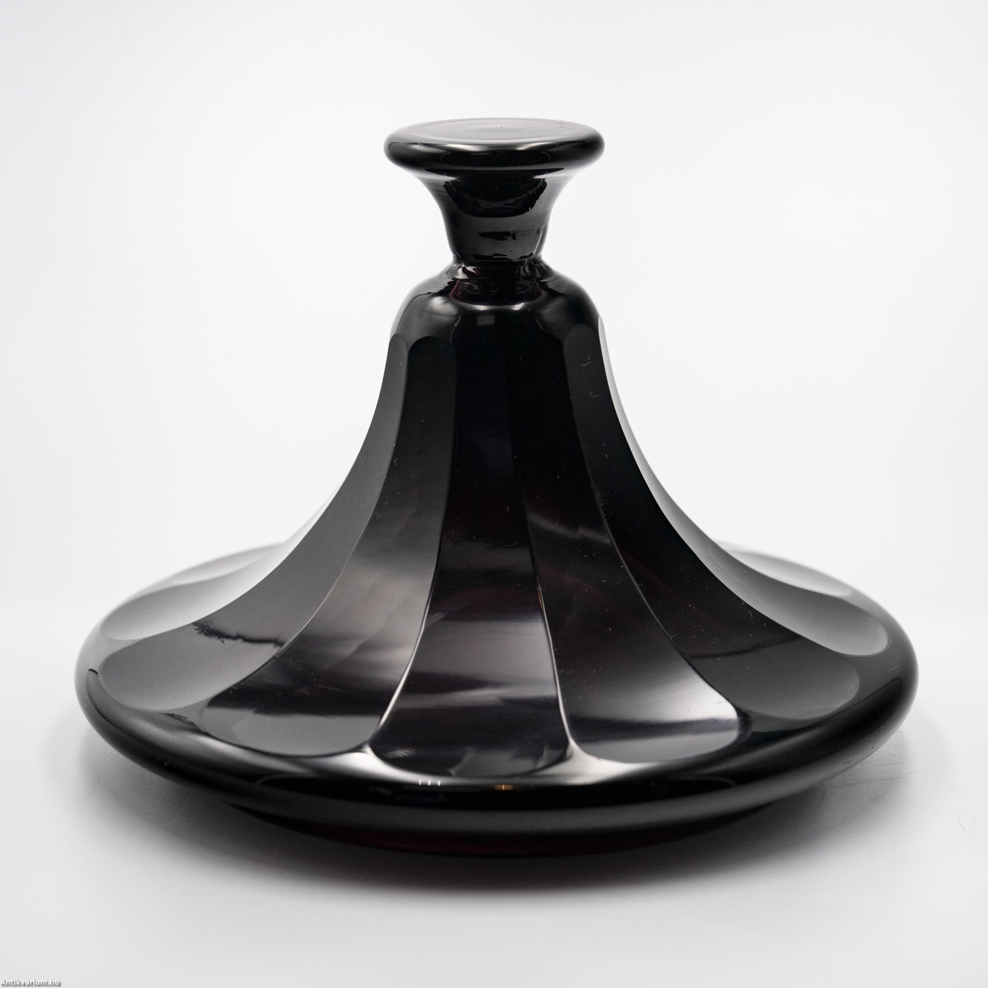 Hibátlan állapotú, fújt és kézzel formázott, valamint kézzel csiszolt, nagy méretű art deco Moser fedeles üveg kehely Josef Hoffmann tervei alapján. Vastag falú, nagy súlyú, ametiszt üvegből készült művészi üveg kehely. Csiszolt fedele függőlegesen bordázott, hatszögű mintázatú oldalát sík csiszolt laptagolás díszíti, amely a geometriai formák alkalmazására és annak különböző méretű megjelenítésére épül. Üreges talprésze lapracsiszolt. Az üveg kehely az uralkodó art deco esztétika jegyeit magán viselő elegáns díszüveg képviselője, kihangsúlyozva az egyenes, leegyszerűsített vonalvezetést és modern formát, valamint az erős, tiszta színvilág használatát. Mindezeket tökéletes kivitelezésben. A kor stílusát és a Moser csiszolás egyedi jellemzőit megjelenítő üveg kehely az 1920-as években készült. A Moser üveggyárban az 1920-as években rendkívül gyümölcsöző együttműködés kezdődött Josef Hoffmann tervezővel (1870–1956) aki alapító tagja volt a Bécsi Szecessziónak, a merev történelmi előzményektől elszakadni kívánó művészekből és tervezőkből álló szervezetnek, majd később a Wiener Werkstätte-nek, amely a mindennapi használati tárgyak, köztük üvegek, kerámiák, textilek és bútorok kézműves munkáinak előállításával foglalkozott. Hoffman ebben az időszakban a nyugati iparművészet meghatározó személyisége volt.