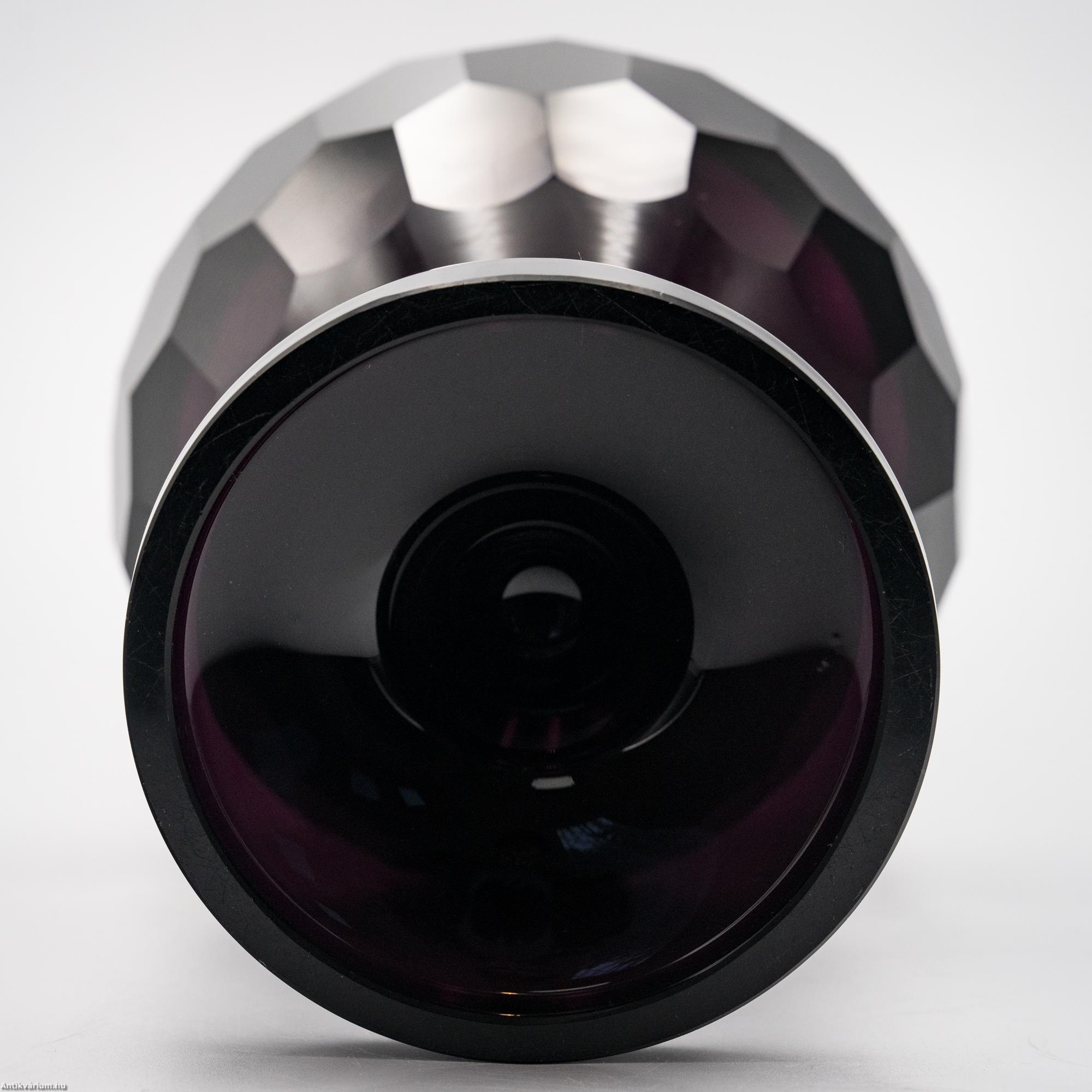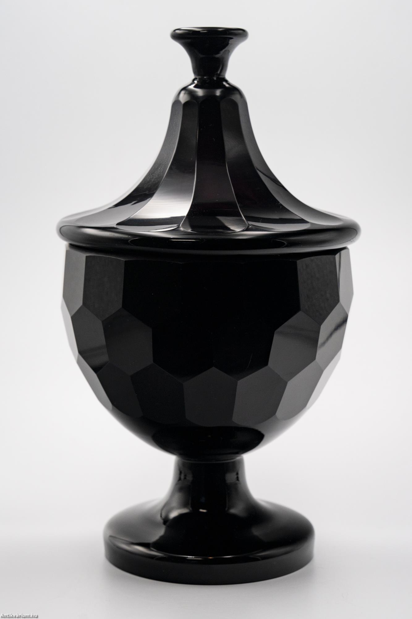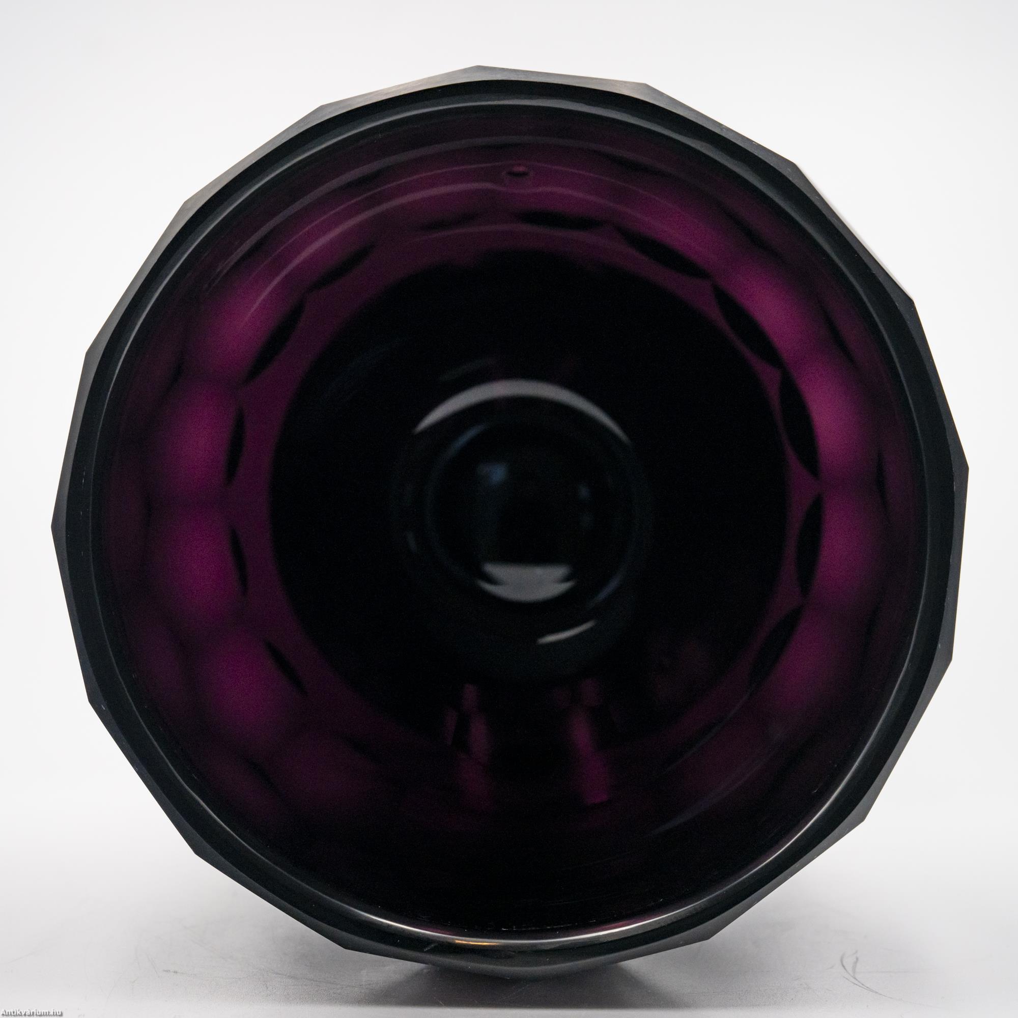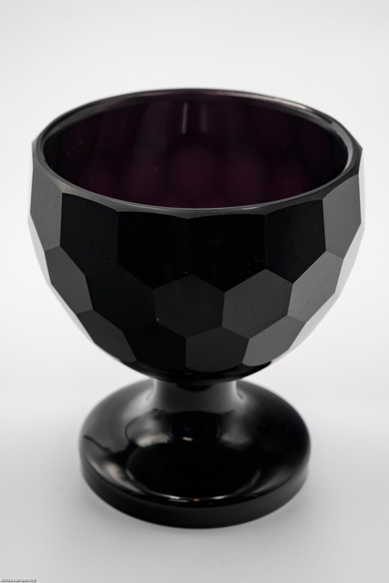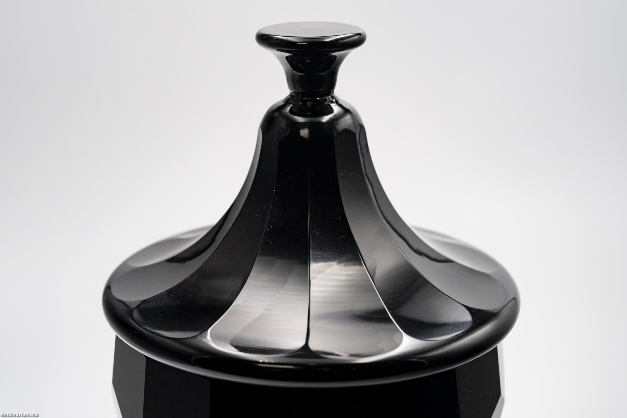 Hibátlan állapotú, fújt és kézzel formázott, valamint kézzel csiszolt, nagy méretű art deco Moser fedeles üveg kehely Josef Hoffmann tervei alapján. Vastag falú, nagy súlyú, ametiszt üvegből készült művészi üveg kehely. Csiszolt fedele függőlegesen bordázott, hatszögű mintázatú oldalát sík csiszolt laptagolás díszíti, amely a geometriai formák alkalmazására és annak különböző méretű megjelenítésére épül. Üreges talprésze lapracsiszolt. Az üveg kehely az uralkodó art deco esztétika jegyeit magán viselő elegáns díszüveg képviselője, kihangsúlyozva az egyenes, leegyszerűsített vonalvezetést és modern formát, valamint az erős, tiszta színvilág használatát. Mindezeket tökéletes kivitelezésben. A kor stílusát és a Moser csiszolás egyedi jellemzőit megjelenítő üveg kehely az 1920-as években készült. A Moser üveggyárban az 1920-as években rendkívül gyümölcsöző együttműködés kezdődött Josef Hoffmann tervezővel (1870–1956) aki alapító tagja volt a Bécsi Szecessziónak, a merev történelmi előzményektől elszakadni kívánó művészekből és tervezőkből álló szervezetnek, majd később a Wiener Werkstätte-nek, amely a mindennapi használati tárgyak, köztük üvegek, kerámiák, textilek és bútorok kézműves munkáinak előállításával foglalkozott. Hoffman ebben az időszakban a nyugati iparművészet meghatározó személyisége volt.
