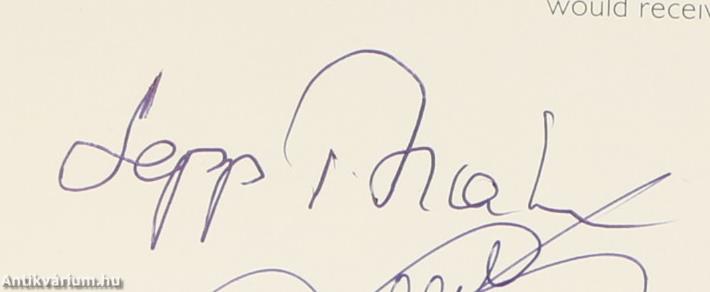 Joseph "Sepp" Blatter (1936-) svájci sportdiplomata, 1998-2015-ig a FIFA elnöke;Michel Platini (1955-) francia labdarúgó, edző, sportdiplomata, az 1984-ben Európa-bajnoki címet szerző francia válogatott gólkirálya, 2007-2015-ig az UEFA elnöke;Jesper Olsen (1961-) dán válogatott labdarúgó, edző, többek közt az Ajax és a Manchester United korábbi játékosa;valamint további egy ismeretlen személy tollal beírt aláírása látható.