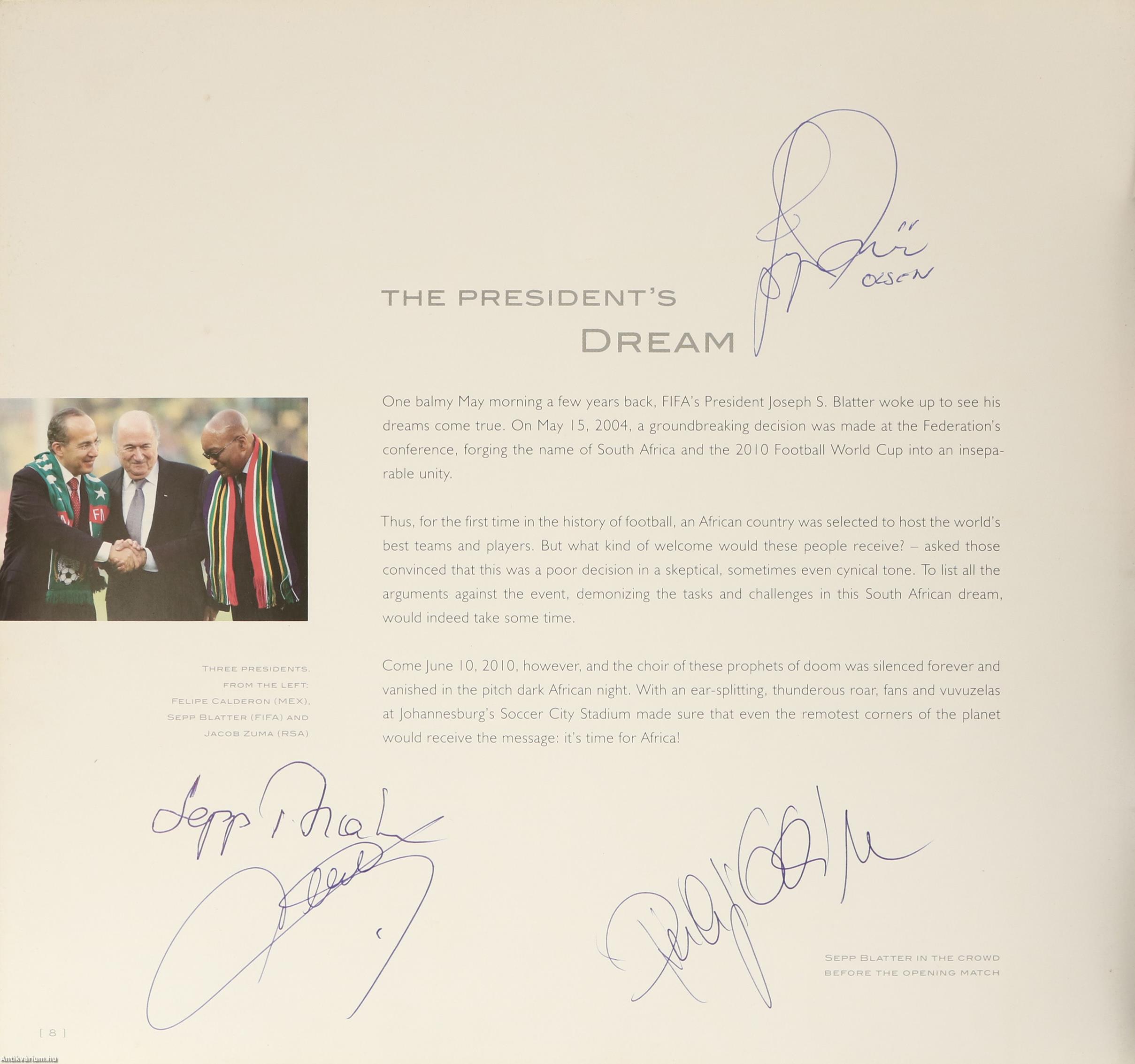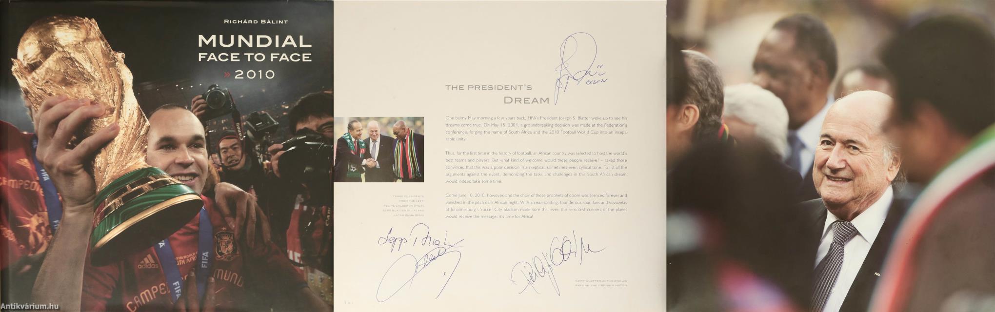 Joseph "Sepp" Blatter, Michel Platini, Jesper Olsen és további egy személy által aláírt példány. Mundial face to face 2010. / Világbajnokság szemtől szemben 2010. Írta és fotózta: Bálint Richárd.