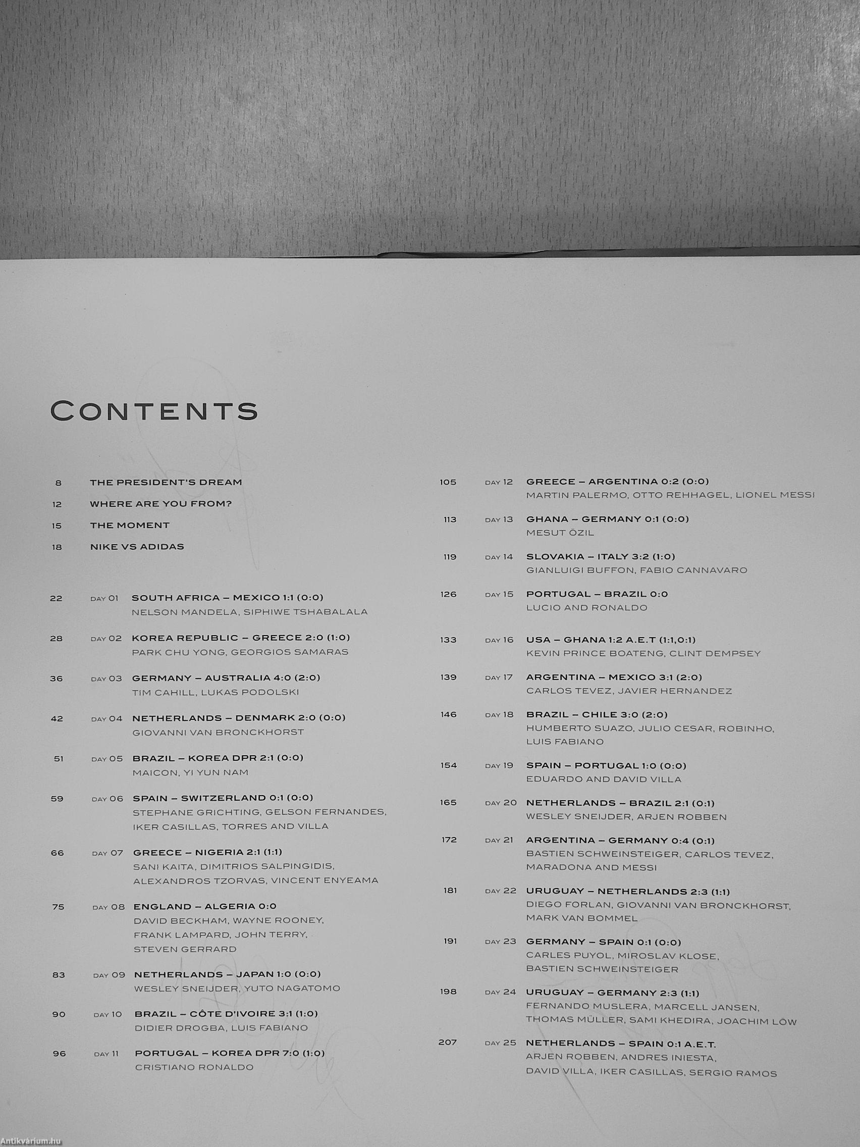 A 2010-es dél-afrikai labdarúgó-világbajnokság résztvevőit és emlékezetes pillanatait megörökítő, színes fotókkal gazdagon illusztrált fotóalbum. Angol nyelvű képaláírásokkal és szövegrészekkel.