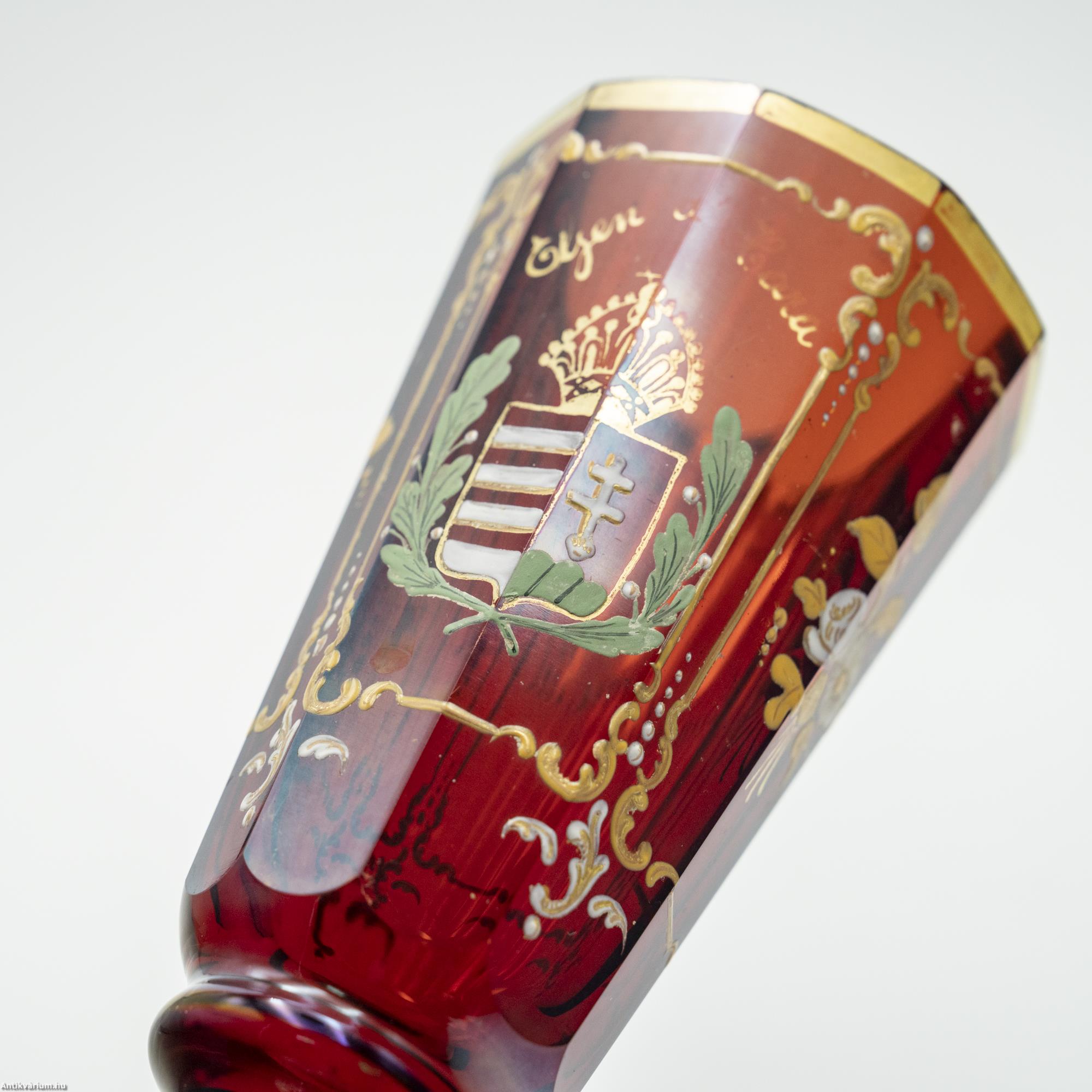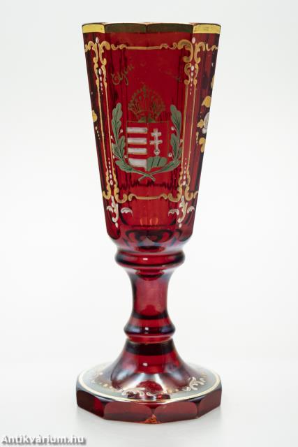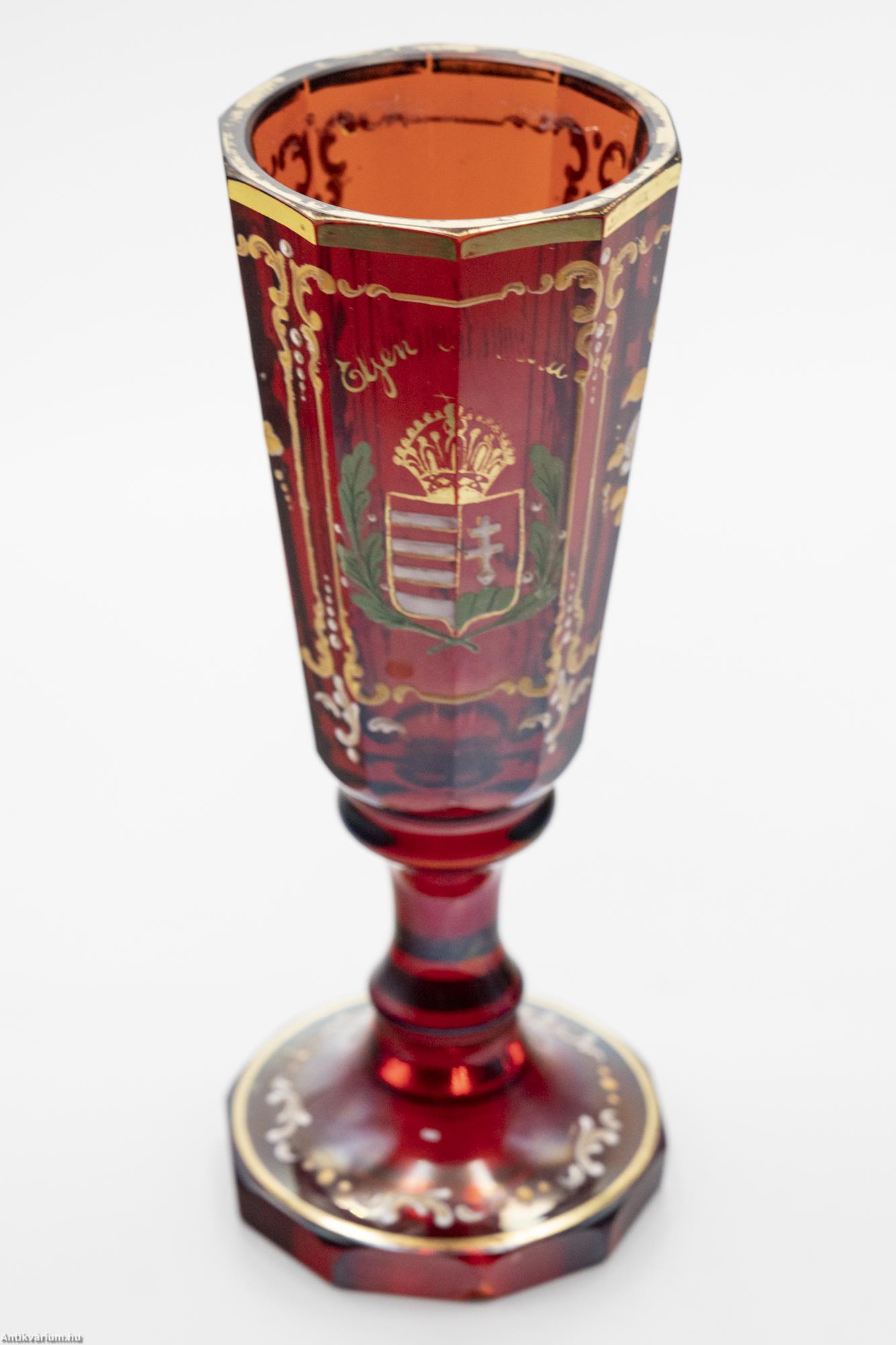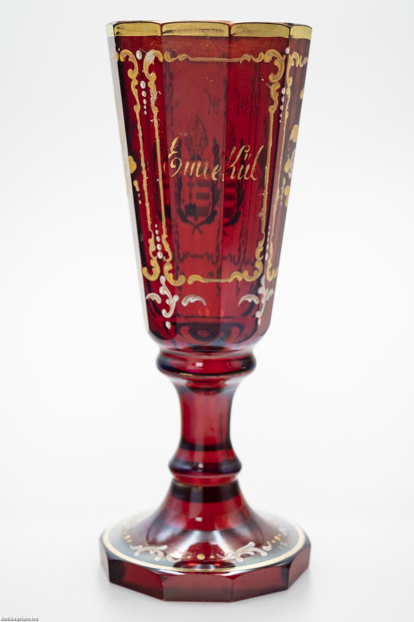 Fújt és kézzel formázott, csiszolt bordó biedermeier talpas üveg emlék pohár a 19. század közepéből. Formai megjelenését a talp és kehelyrészen is megjelenő kézzel festett arany színű részletgazdag festés teszi igazán korra jellemző dísztárggyá, amelyek a biedermeier tárgyak látványos díszei voltak. A tízosztásos, lapra csiszolt felületen megjelenő virágmotívum mellett a pohár oldalát aranyfestéses keretbe foglalt írás díszíti : "Emlékül" felirattal. Magyar vonatkozását a címer és a korona megjelenítése adja. Pereme kontúros aranyfestéssel díszített. Talpa lapra csiszolt, amelynek alul lévő külső részén korából adódó apró sérülés látható. Hazai és történeti értéke miatt különösen becses számunkra ez a magyar üveg dísztárgy.
