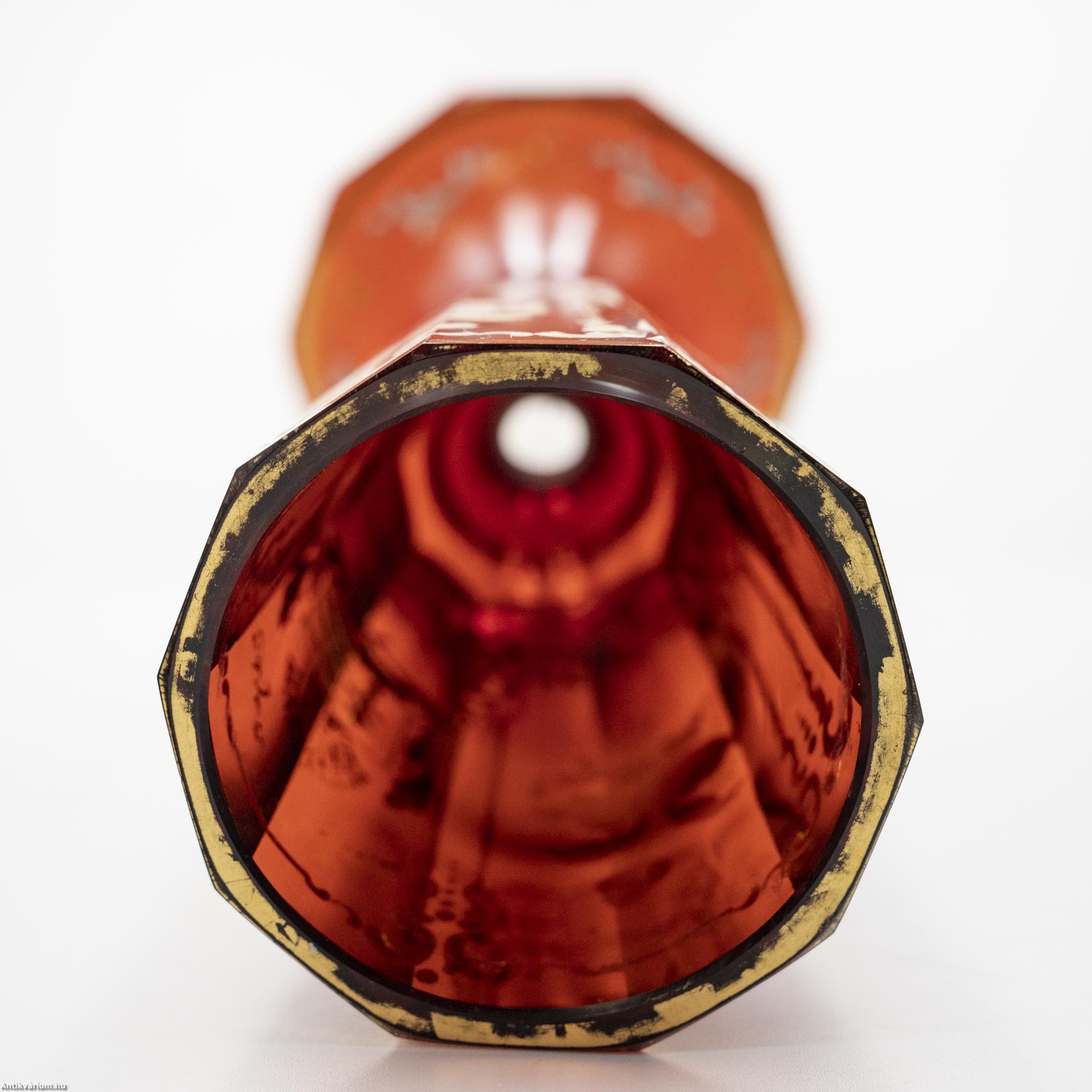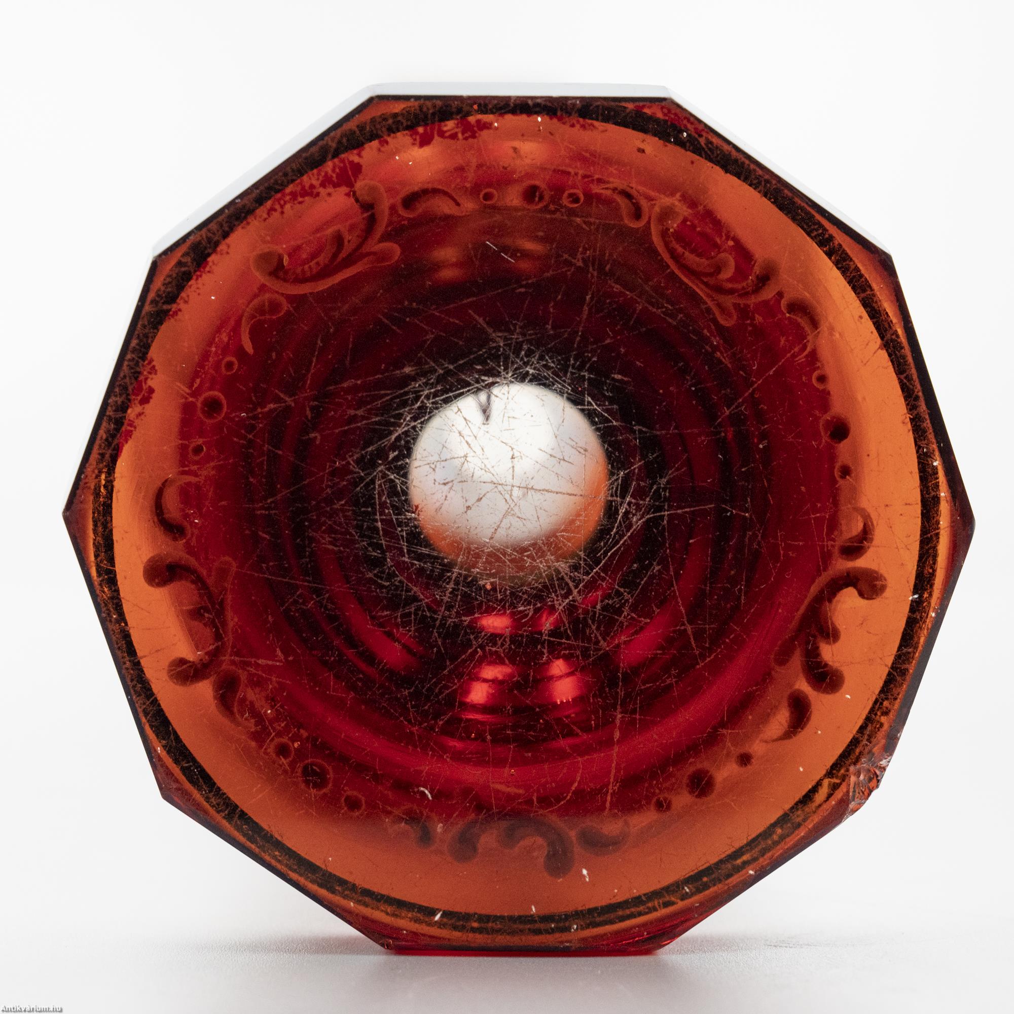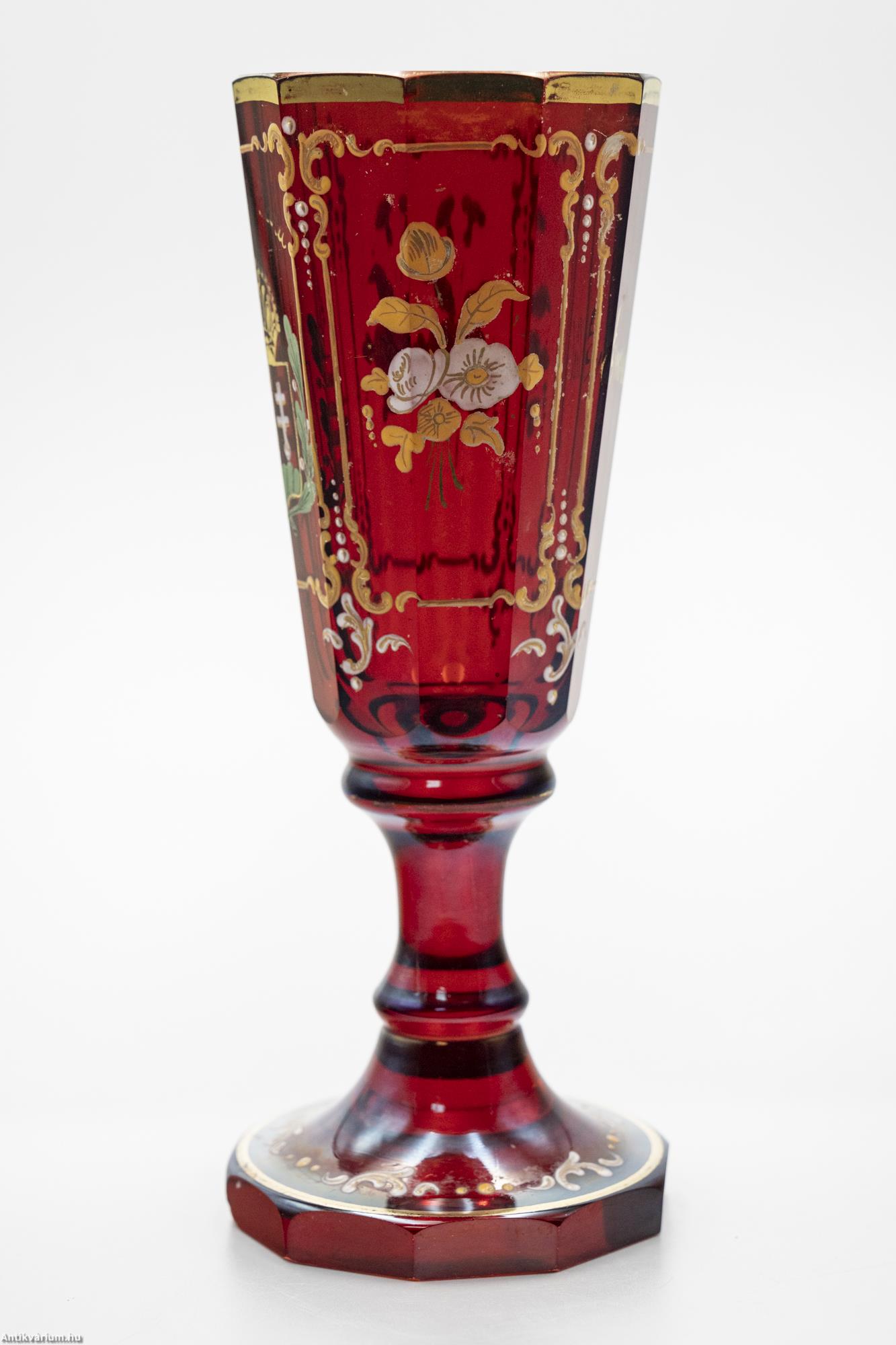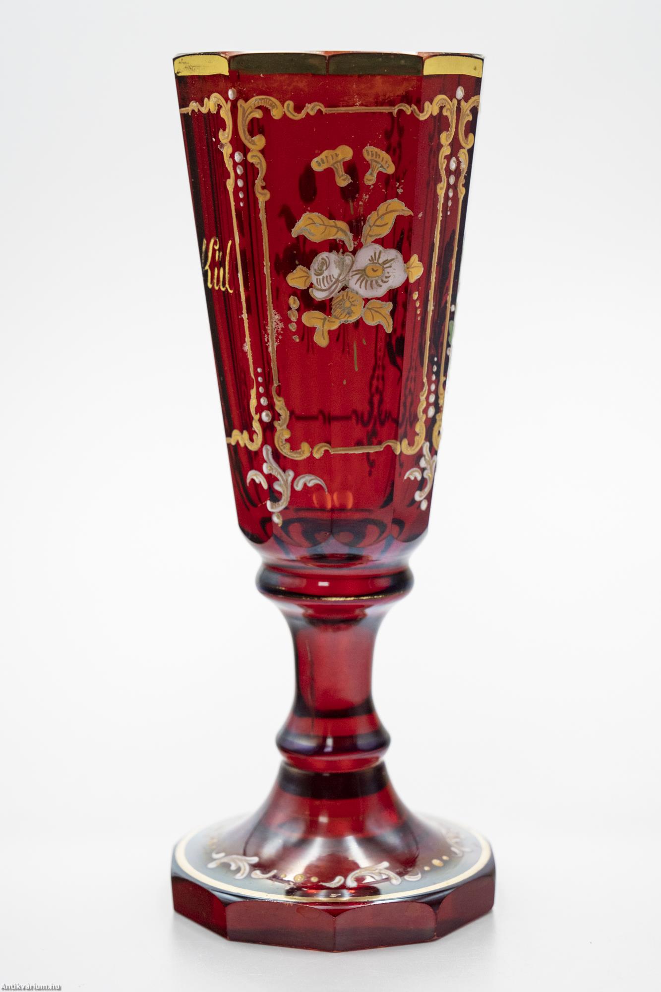 Fújt és kézzel formázott, csiszolt bordó biedermeier talpas üveg emlék pohár a 19. század közepéből. Formai megjelenését a talp és kehelyrészen is megjelenő kézzel festett arany színű részletgazdag festés teszi igazán korra jellemző dísztárggyá, amelyek a biedermeier tárgyak látványos díszei voltak. A tízosztásos, lapra csiszolt felületen megjelenő virágmotívum mellett a pohár oldalát aranyfestéses keretbe foglalt írás díszíti : "Emlékül" felirattal. Magyar vonatkozását a címer és a korona megjelenítése adja. Pereme kontúros aranyfestéssel díszített. Talpa lapra csiszolt, amelynek alul lévő külső részén korából adódó apró sérülés látható. Hazai és történeti értéke miatt különösen becses számunkra ez a magyar üveg dísztárgy.