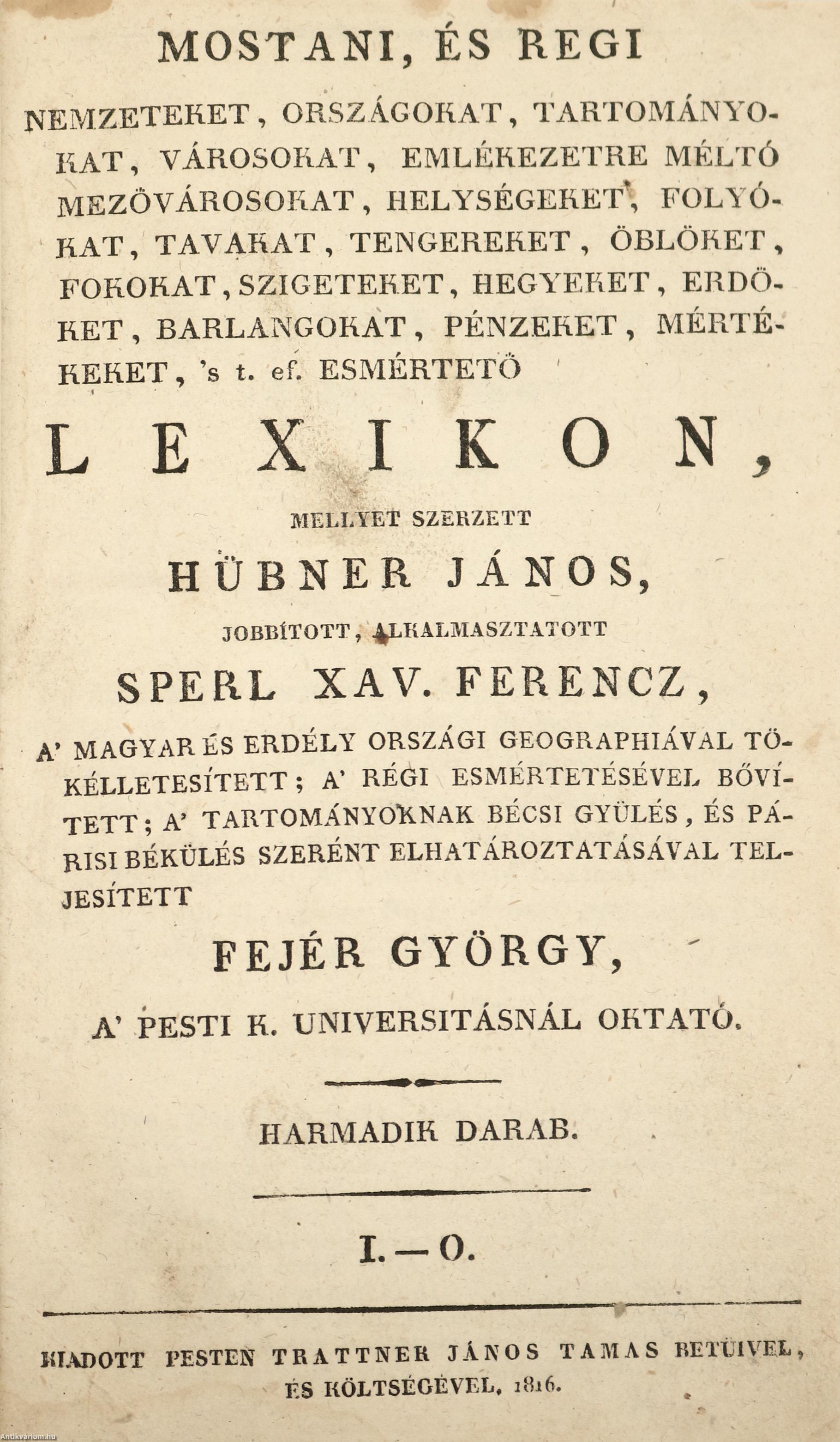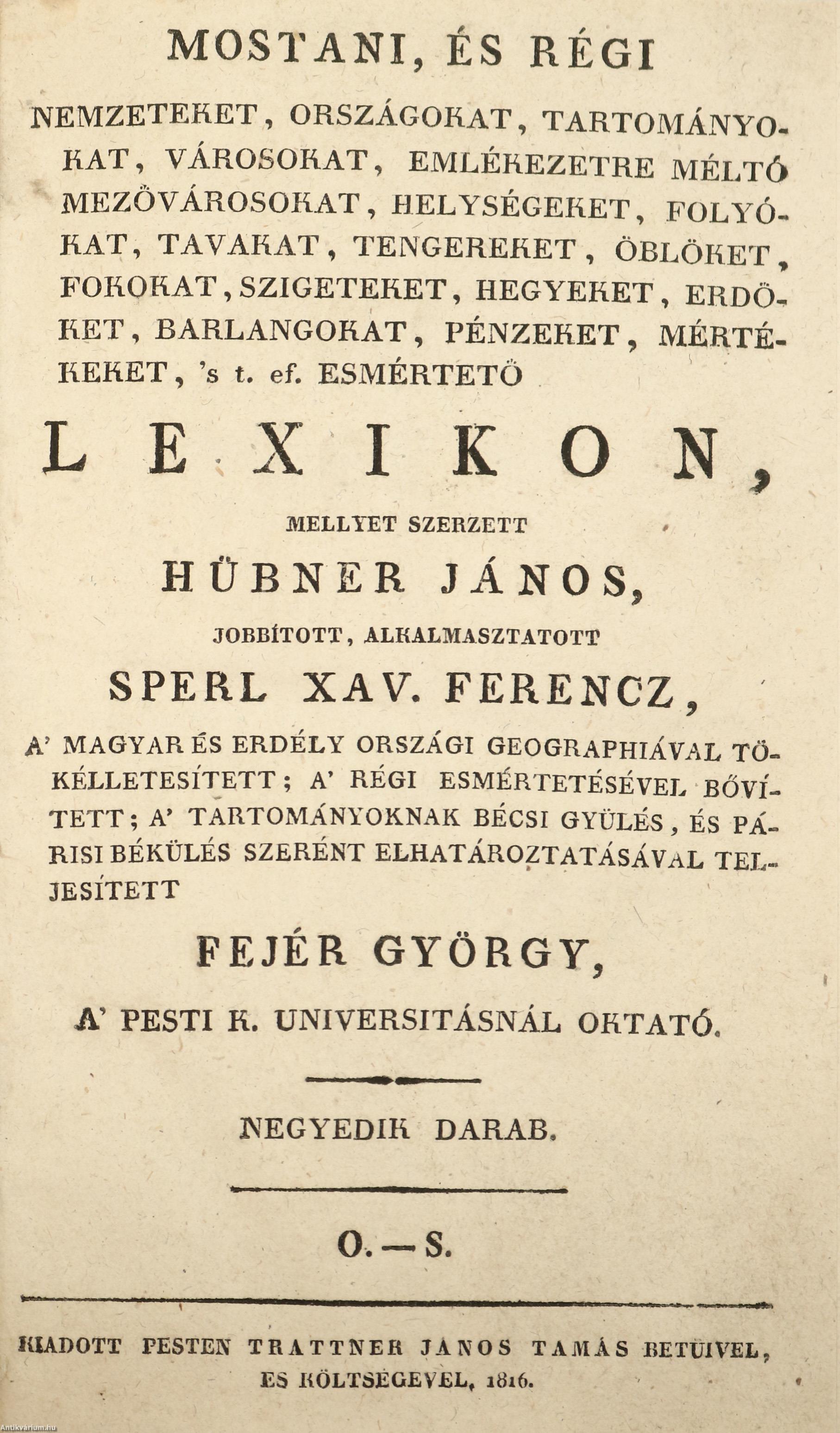 Első magyar nyelvű kiadás. Mostani és régi lexikon I-V. (egységes külön kötetekben) Mostani és régi nemzeteket, országokat, tartományokat, városokat, emlékezetre méltó mezővárosokat, helységeket, folyókat, tavakat, tengereket, öblöket, fokokat, szigeteket, hegyeket, erdőket, barlangokat, pénzeket, mértékeket, 's t. e. f. esmértető lexikon, mellyet szerzett Hübner János, jobbított, alkalmasztatott Sperl Xav. Ferencz, a' Magyar és Erdély országi geographiával tökélletesített; a' régi esmértetésével bővített; 'a tartományoknak bécsi gyülés, és párisibékülés szerént elhatároztatásával tellestett Fejér György, a' Pesti K. Univesitásnál oktató.