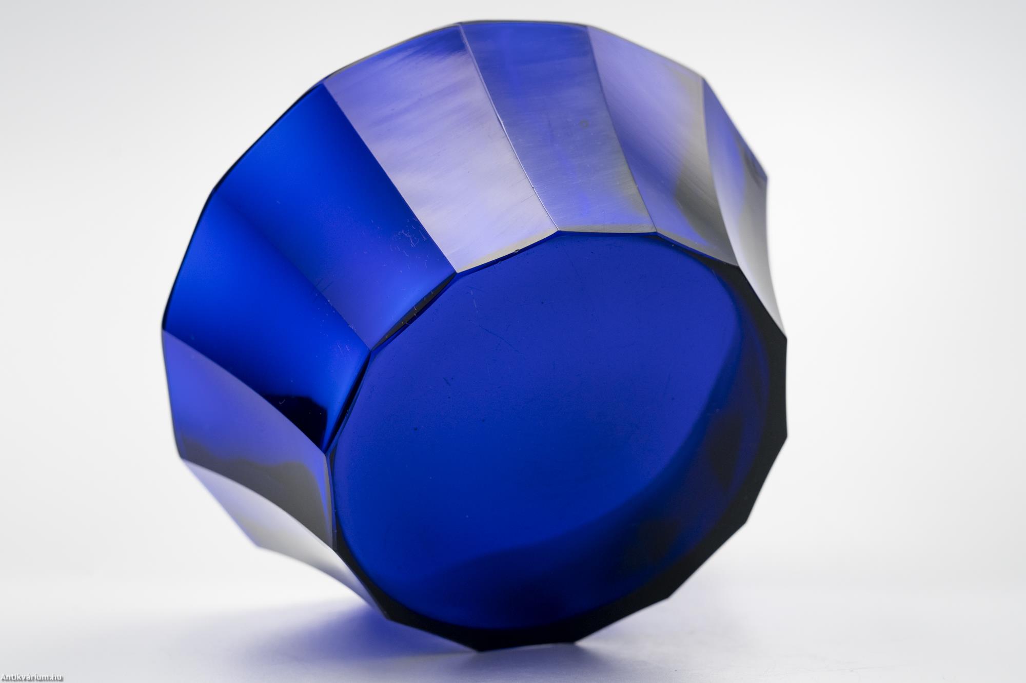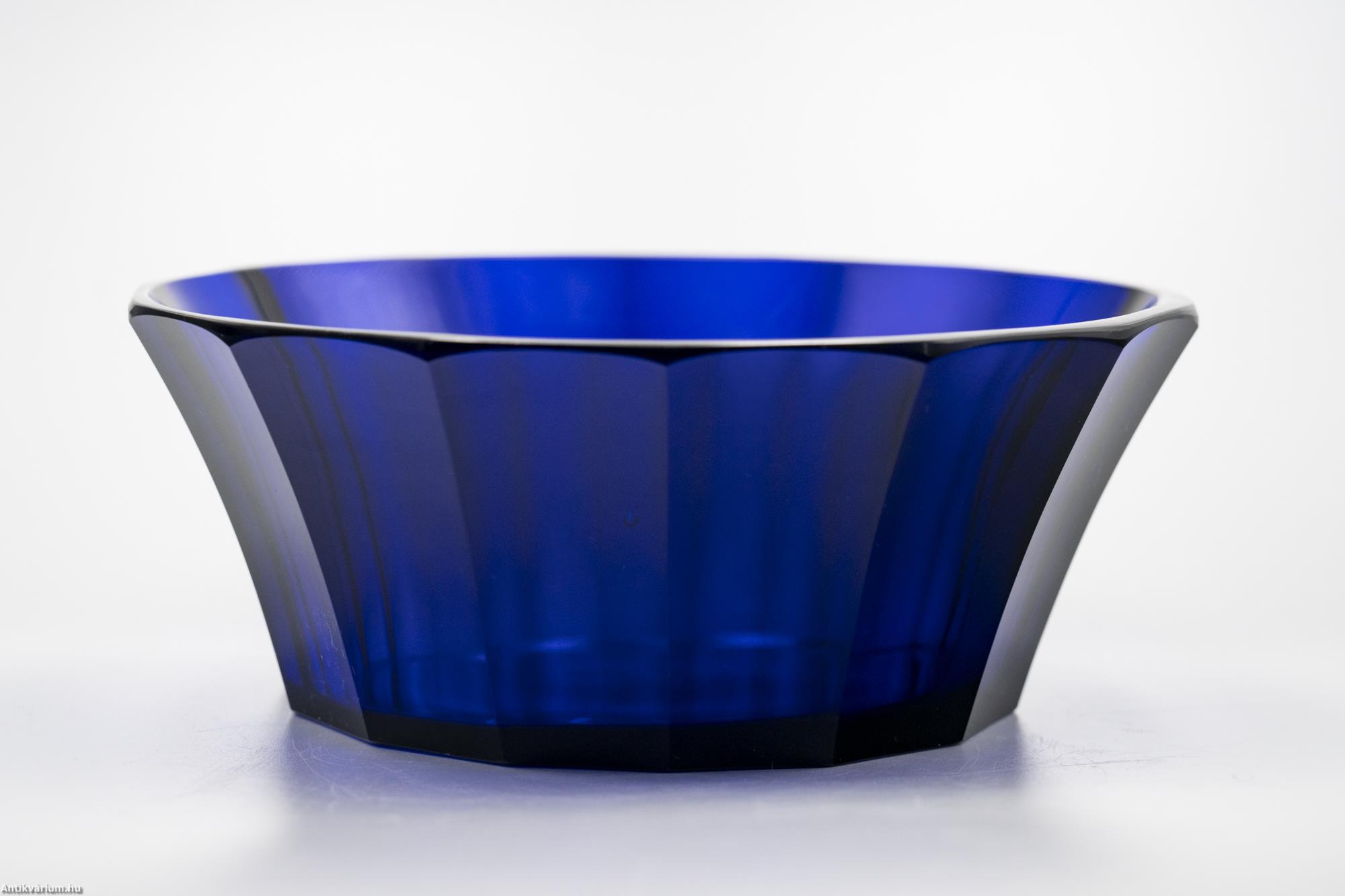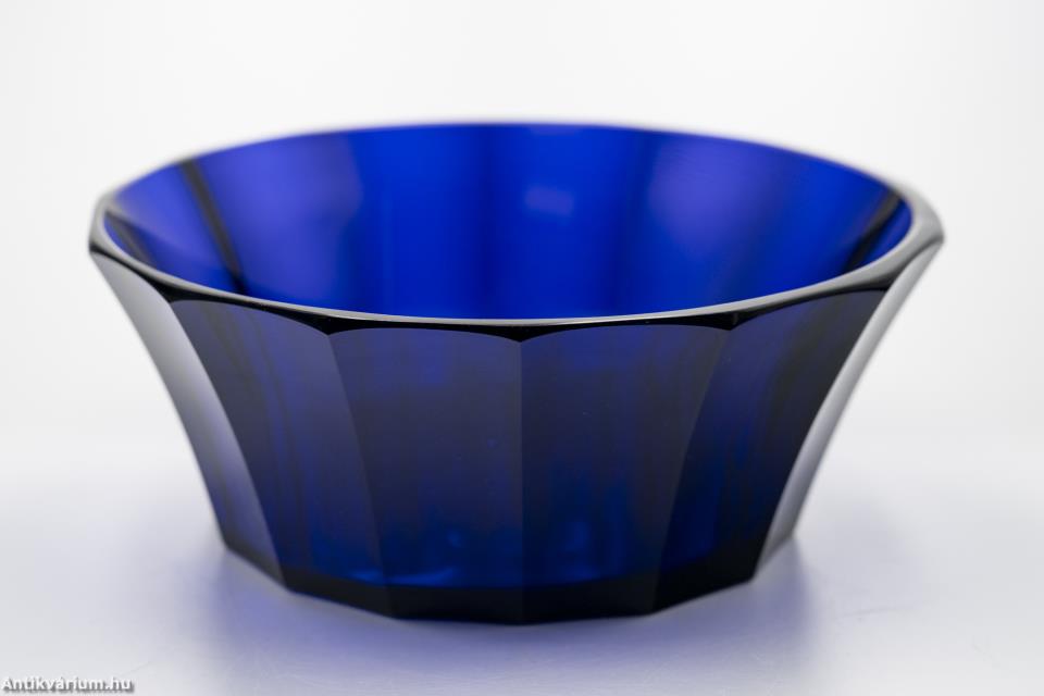 Hibátlan állapotú, fújt és kézzel formázott valamint kézzel csiszolt art deco Moser üveg tál Josef Hoffmann tervei alapján. Kobaltkék színű üvegből készült művészi üveg tál. Függőlegesen bordázott oldalát sík csiszolt laptagolás díszíti, amely a legegyszerűbb geometriai formák alkalmazására: a négyszögre és annak különböző méretű megjelenítésére épül. Talpa lapra csiszolt. A kor stílusát és a Moser csiszolás egyedi jellemzőit megjelenítő üveg váza. A Moser üveggyárban az 1920-as években rendkívül gyümölcsöző együttműködés kezdődött Josef Hoffmann tervezővel (Pirnitz 1870 – 1956 Bécs, a Wiener Werkstatte társalapítója), amelynek során az uralkodó art deco esztétika jegyeit magán viselő elegáns üvegáruk készültek, kihangsúlyozva az egyenes, leegyszerűsített vonalvezetést és modern formát, valamint az erős, tiszta színvilág használatát. Mindezeket tökéletes kivitelezésben.