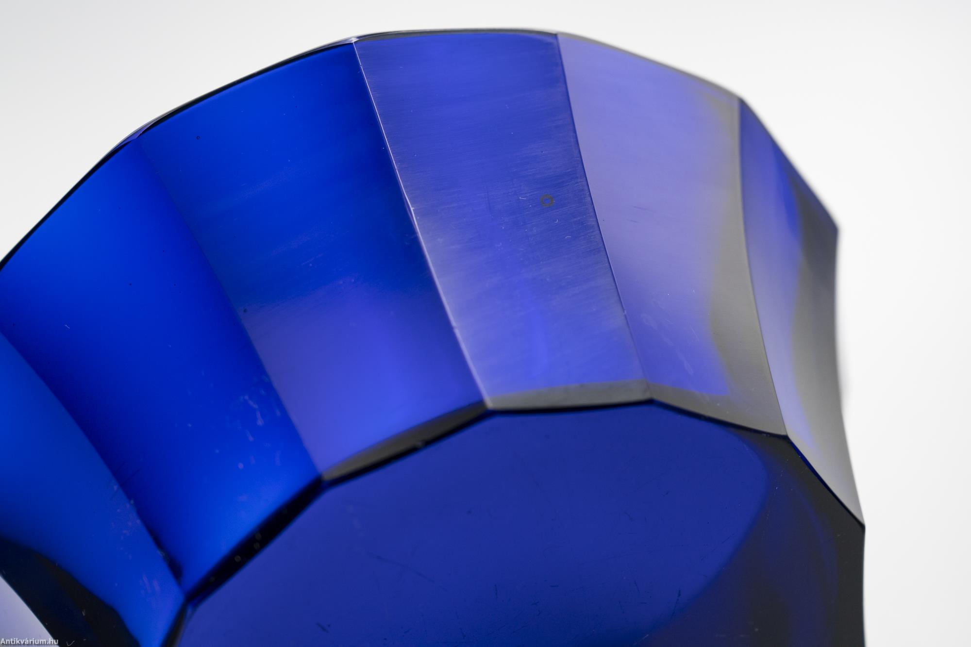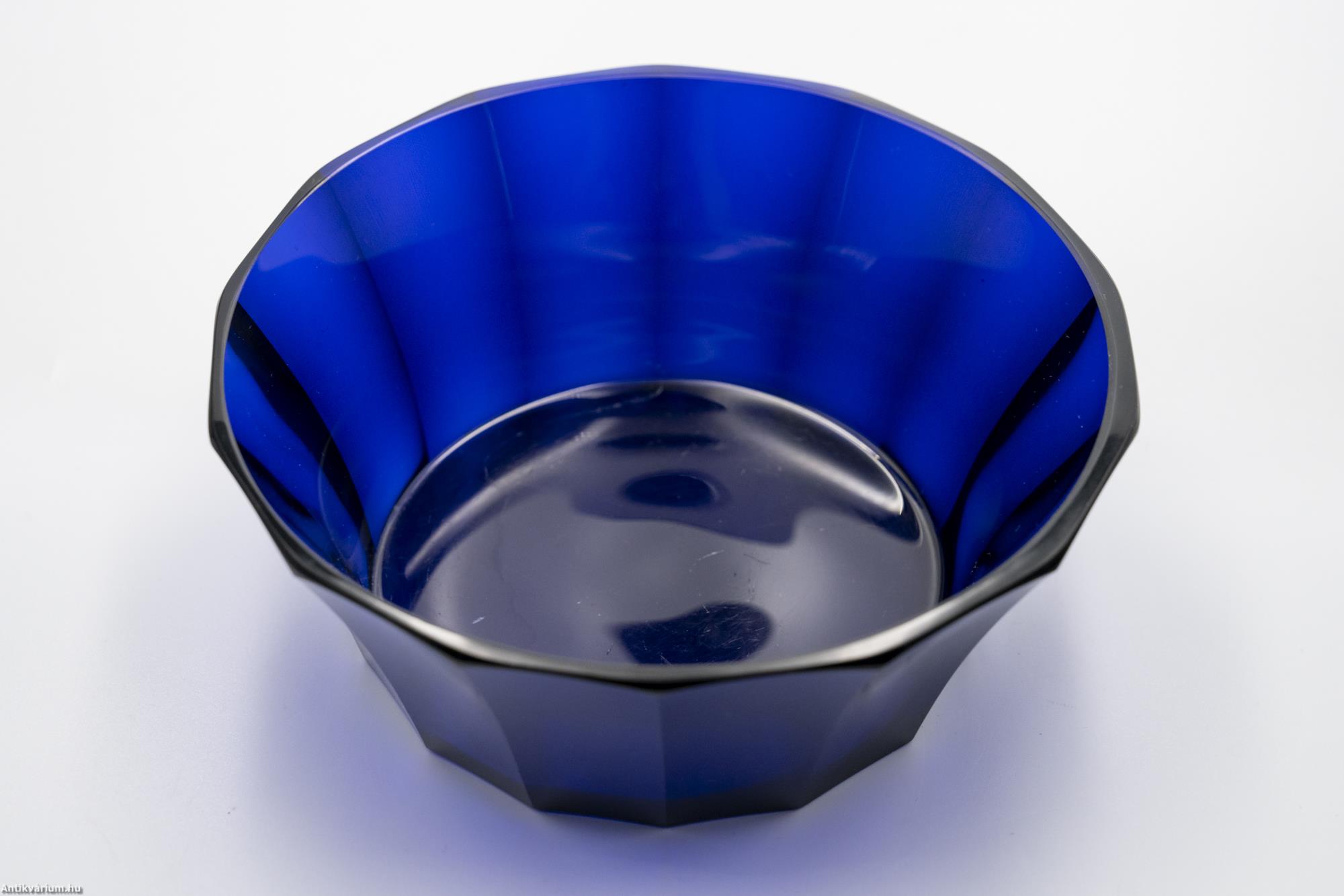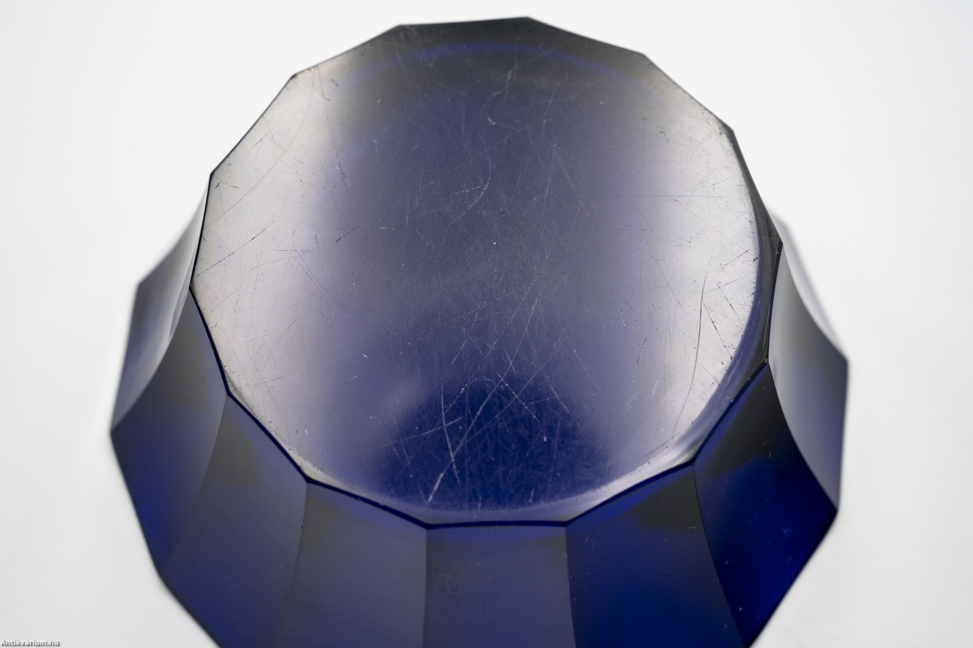 Hibátlan állapotú, fújt és kézzel formázott valamint kézzel csiszolt art deco Moser üveg tál Josef Hoffmann tervei alapján. Kobaltkék színű üvegből készült művészi üveg tál. Függőlegesen bordázott oldalát sík csiszolt laptagolás díszíti, amely a legegyszerűbb geometriai formák alkalmazására: a négyszögre és annak különböző méretű megjelenítésére épül. Talpa lapra csiszolt. A kor stílusát és a Moser csiszolás egyedi jellemzőit megjelenítő üveg váza. A Moser üveggyárban az 1920-as években rendkívül gyümölcsöző együttműködés kezdődött Josef Hoffmann tervezővel (Pirnitz 1870 – 1956 Bécs, a Wiener Werkstatte társalapítója), amelynek során az uralkodó art deco esztétika jegyeit magán viselő elegáns üvegáruk készültek, kihangsúlyozva az egyenes, leegyszerűsített vonalvezetést és modern formát, valamint az erős, tiszta színvilág használatát. Mindezeket tökéletes kivitelezésben.