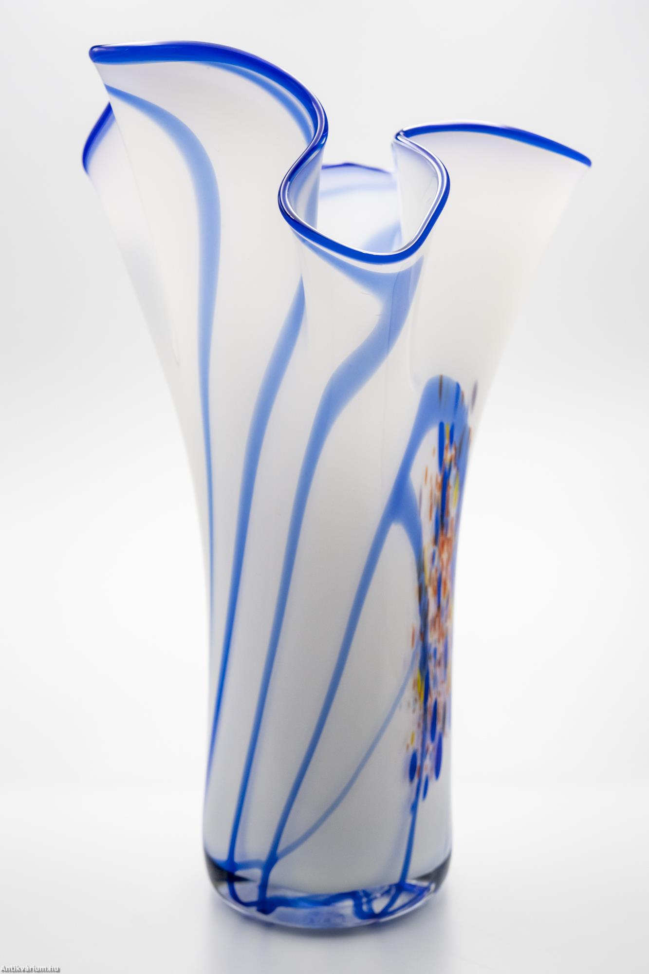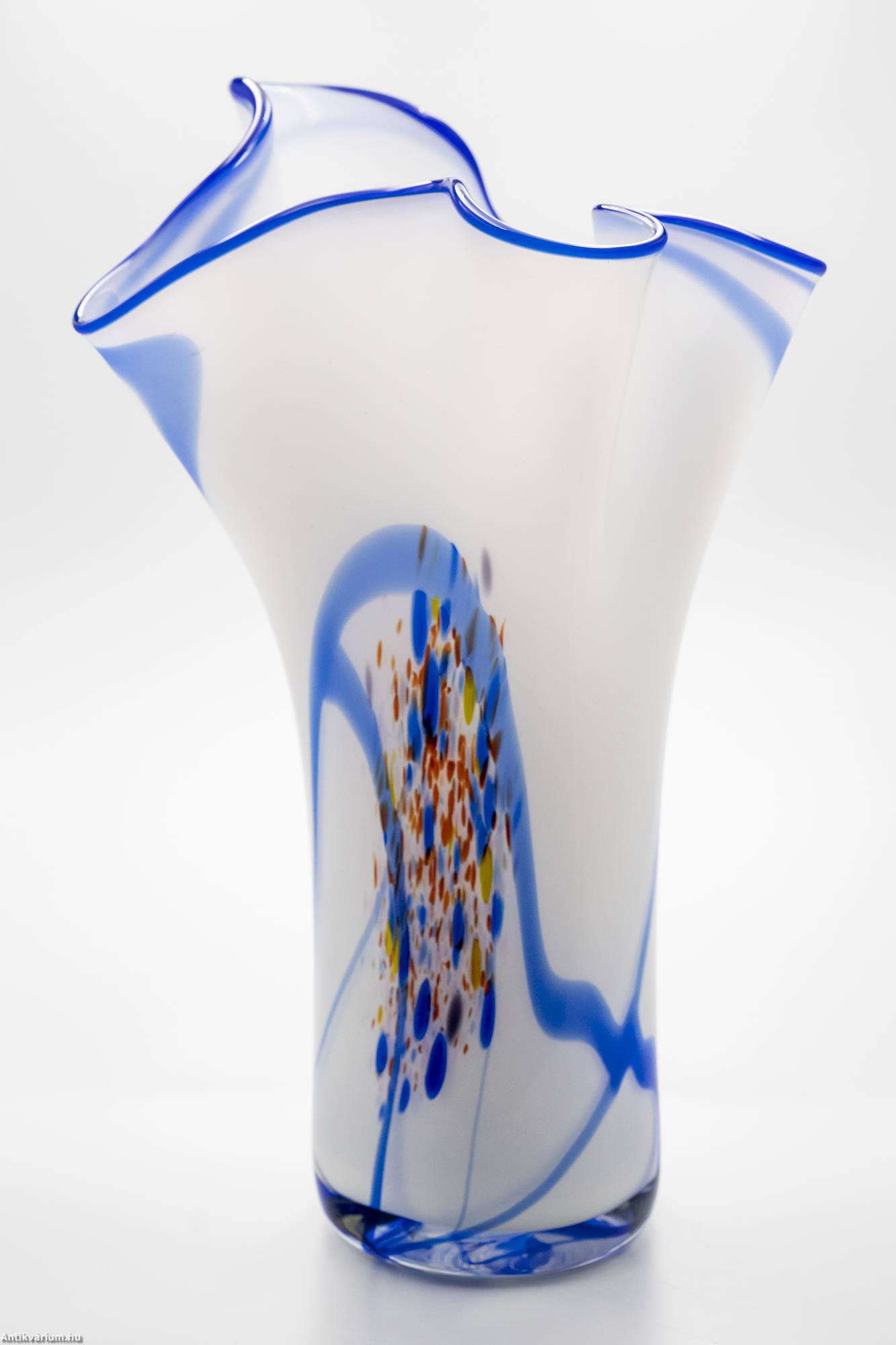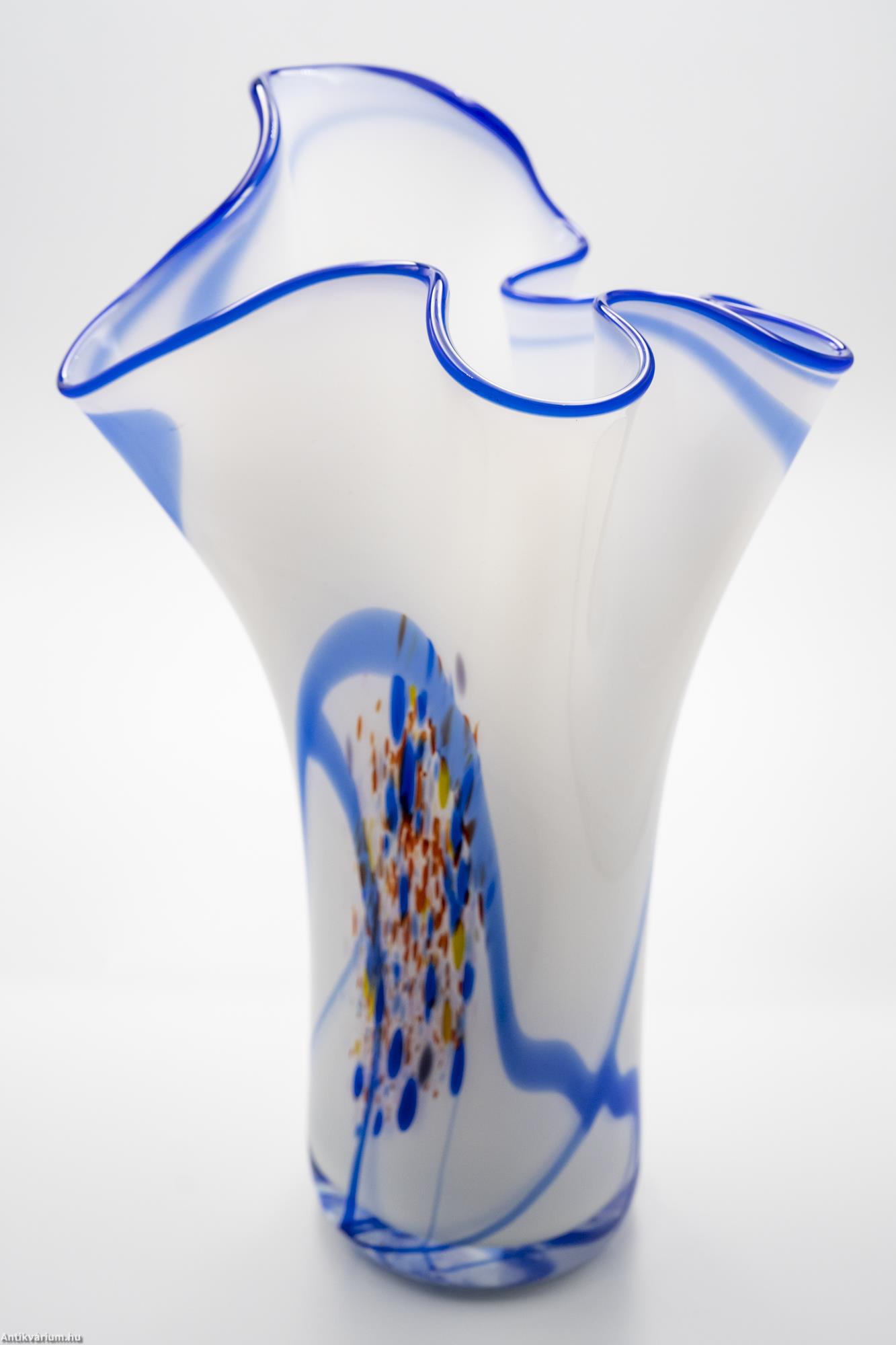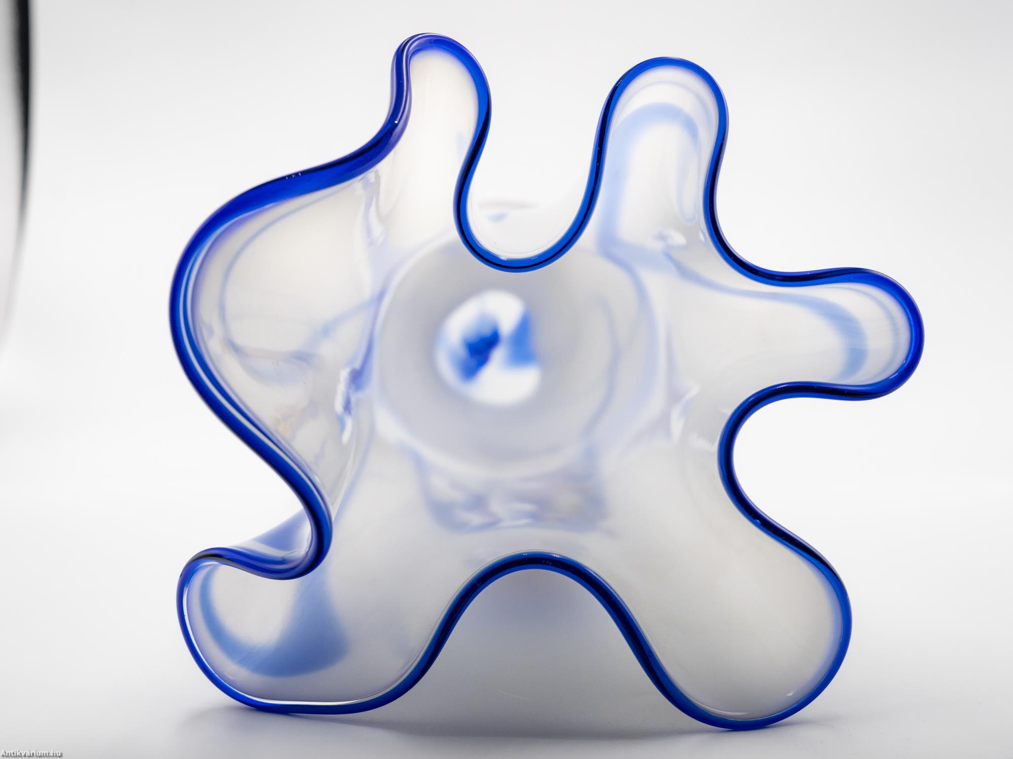 Hibátlan állapotú, fújt és kézzel formázott Murano Opalin Fazzoletto művészi üveg váza. A nagyméretű váza - asztalközép fölső széle klasszikus muranoi hullámívet, szalvéta (fazzoletto) formát követ. A rétegek között létrehozott azúrkék tónusú aszimmetrikus szál mintázat teszi igazán vonzóvá és izgalmassá ezt a műtárgyat. Opál üvegből készült felületét kontrasztos színekben megalkotott fröccs üvegbetétek tarkítják. Talpán a fújás helye (köldök) körkörösen kicsiszolva. Alkotásának ideje a 20. század második fele. Modern stílusú, extrém megjelenésű design váza.