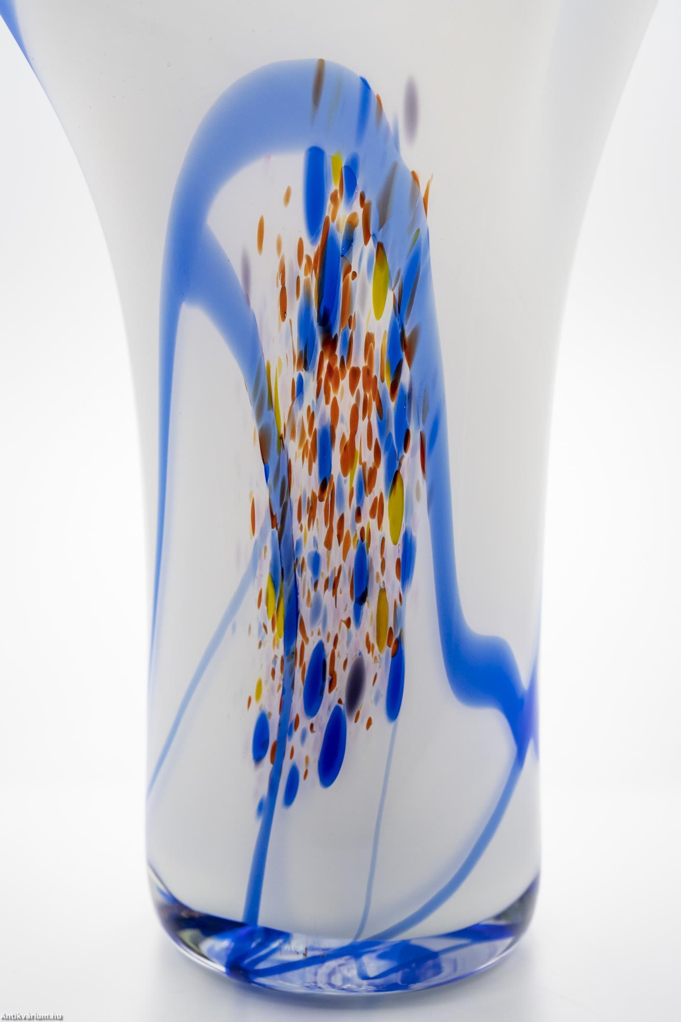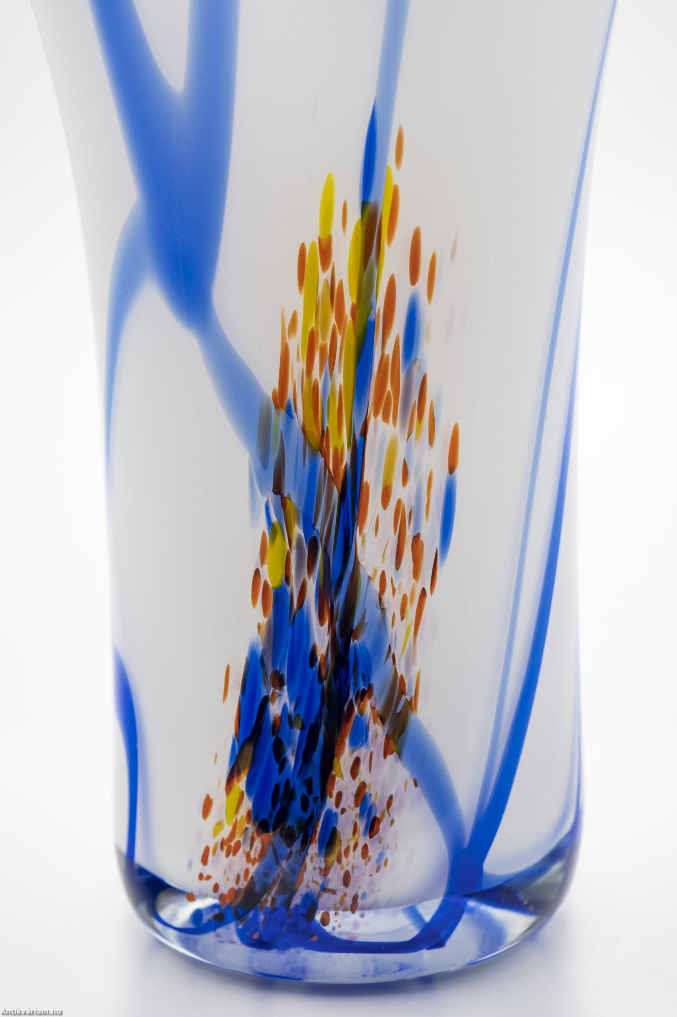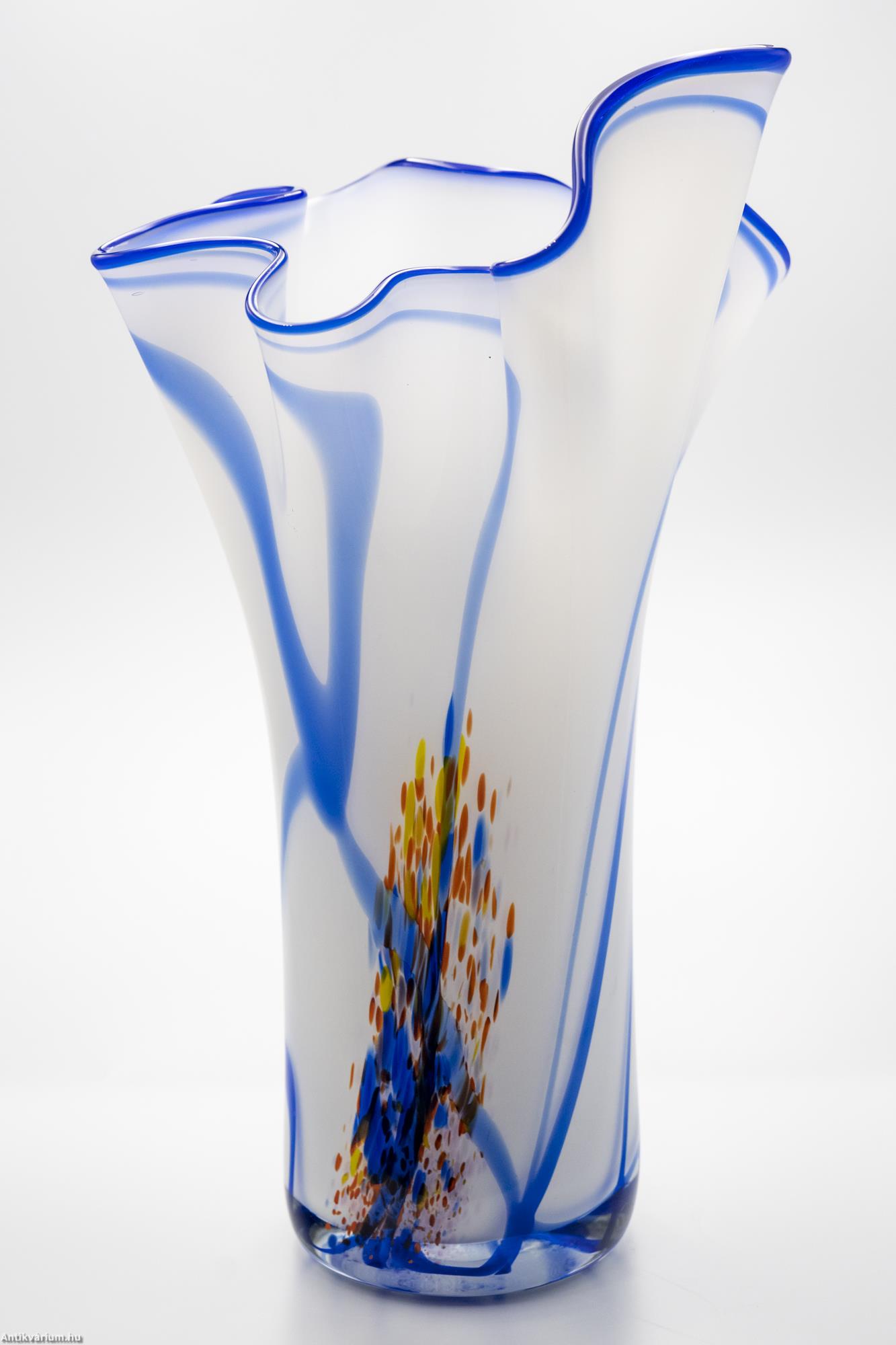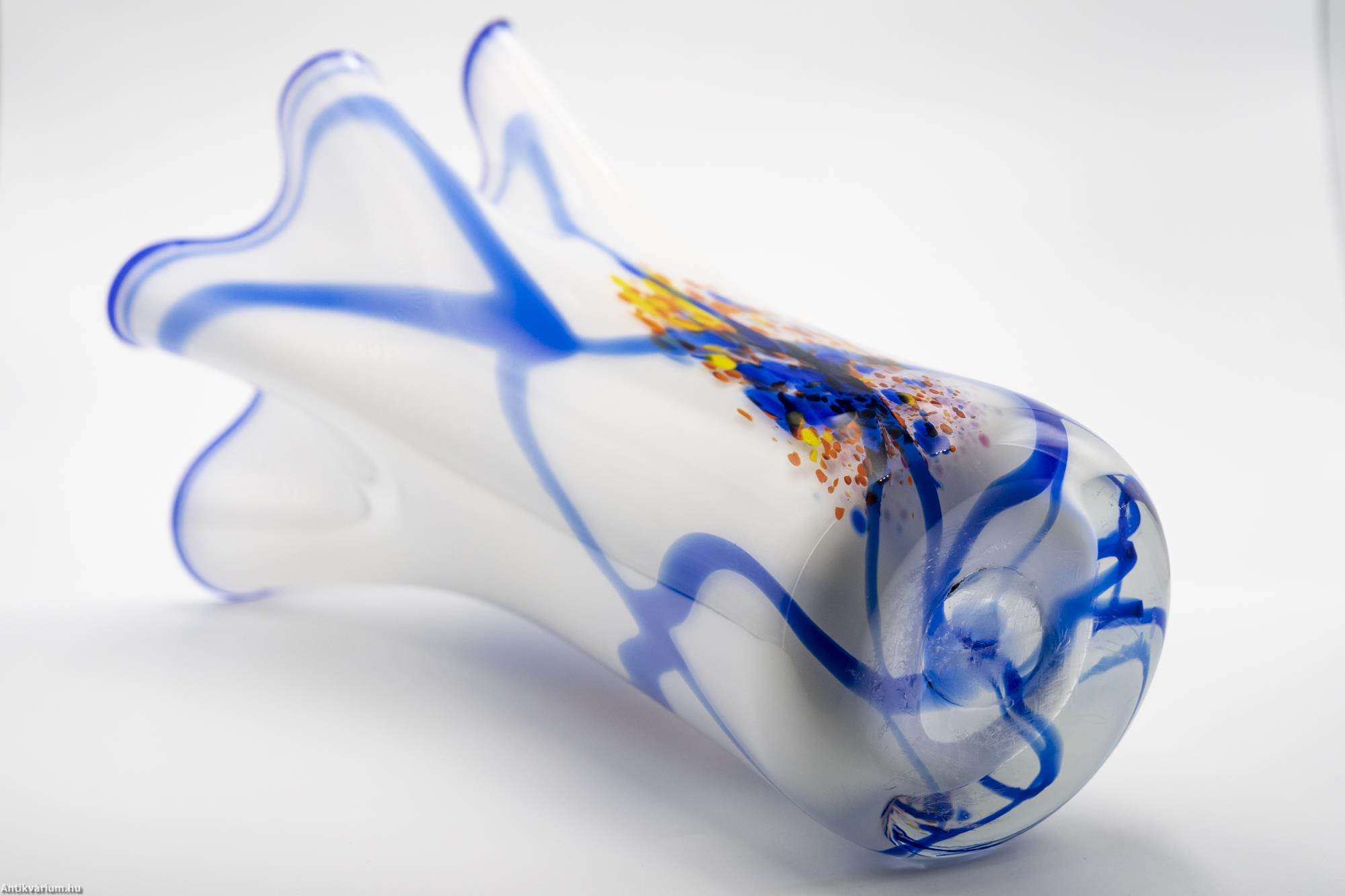Hibátlan állapotú, fújt és kézzel formázott Murano Opalin Fazzoletto művészi üveg váza. A nagyméretű váza - asztalközép fölső széle klasszikus muranoi hullámívet, szalvéta (fazzoletto) formát követ. A rétegek között létrehozott azúrkék tónusú aszimmetrikus szál mintázat teszi igazán vonzóvá és izgalmassá ezt a műtárgyat. Opál üvegből készült felületét kontrasztos színekben megalkotott fröccs üvegbetétek tarkítják. Talpán a fújás helye (köldök) körkörösen kicsiszolva. Alkotásának ideje a 20. század második fele. Modern stílusú, extrém megjelenésű design váza.