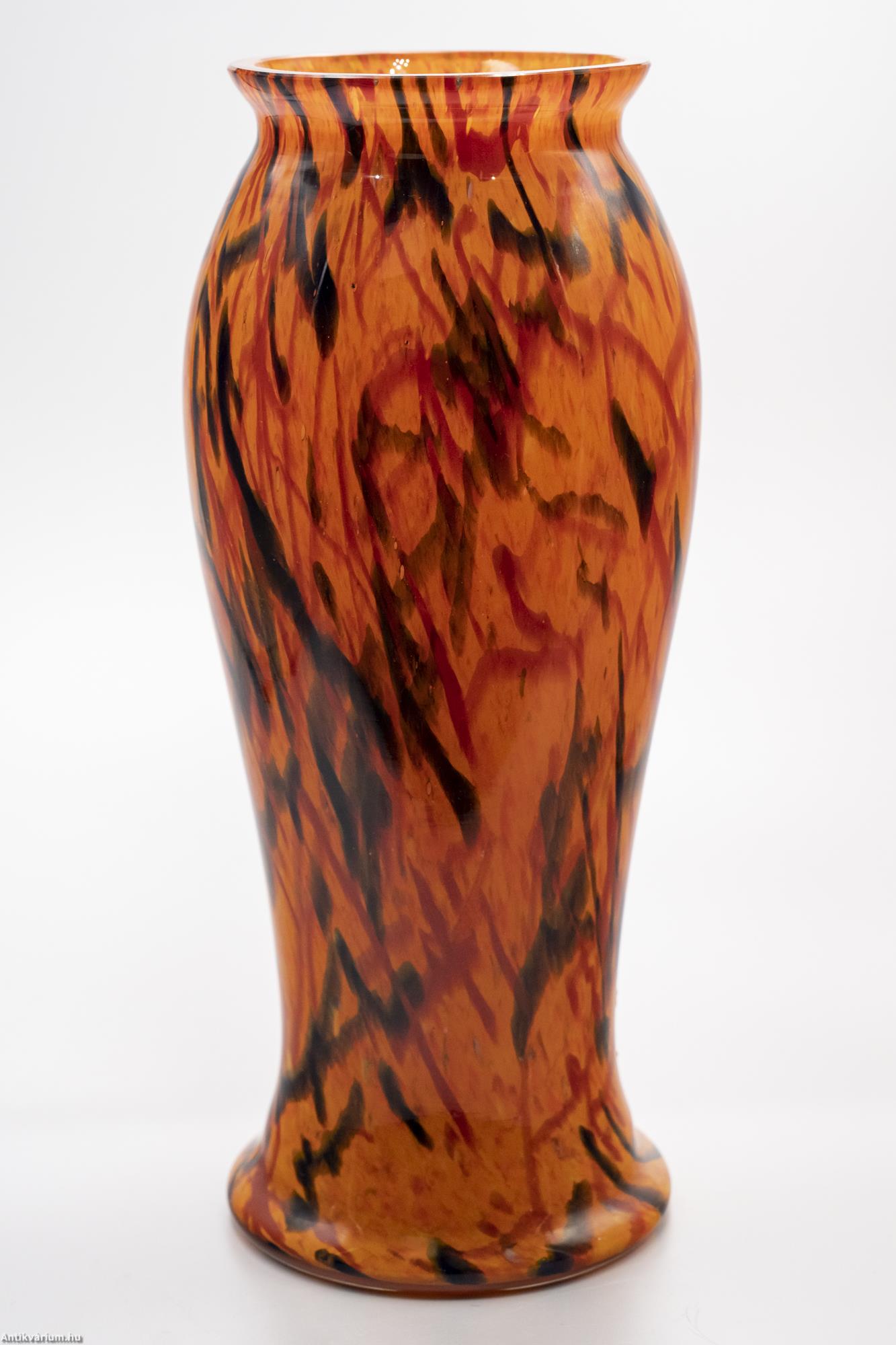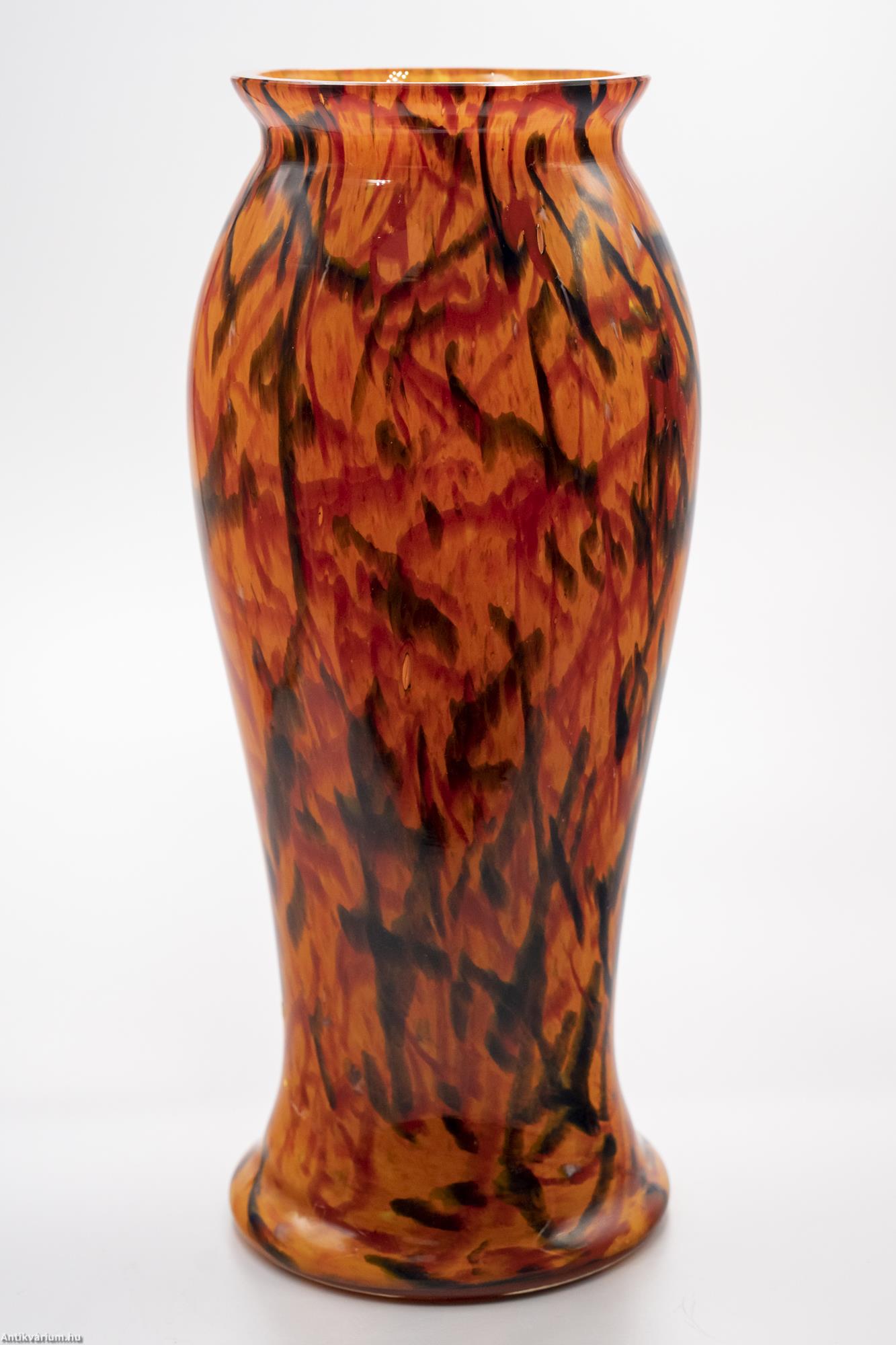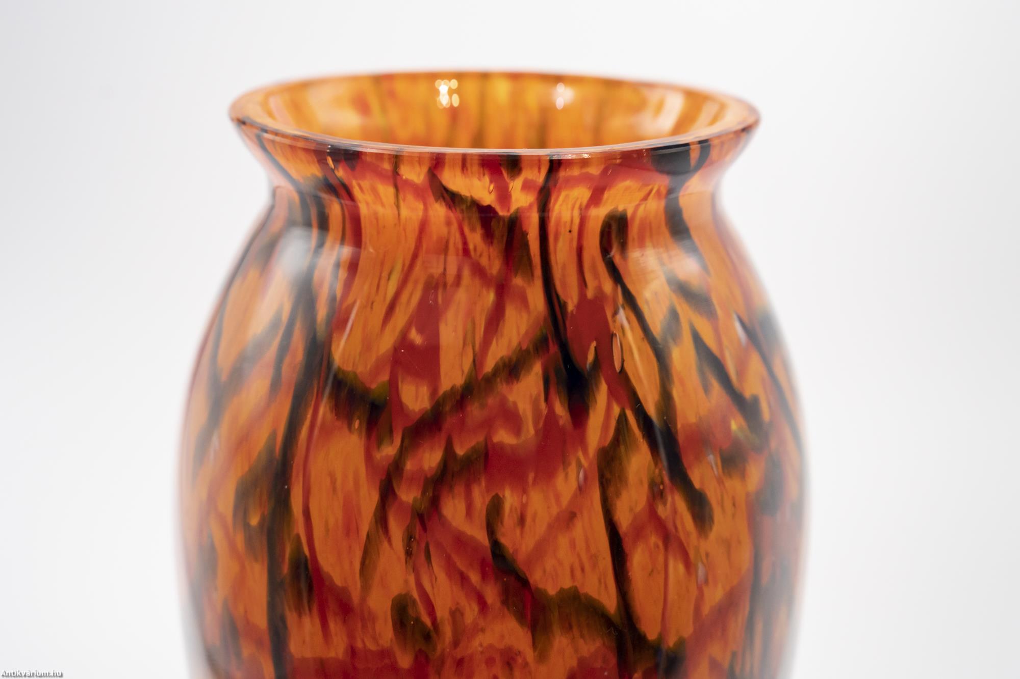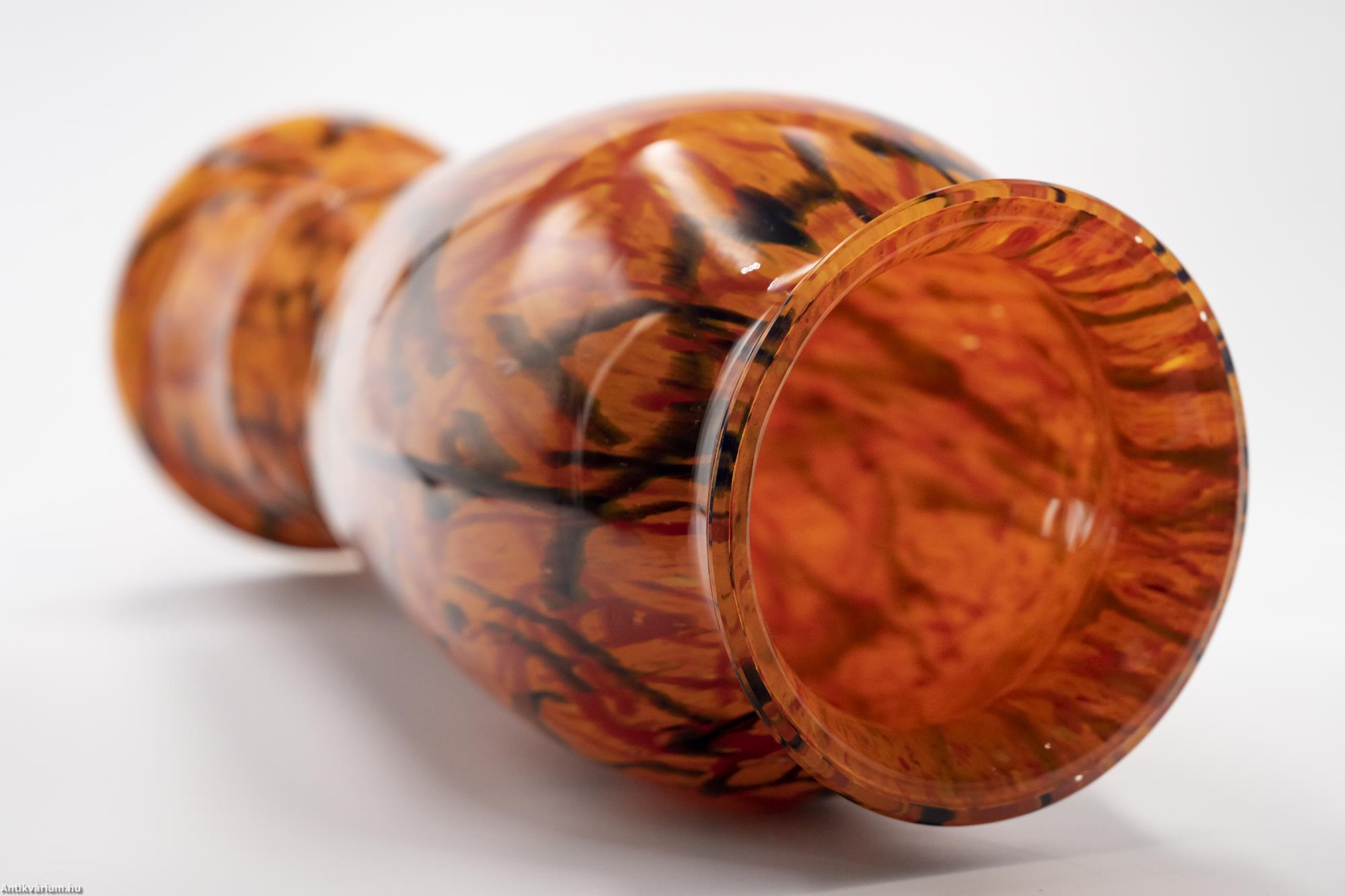 Hibátlan állapotú, fújt és kézzel formázott art deco Kralik üveg lámpatest a 20. század első feléből. Narancssárga felületén piros és fekete színű asszimetrikusan megjelenő vonalmintázat látható. A tarka szín és minta mozgalmas hatást kelt a nagyméretű üveg lámpa test felületén. Élénk színösszeállítású, igényesen elkészített és kitűnő állapotban lévő fröccsüveg technikával (spatter) készített üveg dísztárgy, amely eljárás a római korig visszanyúló, évszázadok óta alkalmazott technika. A fröccs üveget úgy állítják elő, hogy forrón fújt üveget hengerelnek kis színes üvegdarabokra vagy forgácsokra. A fröccsenő üvegtechnikát leggyakrabban alkalmazó üveggyártók a cseh üvegművesek, legjelesebb képviselői Kralik és Welz. A Kralik Üveggyár a cseh művészi üveg ismert gyártója volt, amely a késő szecessziós és az art deco korszakban került előtérbe, nagyrészt vázákat és tálakat gyártott Loetz és mások által ihletett stílusban.
