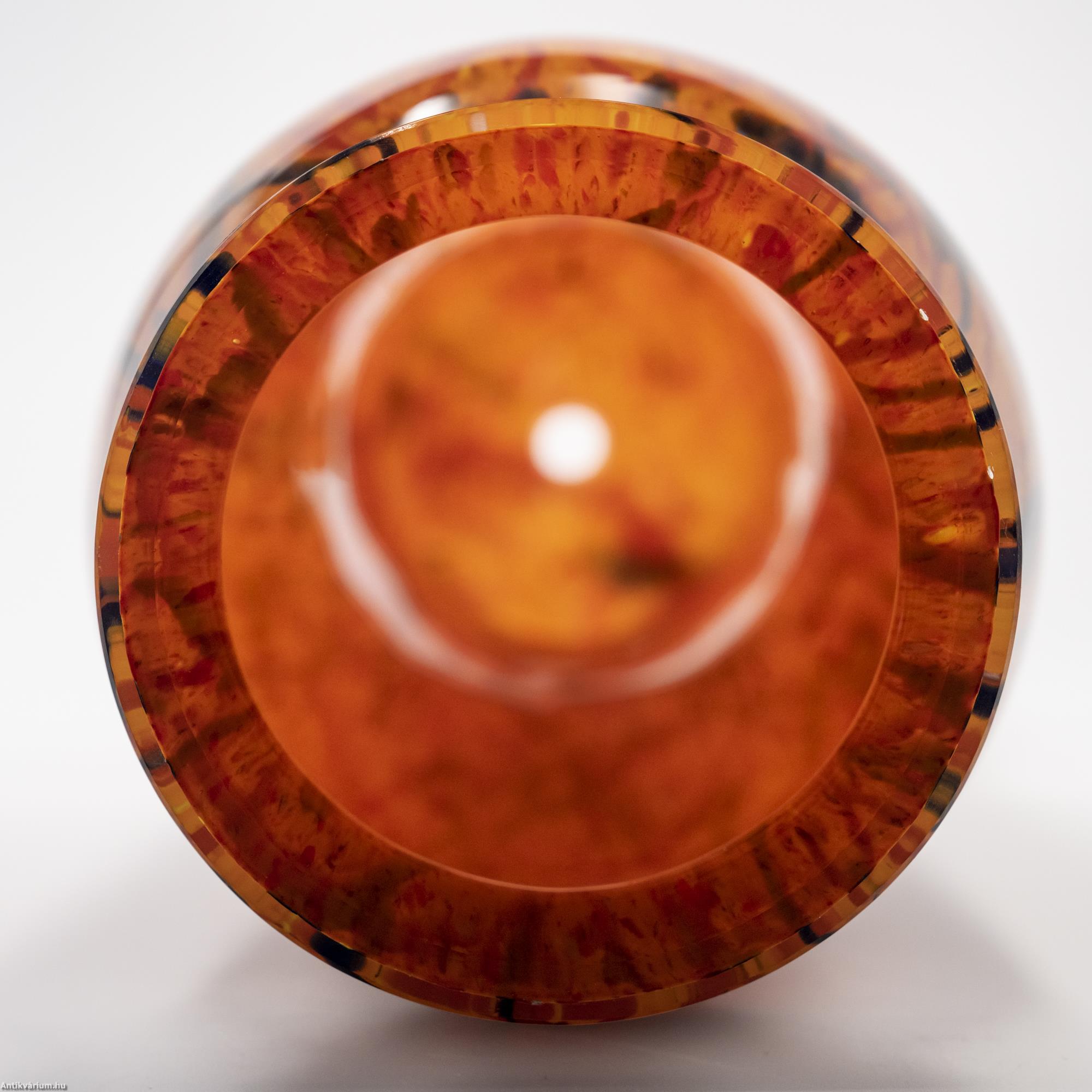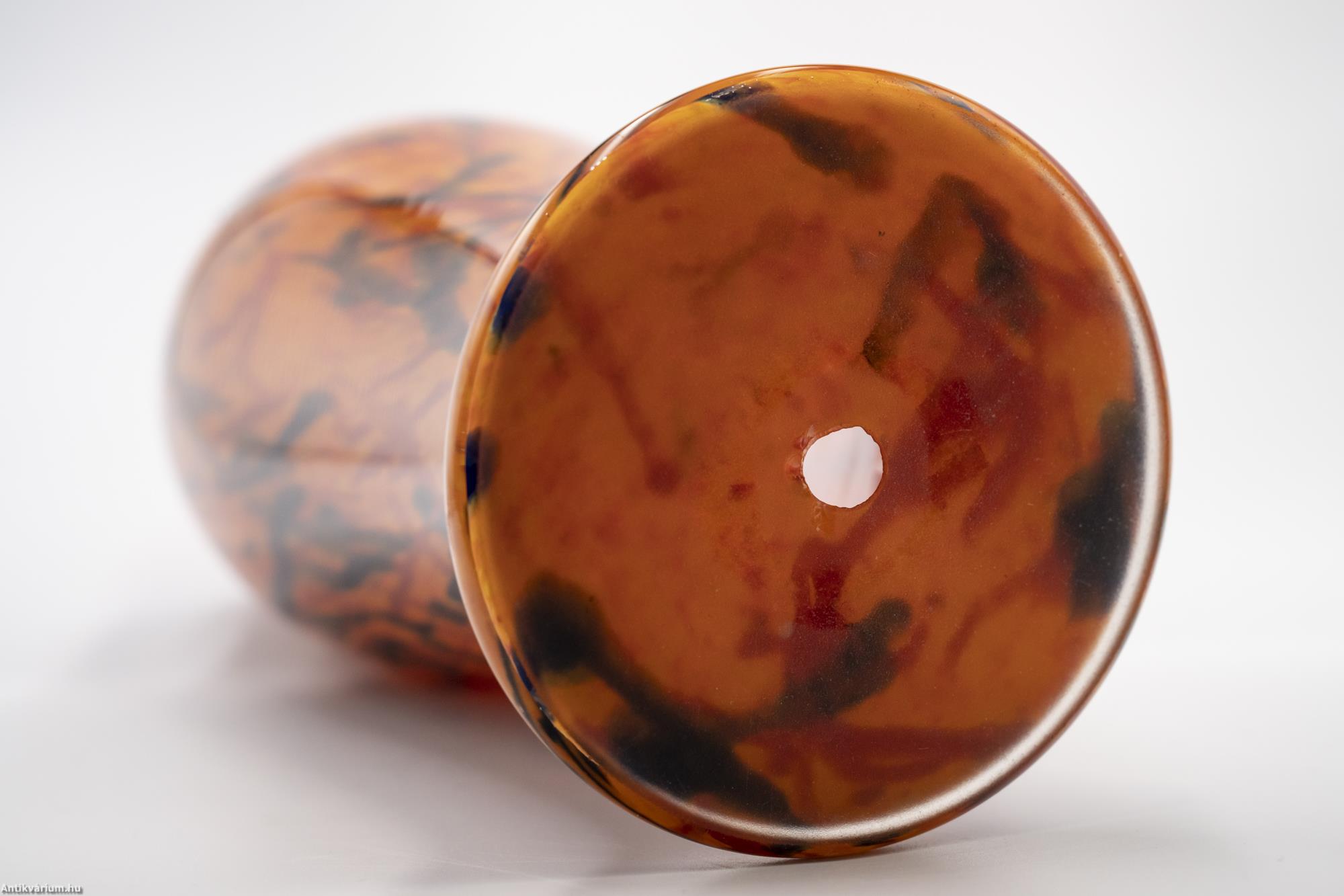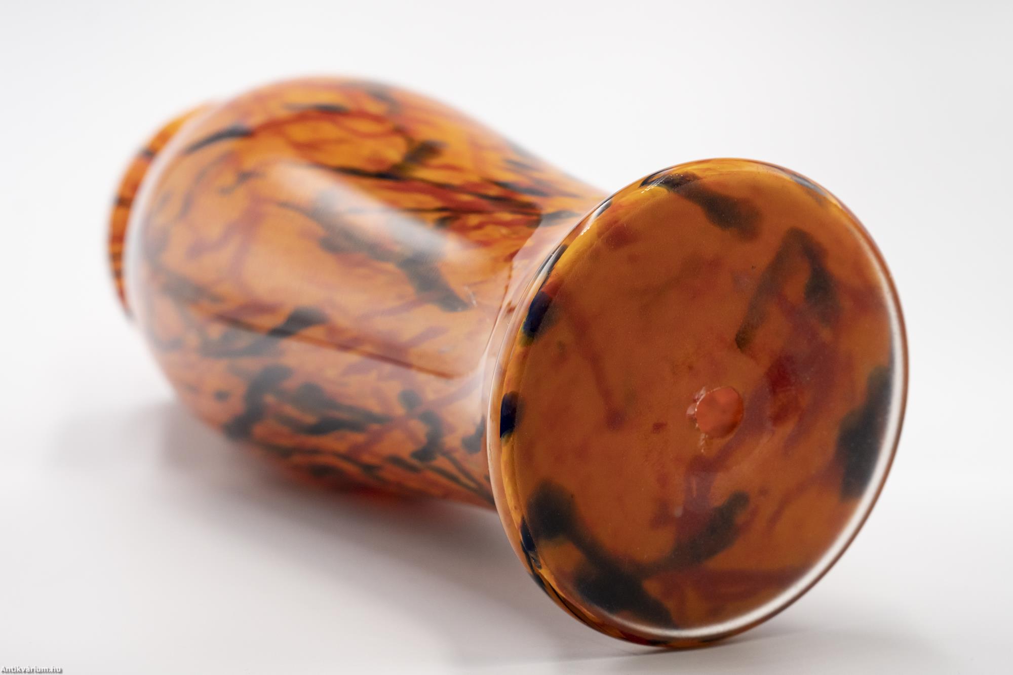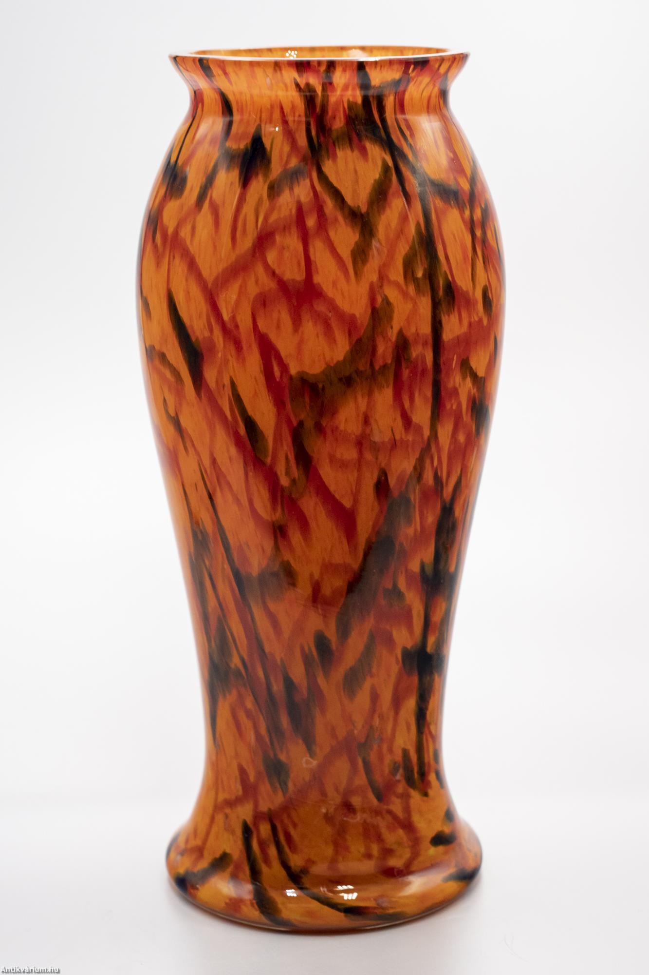 Hibátlan állapotú, fújt és kézzel formázott art deco Kralik üveg lámpatest a 20. század első feléből. Narancssárga felületén piros és fekete színű asszimetrikusan megjelenő vonalmintázat látható. A tarka szín és minta mozgalmas hatást kelt a nagyméretű üveg lámpa test felületén. Élénk színösszeállítású, igényesen elkészített és kitűnő állapotban lévő fröccsüveg technikával (spatter) készített üveg dísztárgy, amely eljárás a római korig visszanyúló, évszázadok óta alkalmazott technika. A fröccs üveget úgy állítják elő, hogy forrón fújt üveget hengerelnek kis színes üvegdarabokra vagy forgácsokra. A fröccsenő üvegtechnikát leggyakrabban alkalmazó üveggyártók a cseh üvegművesek, legjelesebb képviselői Kralik és Welz. A Kralik Üveggyár a cseh művészi üveg ismert gyártója volt, amely a késő szecessziós és az art deco korszakban került előtérbe, nagyrészt vázákat és tálakat gyártott Loetz és mások által ihletett stílusban.