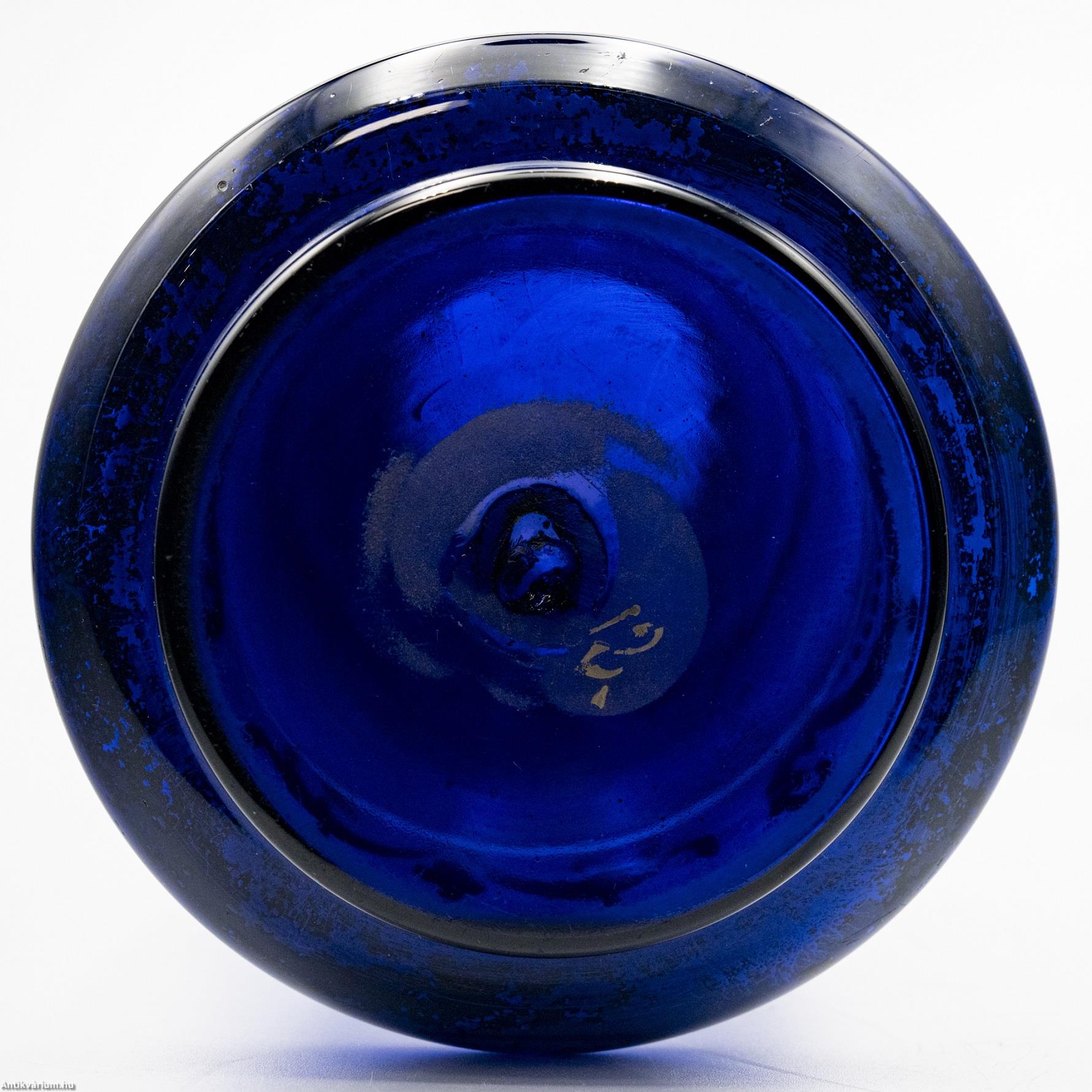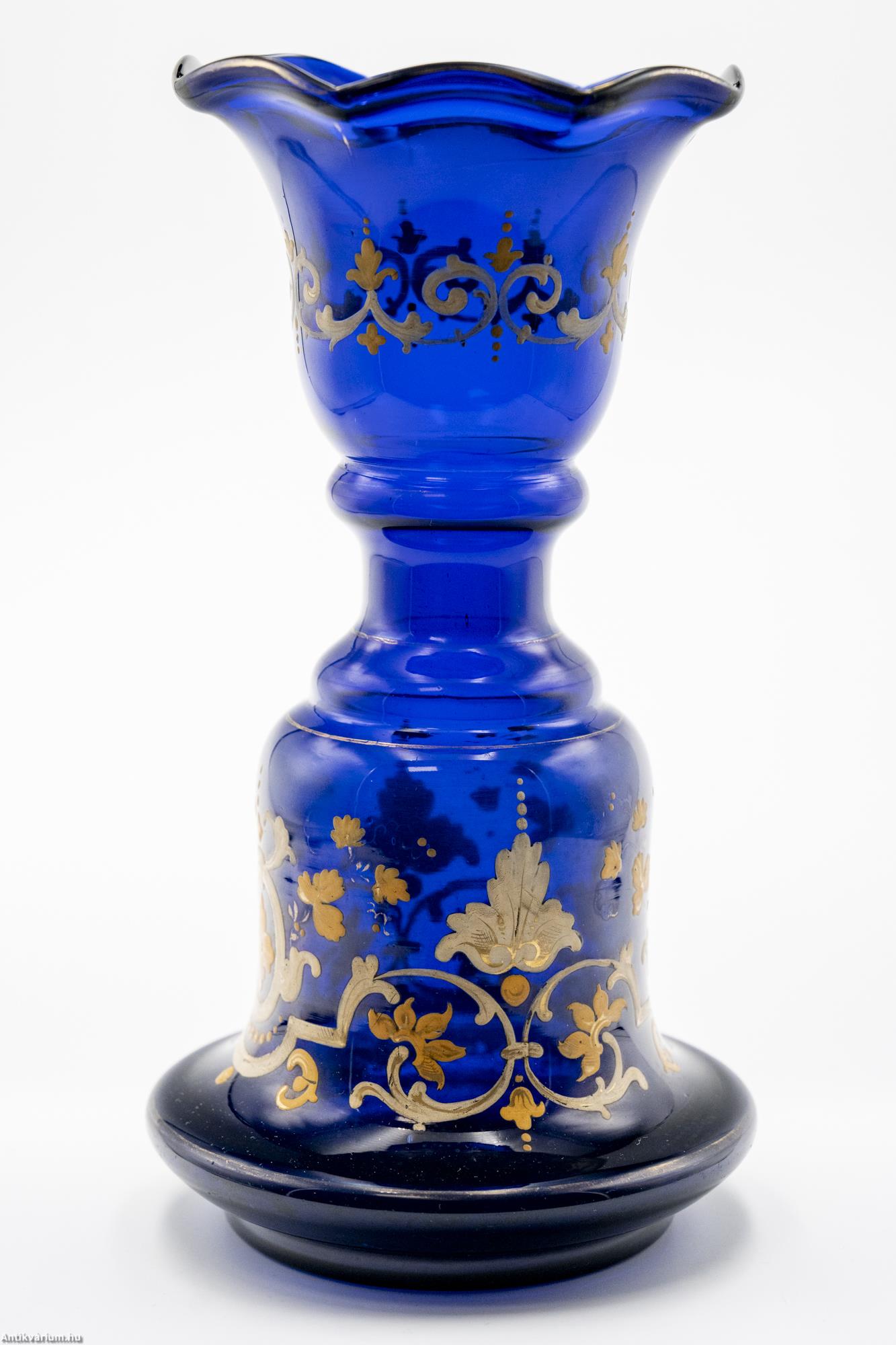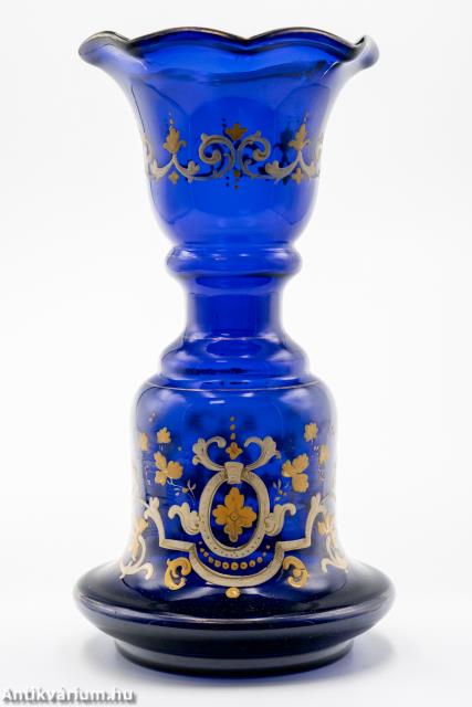 Hibátlan állapotú, fújt és kézzel formázott biedermeier festett üveg váza a 19. század közepéből. A biedermeier kor hangulatát és annak művészi kifejeződését minden részletében és jellegzetességében megjelenítő alkotás. Kobaltkék színű felületét részletgazdag domború, kézzel festett aranyszínű mintázat fedi, amely füzér és növényornamentikai formákat ábrázol. Különlegességét a középen összeszűkülő, tagolt formája adja, amely szinte két egyforma részre osztja az üveg vázát. Talprésze és fodros pereme kiszélesedik, erősítve a felső és alsó rész szimmetriáját. Talpán a fújás helye látható. Korát és dekor mintázatát tekintve ritka, gyűjtői darab.