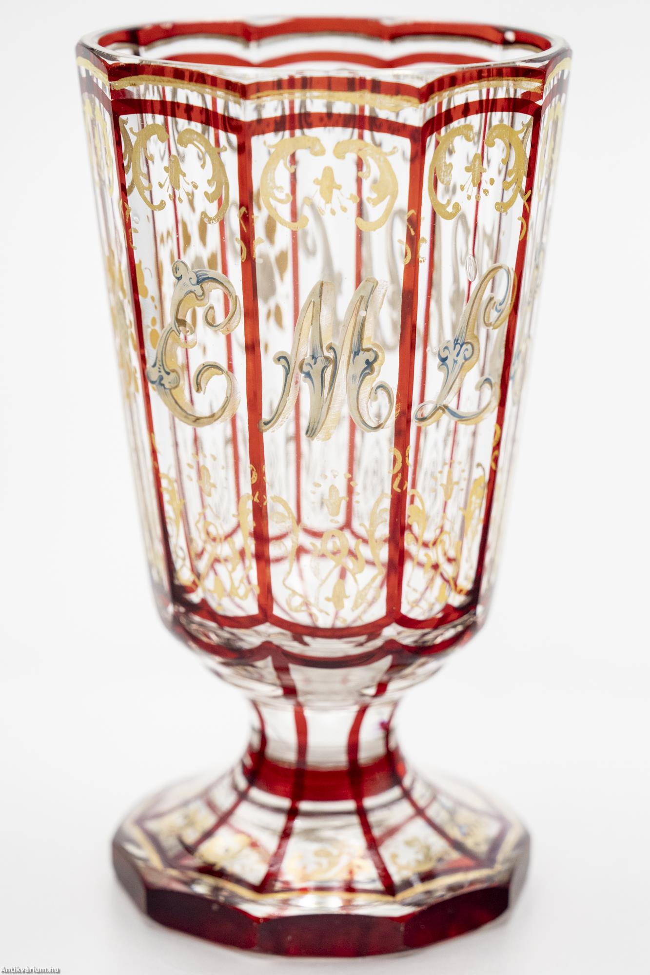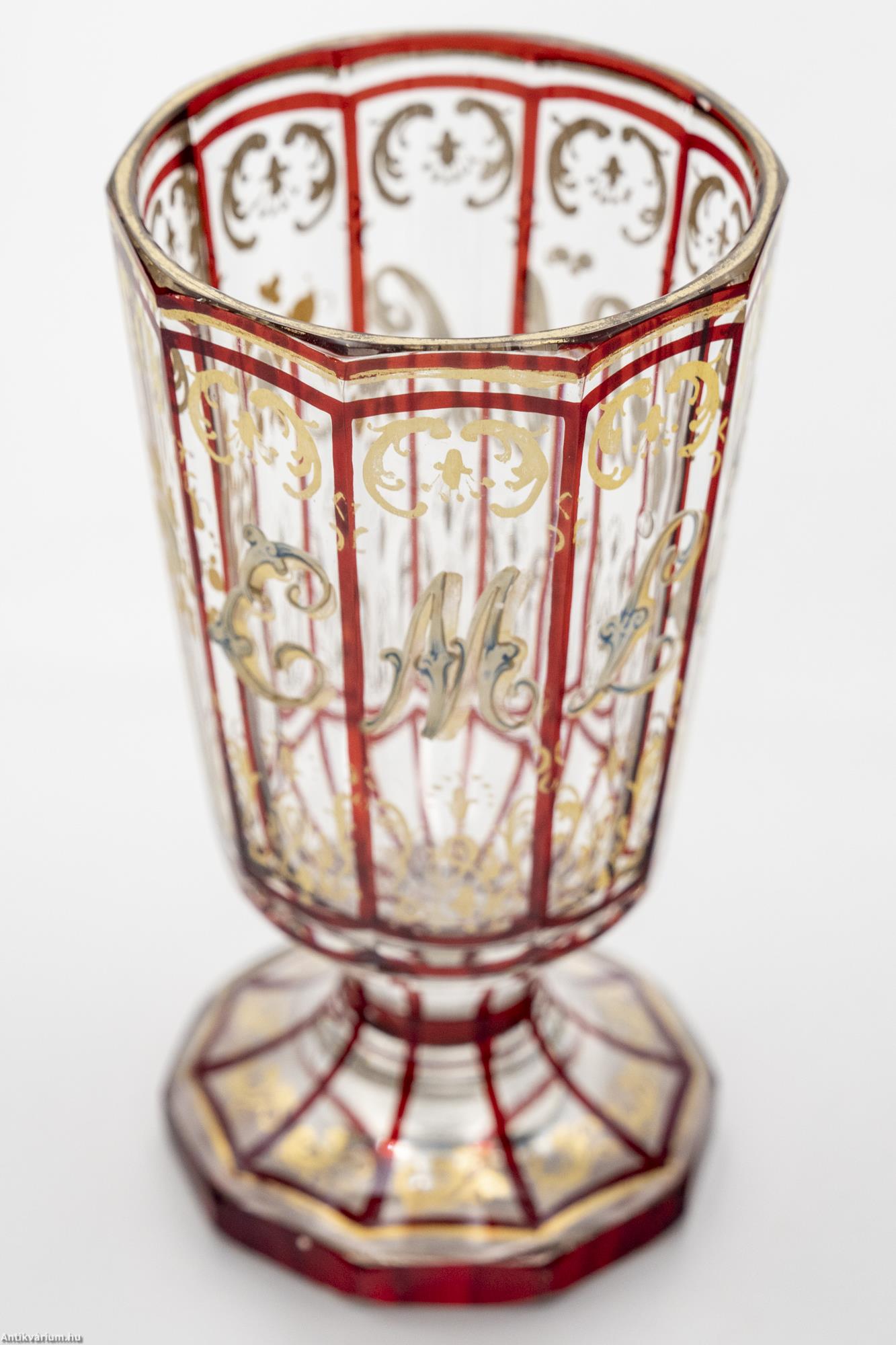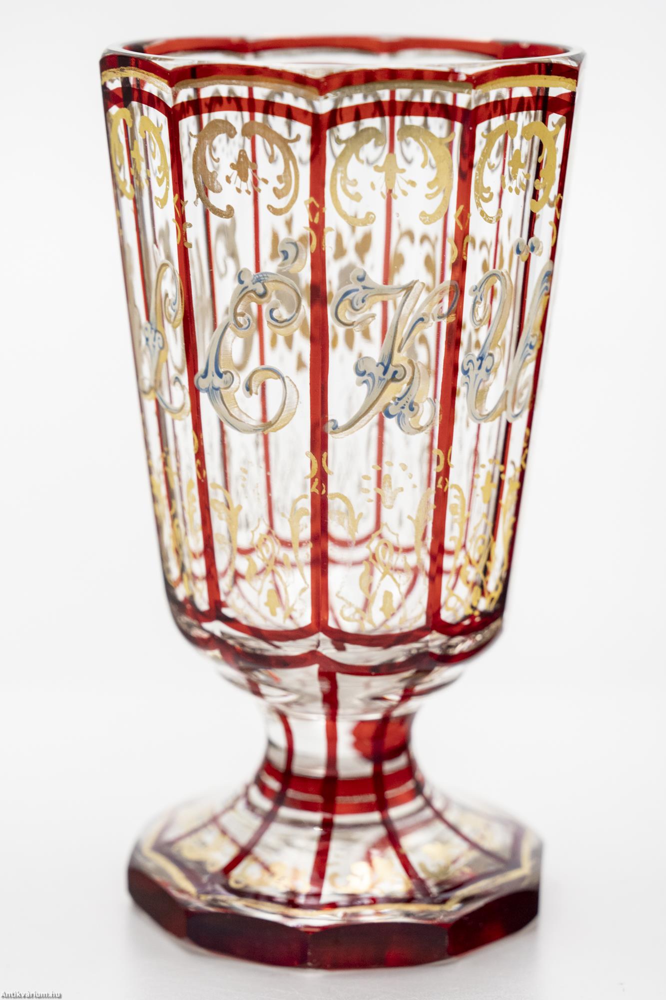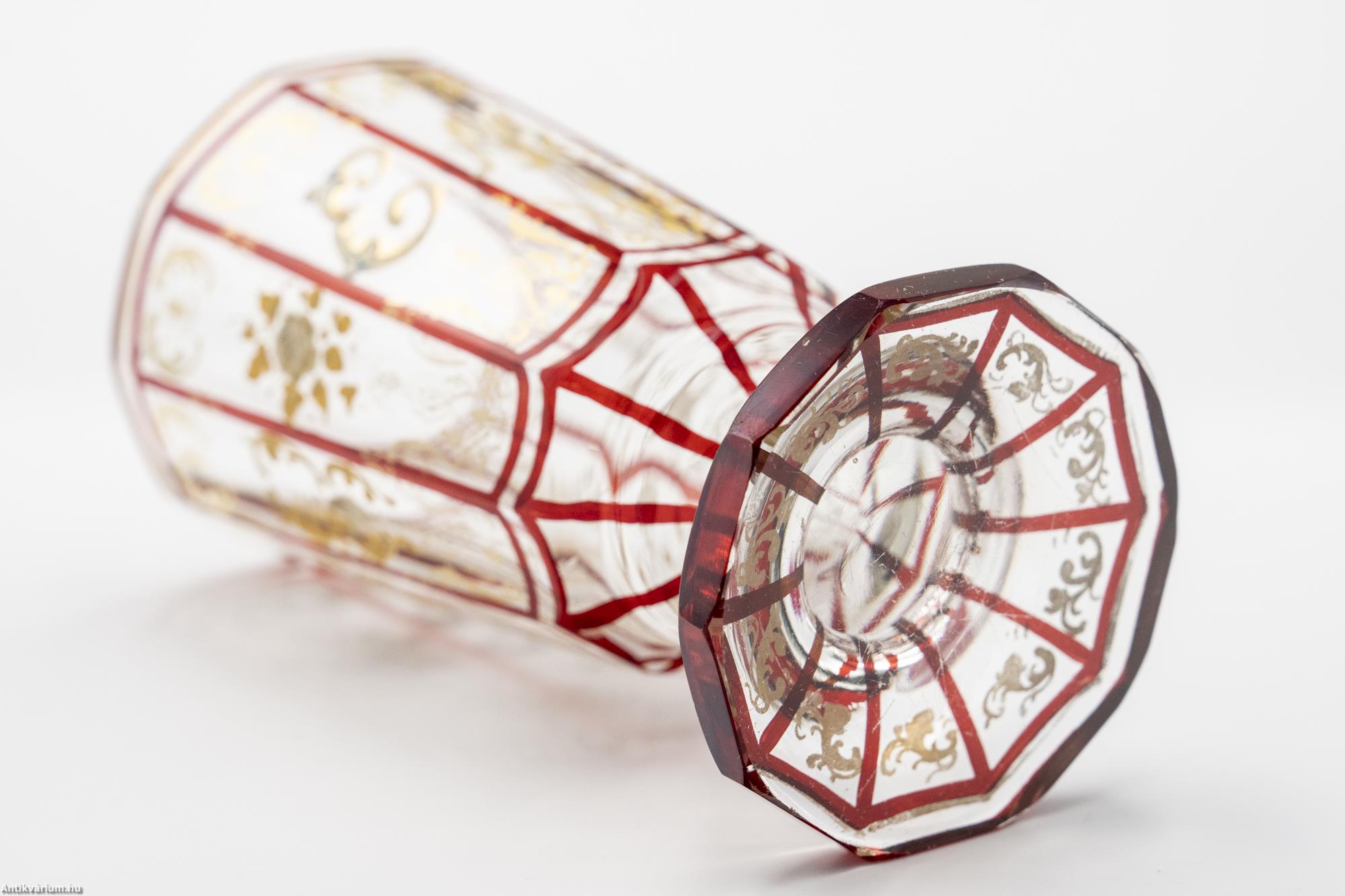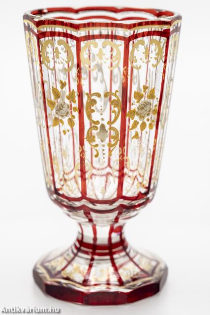Hibátlan állapotú, fújt és kézzel formázott, festett biedermeier bordó üveg pohár a 19. század közepéből. A kehelyrész tízosztásos lapra csiszolt és bordó színű kontúrfestéssel kiemelt oldalakból áll. Az azon megjelenő kézzel festett arany színű növényornamentika teszik egyedivé ezt az igényesen kivitelezett 19. századi díszüveg poharat. Talpa simára csiszolt, oldalai lapra csiszoltak és festettek. Korát és dekor mintázatát tekintve ritka, gyűjtői darab. A biedermeier korszak idején (1820-1860) a csiszolt, vésett, gazdagon megmunkált vastag falú kristálypoharak, néha festéssel és aranyozással is díszítve nagy sikert arattak. A biedermeier enteriőrök látványos díszei voltak a tarka, változatos emlékpoharak, palackos fürdőkúra ivókészletek.