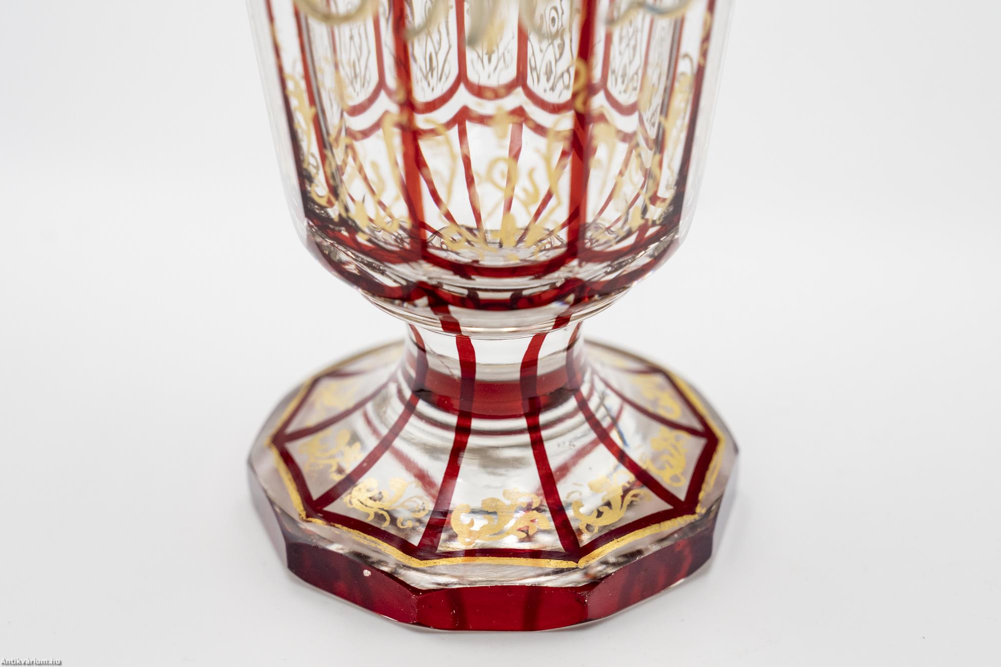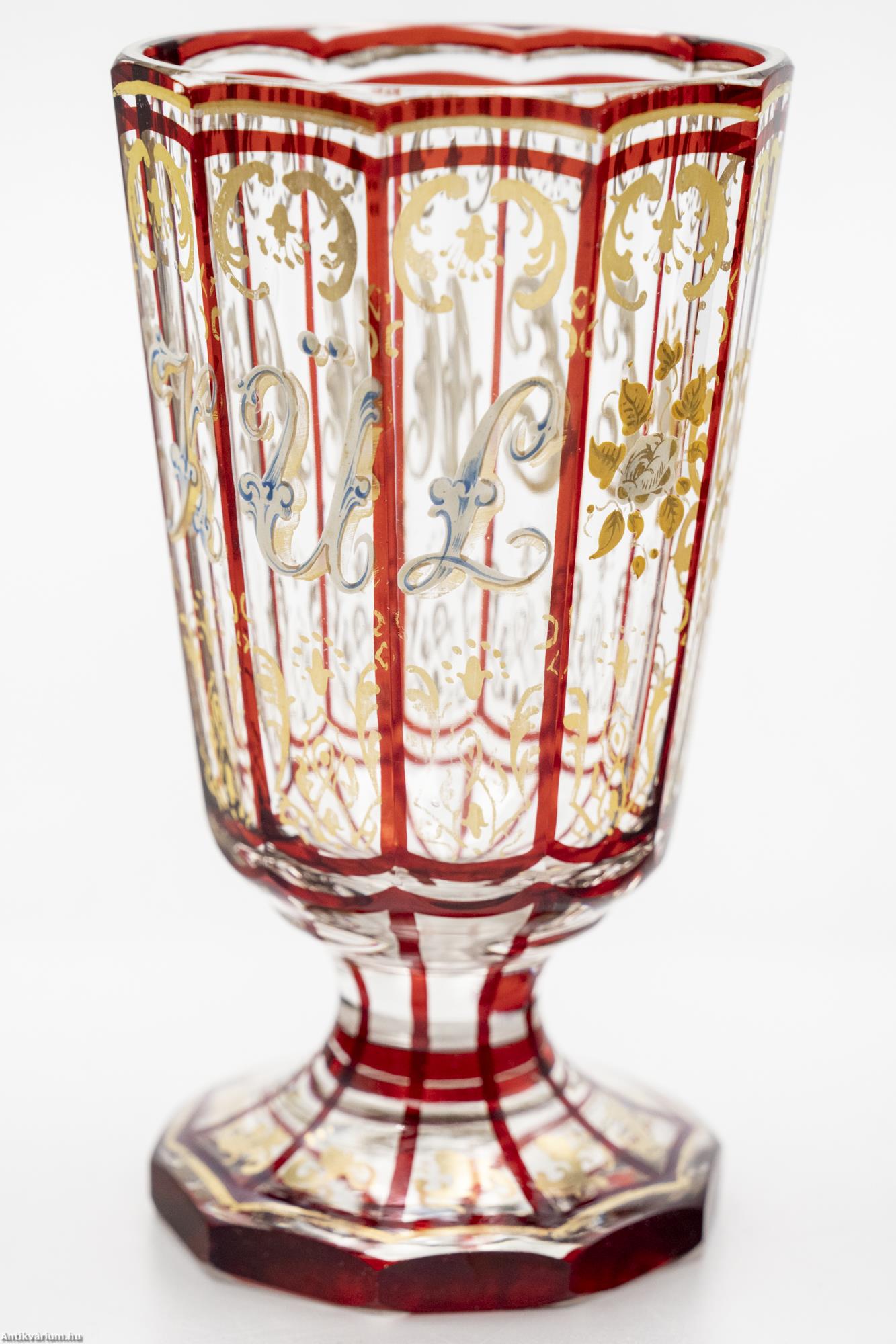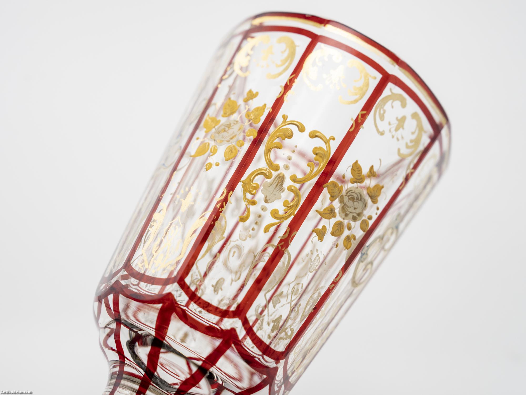 Hibátlan állapotú, fújt és kézzel formázott, festett biedermeier bordó üveg pohár a 19. század közepéből. A kehelyrész tízosztásos lapra csiszolt és bordó színű kontúrfestéssel kiemelt oldalakból áll. Az azon megjelenő kézzel festett arany színű növényornamentika teszik egyedivé ezt az igényesen kivitelezett 19. századi díszüveg poharat. Talpa simára csiszolt, oldalai lapra csiszoltak és festettek. Korát és dekor mintázatát tekintve ritka, gyűjtői darab. A biedermeier korszak idején (1820-1860) a csiszolt, vésett, gazdagon megmunkált vastag falú kristálypoharak, néha festéssel és aranyozással is díszítve nagy sikert arattak. A biedermeier enteriőrök látványos díszei voltak a tarka, változatos emlékpoharak, palackos fürdőkúra ivókészletek.