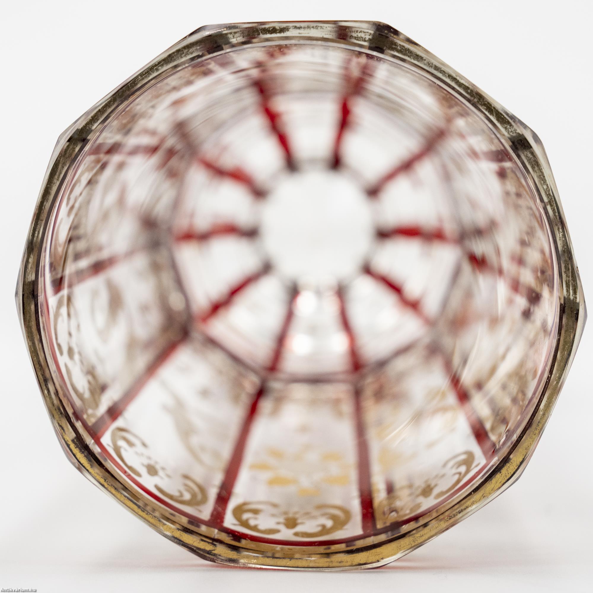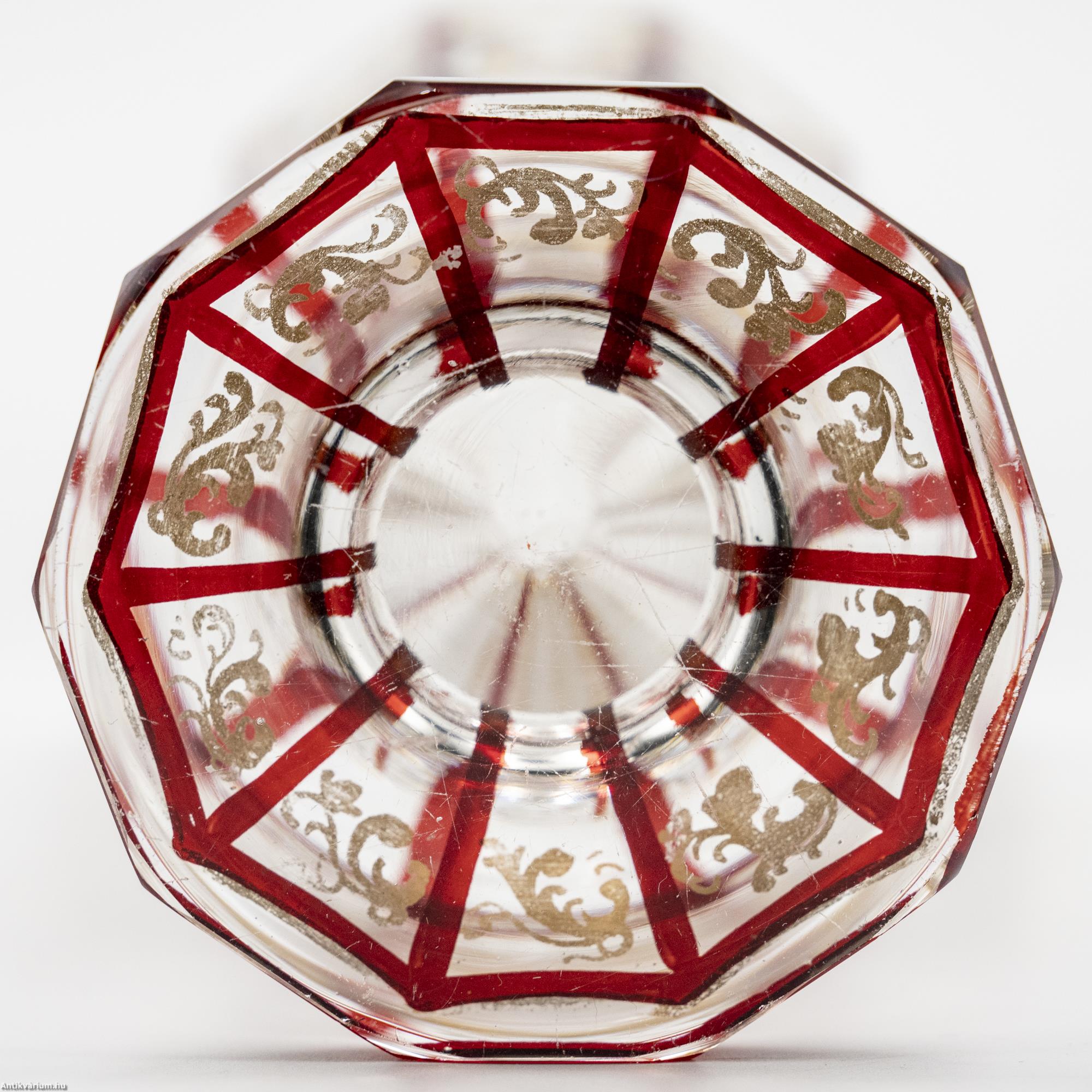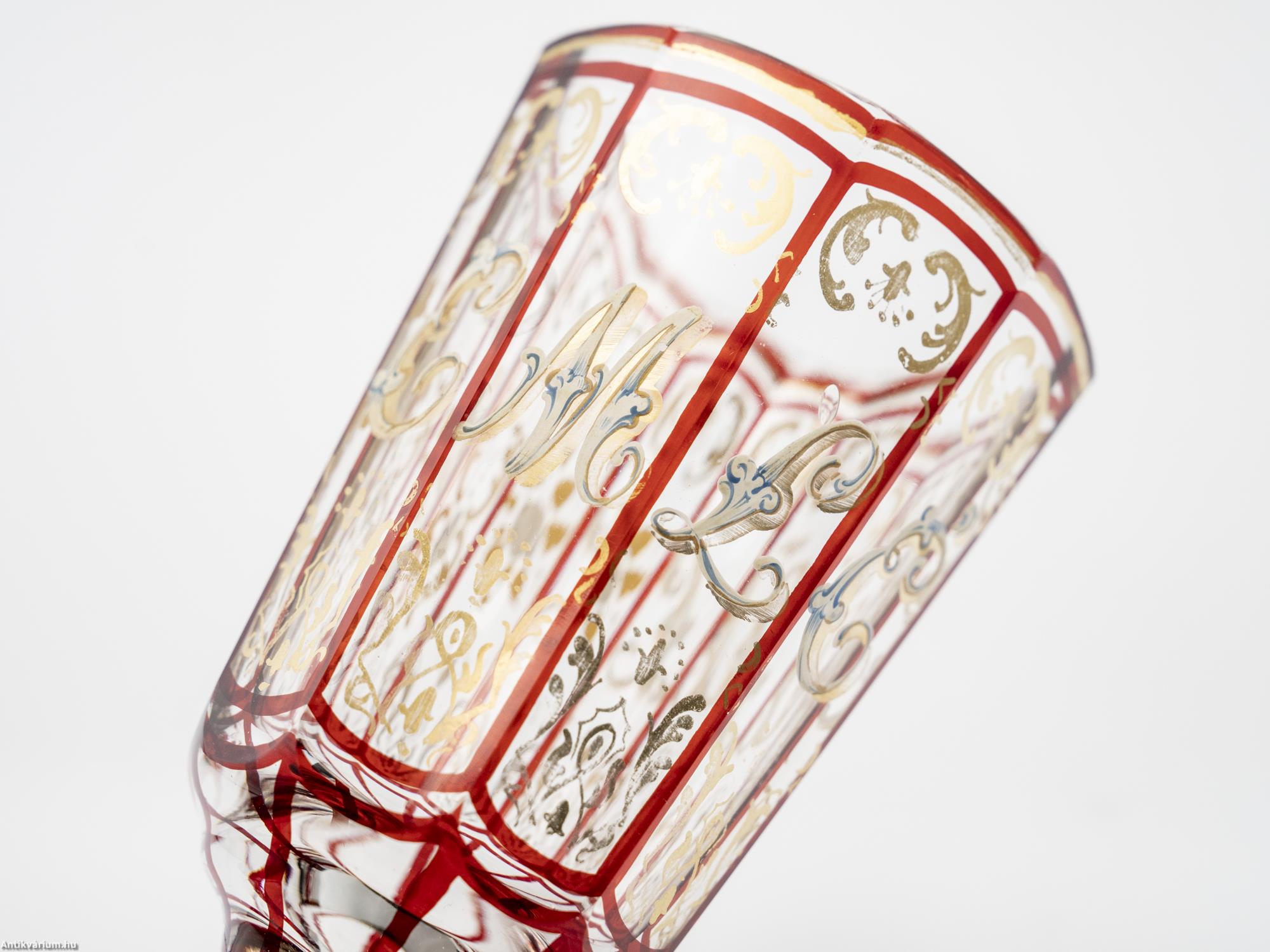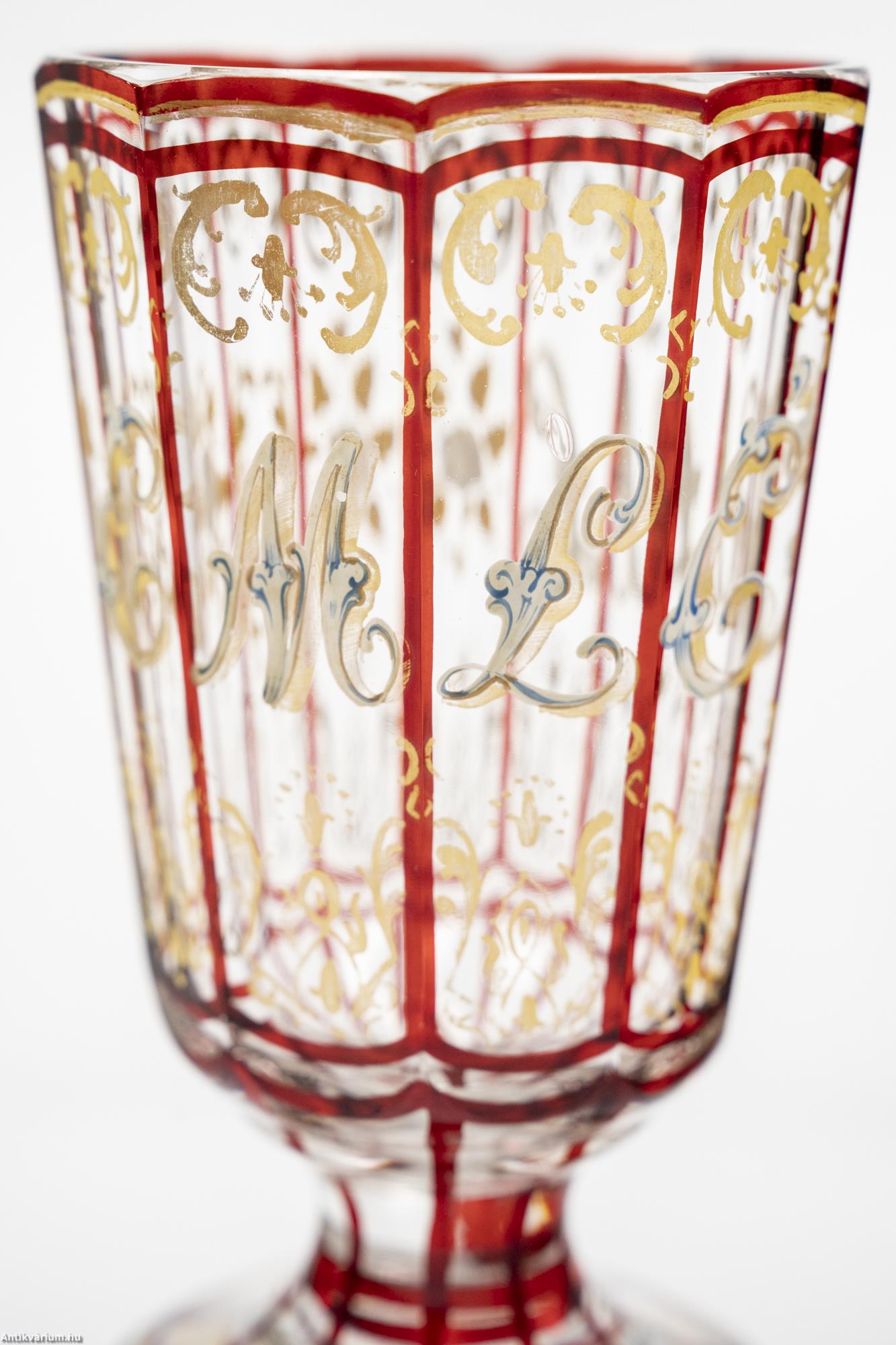 Hibátlan állapotú, fújt és kézzel formázott, festett biedermeier bordó üveg pohár a 19. század közepéből. A kehelyrész tízosztásos lapra csiszolt és bordó színű kontúrfestéssel kiemelt oldalakból áll. Az azon megjelenő kézzel festett arany színű növényornamentika teszik egyedivé ezt az igényesen kivitelezett 19. századi díszüveg poharat. Talpa simára csiszolt, oldalai lapra csiszoltak és festettek. Korát és dekor mintázatát tekintve ritka, gyűjtői darab. A biedermeier korszak idején (1820-1860) a csiszolt, vésett, gazdagon megmunkált vastag falú kristálypoharak, néha festéssel és aranyozással is díszítve nagy sikert arattak. A biedermeier enteriőrök látványos díszei voltak a tarka, változatos emlékpoharak, palackos fürdőkúra ivókészletek.