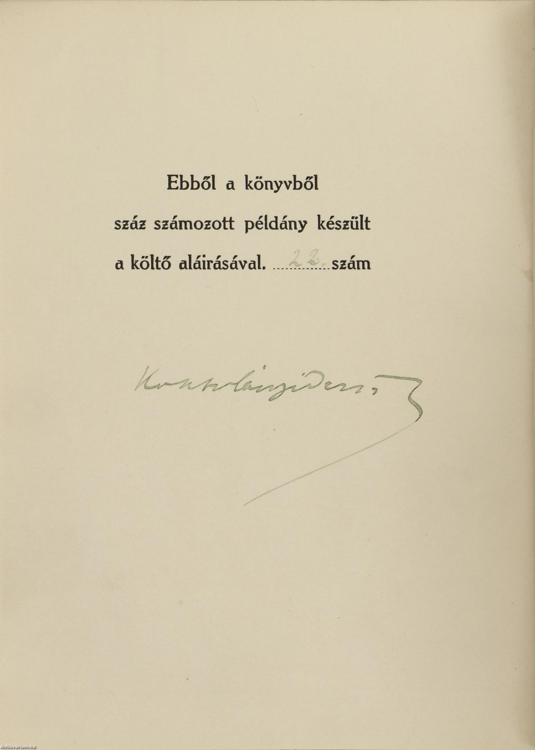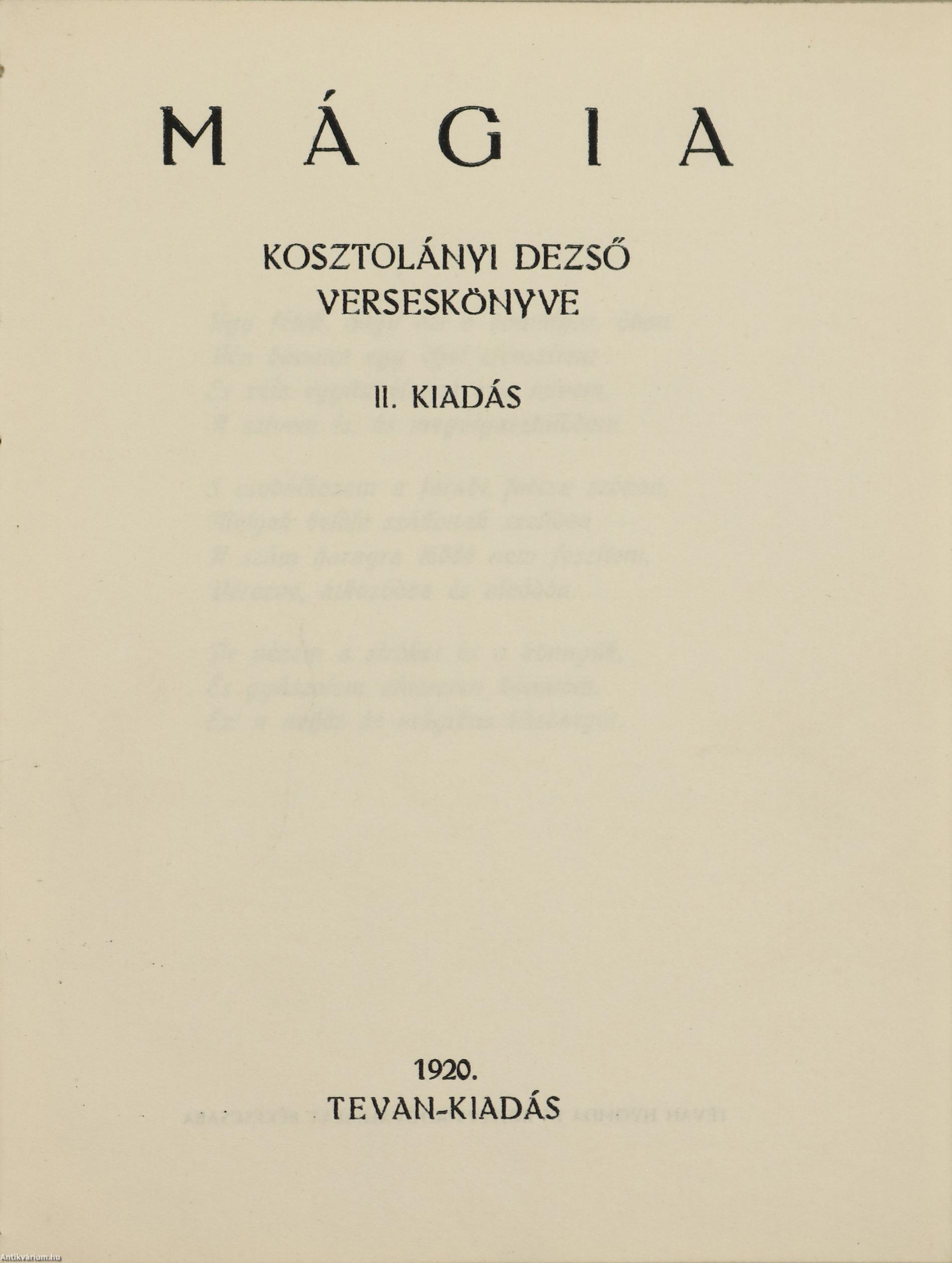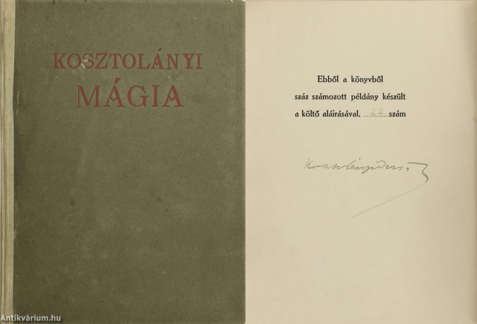 Szerző által aláírt példány. Számozott, bibliofil kiadás. Mágia. Kosztolányi Dezső verseskönyve. Írta: Kosztolányi Dezső. Az előlap előtti lapon a számozás alatt a szerző, Kosztolányi Dezső tollal beírt, jól olvasható aláírása látható. "Ebből a könyvből száz számozott példány készült a költő aláírásával". Ez a 22. számú példány. Második kiadás. A verseskötetet a Tevan Nyomda és Könyvkiadóvállalat nyomtatta Békéscsabán. A kötet elülső előzéklapján régi Ex-Libris bélyegzés látható. Kiadói varrott kemény papírkötésben lévő példány feliratos címfedéllel, feliratozatlan papír könyvgerinccel, kiadói előzéklapokkal, tiszta belívekkel, hiánytalan állapotban. A kötet szerzője, Nemeskosztolányi Kosztolányi Dezső (Szabadka, 1885. március 29. – Budapest, 1936. november 3.) író, költő, műfordító, kritikus, esszéista, újságíró, a Nyugat első nemzedékének kimagasló formaművésze, a XX. századi magyar széppróza és líra egyik legnagyobb alakja. A gimnáziumot Szabadkán kezdte, de Szegeden érettségizett le. Első írását a "Budapesti Napló" közölte. A budapesti egyetem magyar-német szakán folytatta tanulmányait. 1904-ben beiratkozott a bécsi egyetemre, ahol Hegel filozófiájáról, Grillparzerről és Schillerről hallgatott szemináriumokat. Írásait a "Szeged és Vidéke", a "Bácskai Hírlap", a "Budapesti Napló" közölte. "A Hét" rendszeresen publikálta verseit, műfordításait és kritikáit. A kommün bukása után az "Új Nemzedék" c. szélsőjobboldali lapnál helyezkedett el. Rákosi Jenőt Kosztolányi követte a Magyar PEN Club elnöki tisztségében. Halálának évében a "Nyugat" különszámmal adózott emlékének, amelyben Babits Mihály rehabilitálta fiatalkori barátját és művésztársát.