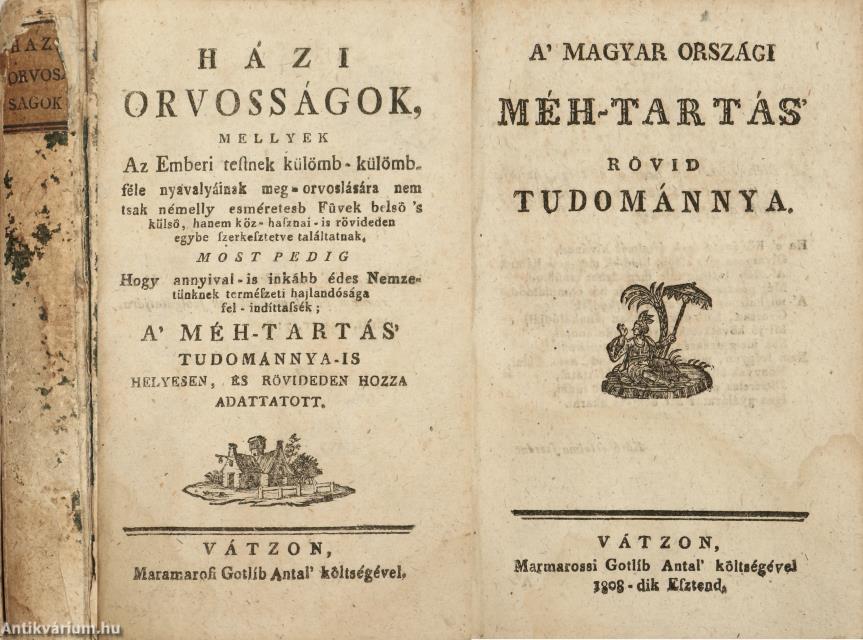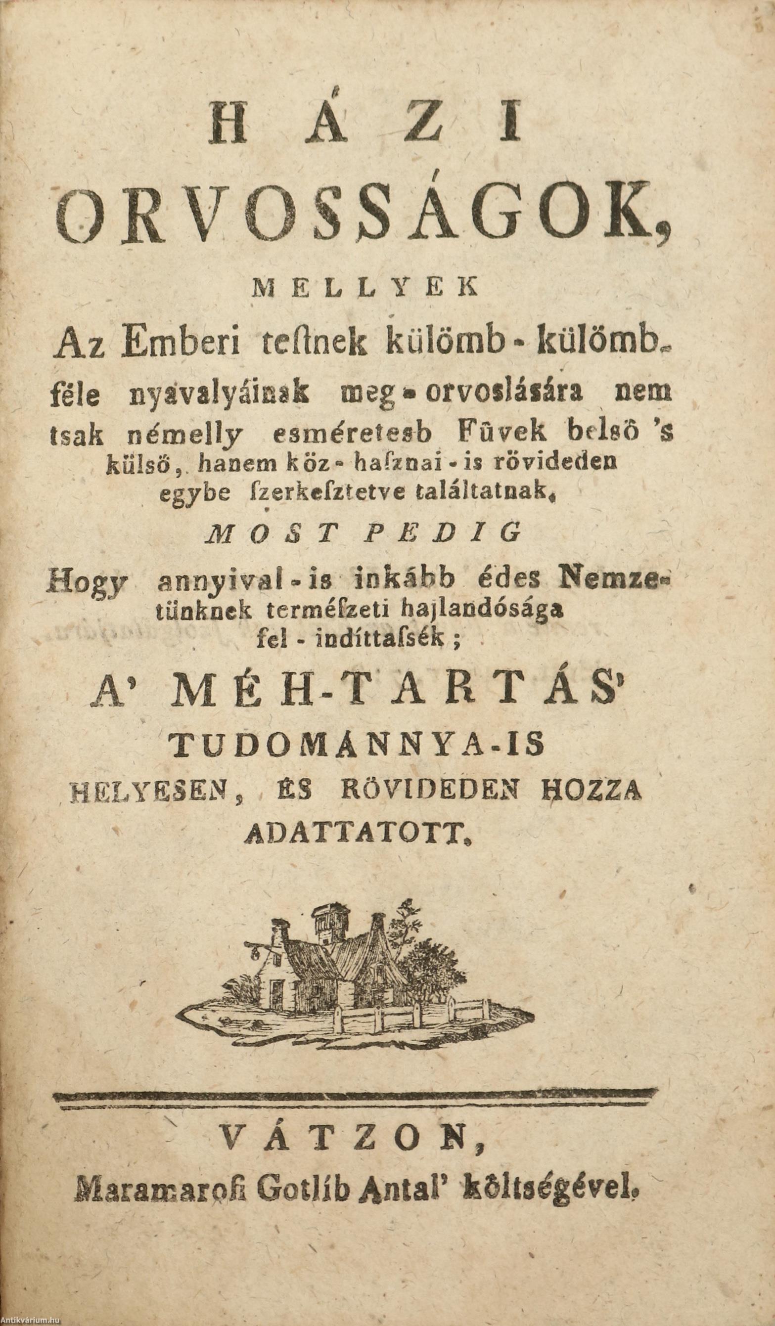 1.) Házi orvosságok, mellyek az Emberi testnek külömb-külömb féle nyavalyáinak meg-orvoslására nem tsak némelly esméretesb Füvek belső 's külső, hanem köz-hasznai is rövideden egybe szerkesztve találtatnak... Vátzon, é. n., Maramarosi Gotlíb Antal' költségével, 181 p. + [11] p.