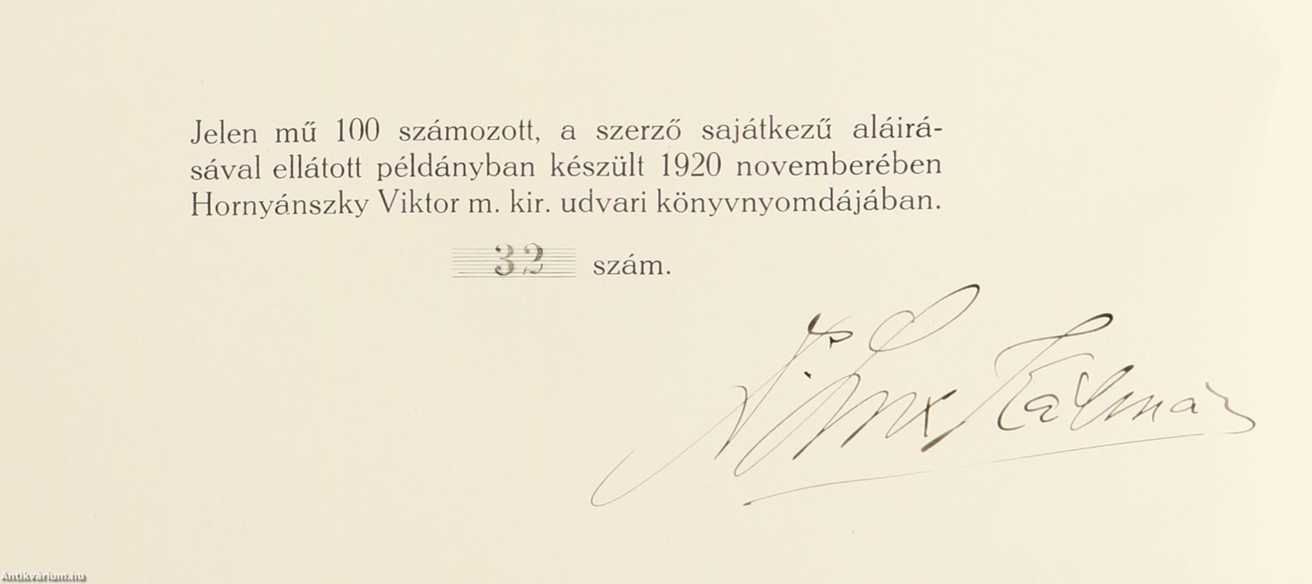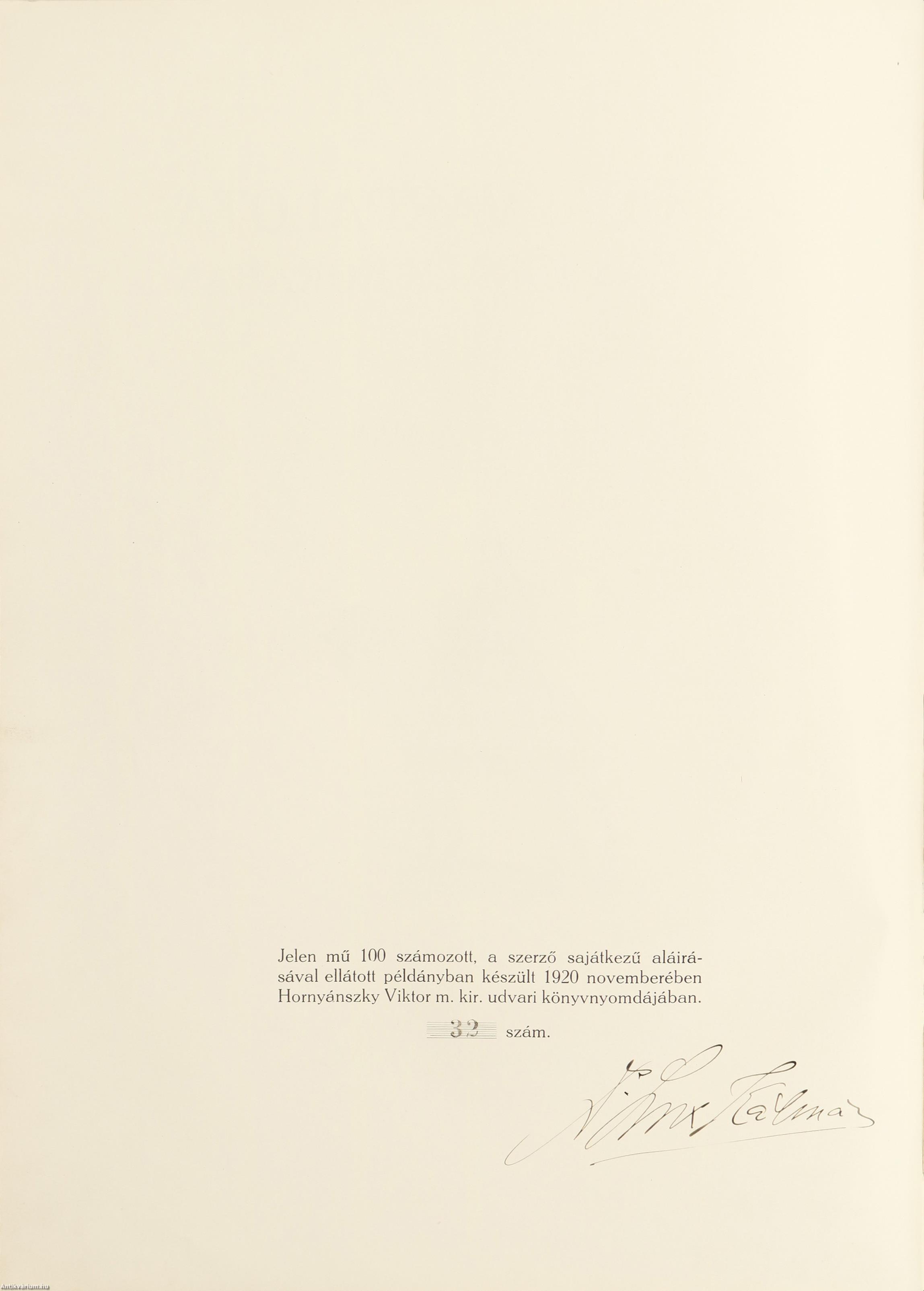 "Jelen mű 100 számozott, a szerző sajátkezű aláírásával ellátott példányban készült 1920 novemberében Hornyánszky Viktor m. kir. udvari könyvnyomdájában." Ez a 32. számú példány.