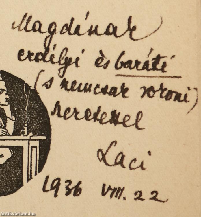A címlapon a szerző, Cs. Szabó László tollal beírt, névre szóló dedikációja olvasható: "M.-nak erdélyi és baráti (s nem csak rokoni) szeretettel Laci. 1936. VIII. 22."