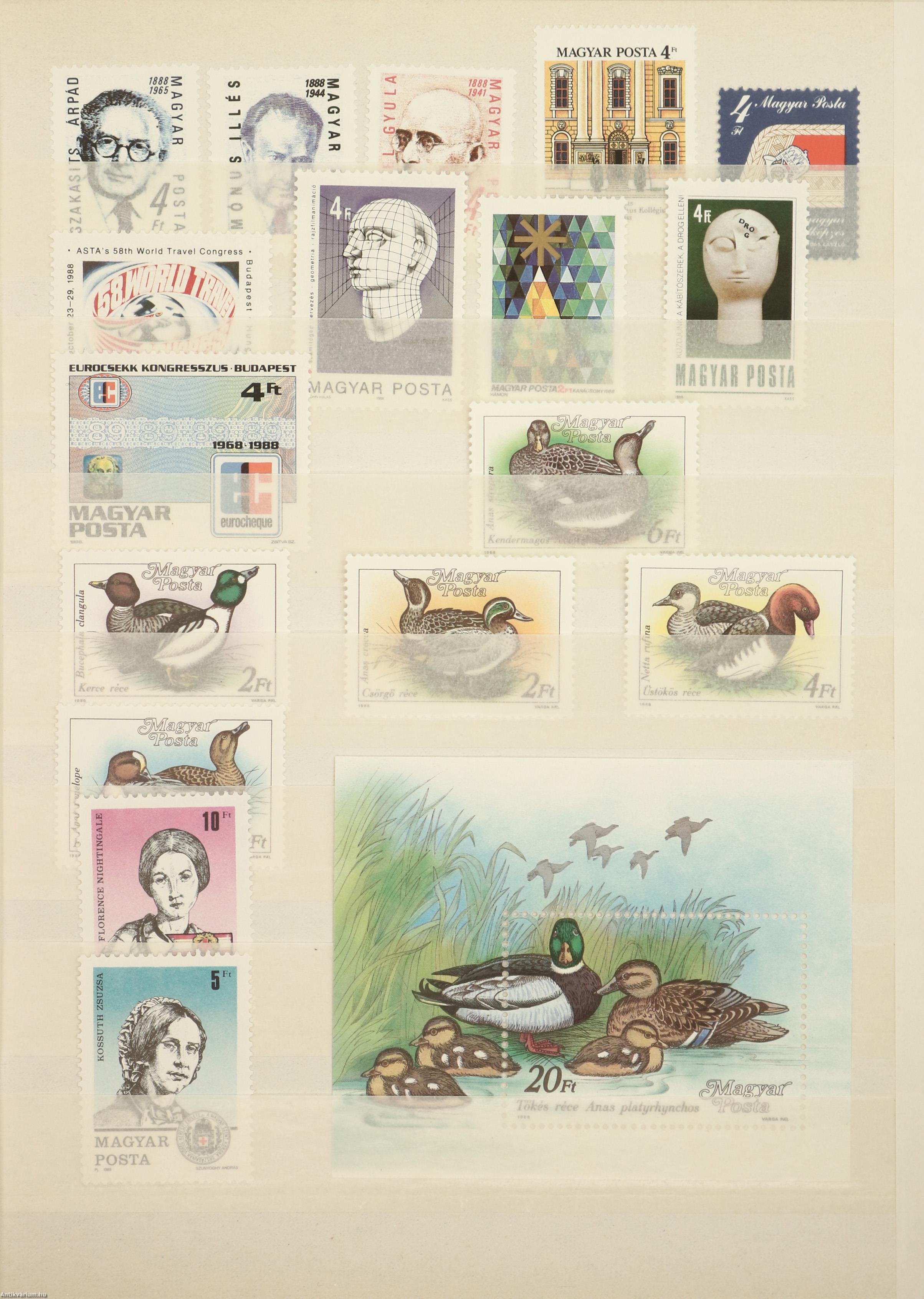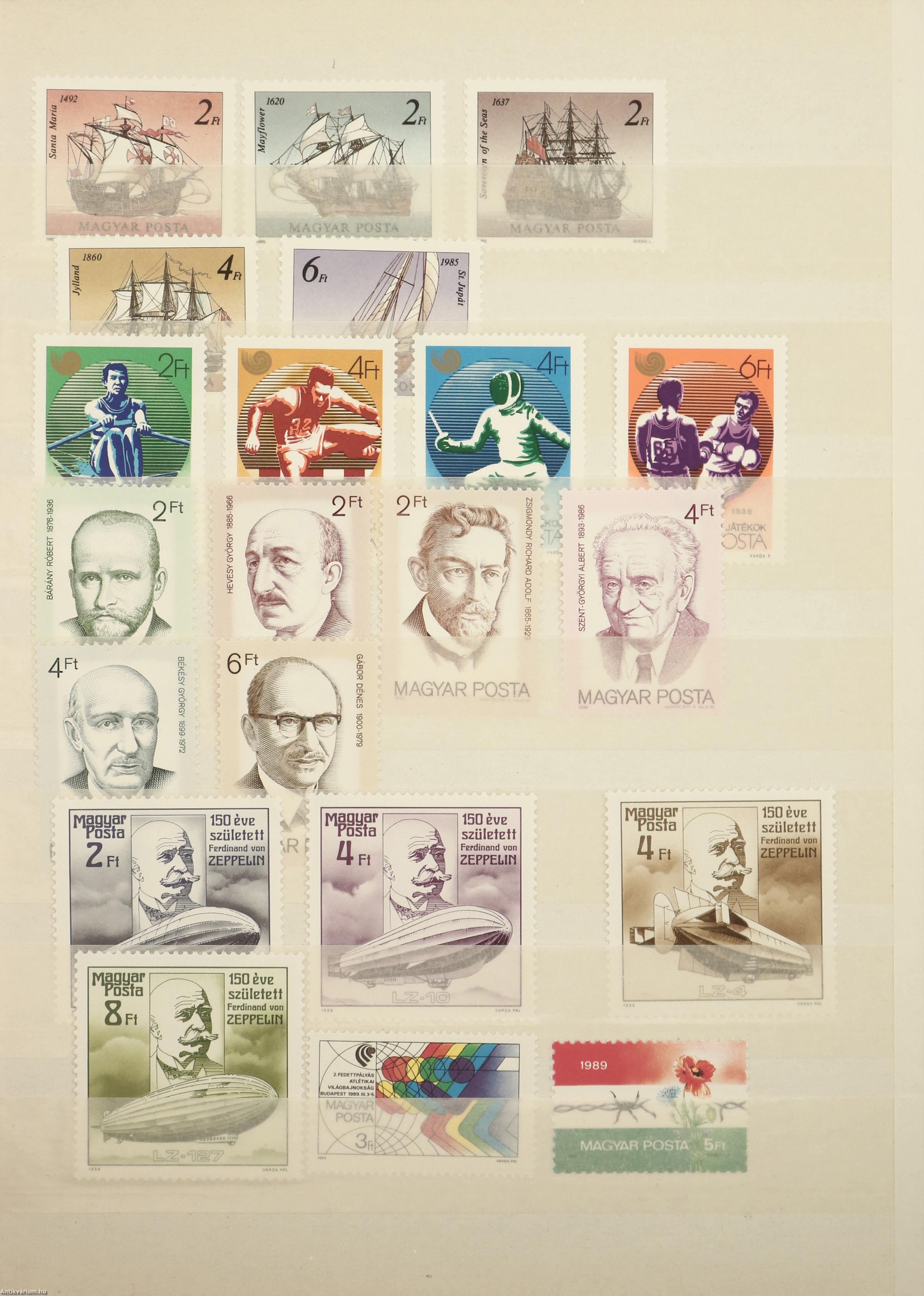A gyűjtemény darabjai 8 kétoldalas, egymástól hártyapapírral elválasztott, bélyeggyűjtésre kialakított táblán helyezkednek el, melyből 1 tábla üres, gyűjtésre alkalmas. Nagyrészt sorozatokból áll össze (közülük nem mindegyik teljes), de megtalálható benne több önálló bélyeg is. Egyes bélyegekből és blokkokból több példány is van a kötetben. Az összeállításnak részét képezi néhány bélyegnapra és bélyegkiállításra, különböző olimpiákra (XV. Téli Olimpia Calgary /1988/, XXIV. Nyári Olimpia Szöul /1988/ stb.) és világbajnokságokra (Műkorcsolyázó Világbajnokság /1988/, Fogathajtó Világbajnokság /1989/, stb.), illetve évfordulókra, jubileumokra, konferenciákra (175 éve született Liszt Ferenc, A Kommunista Ifjúsági Szövetség zászlóbontásának 30. évfordulójára, A francia forradalom kétszázadik évfordulója, 20 éve járt az első ember a Holdon, stb.) készített, valamint művészettel és természettel foglalkozó bélyeg és bélyegsorozat.