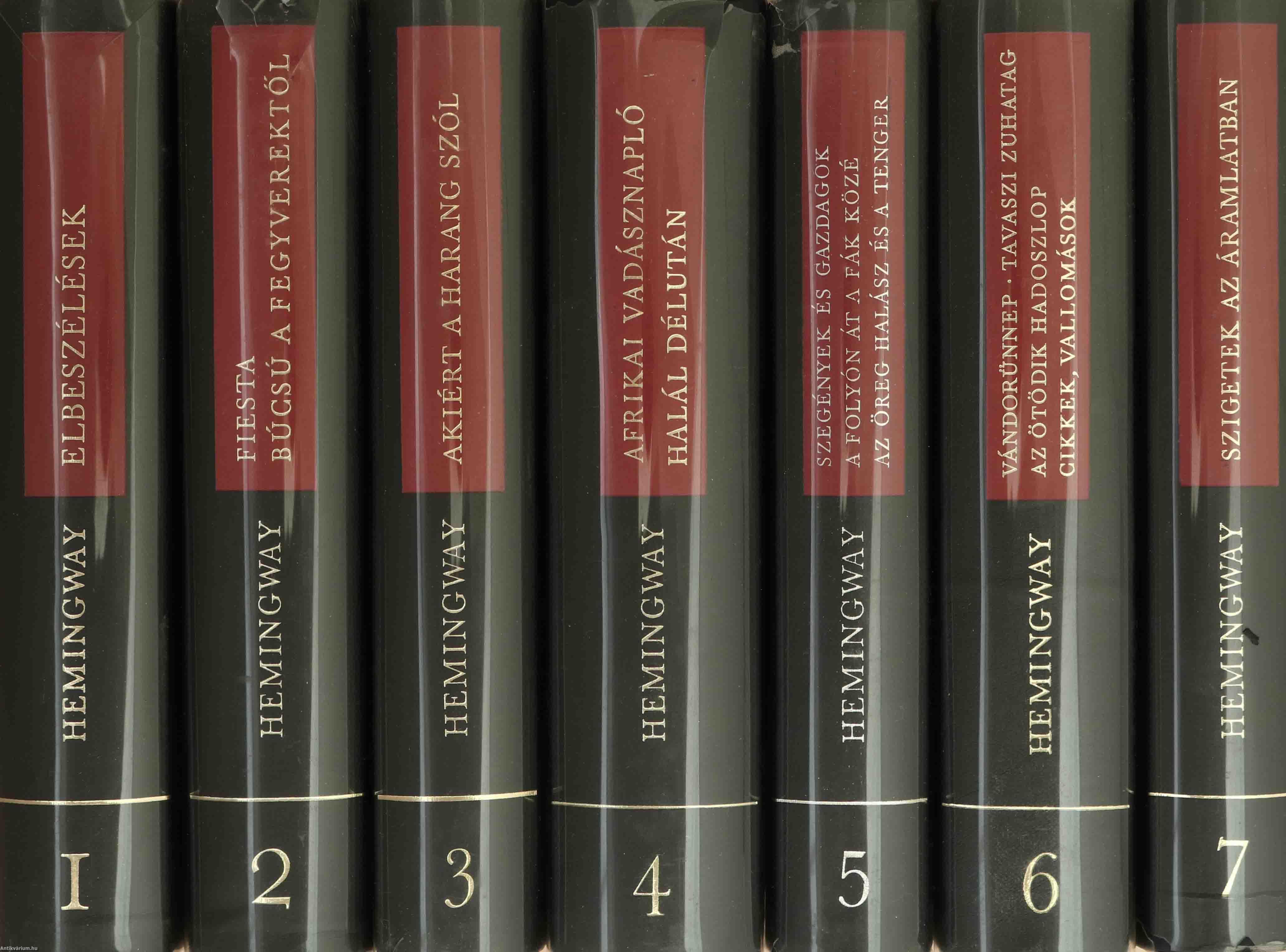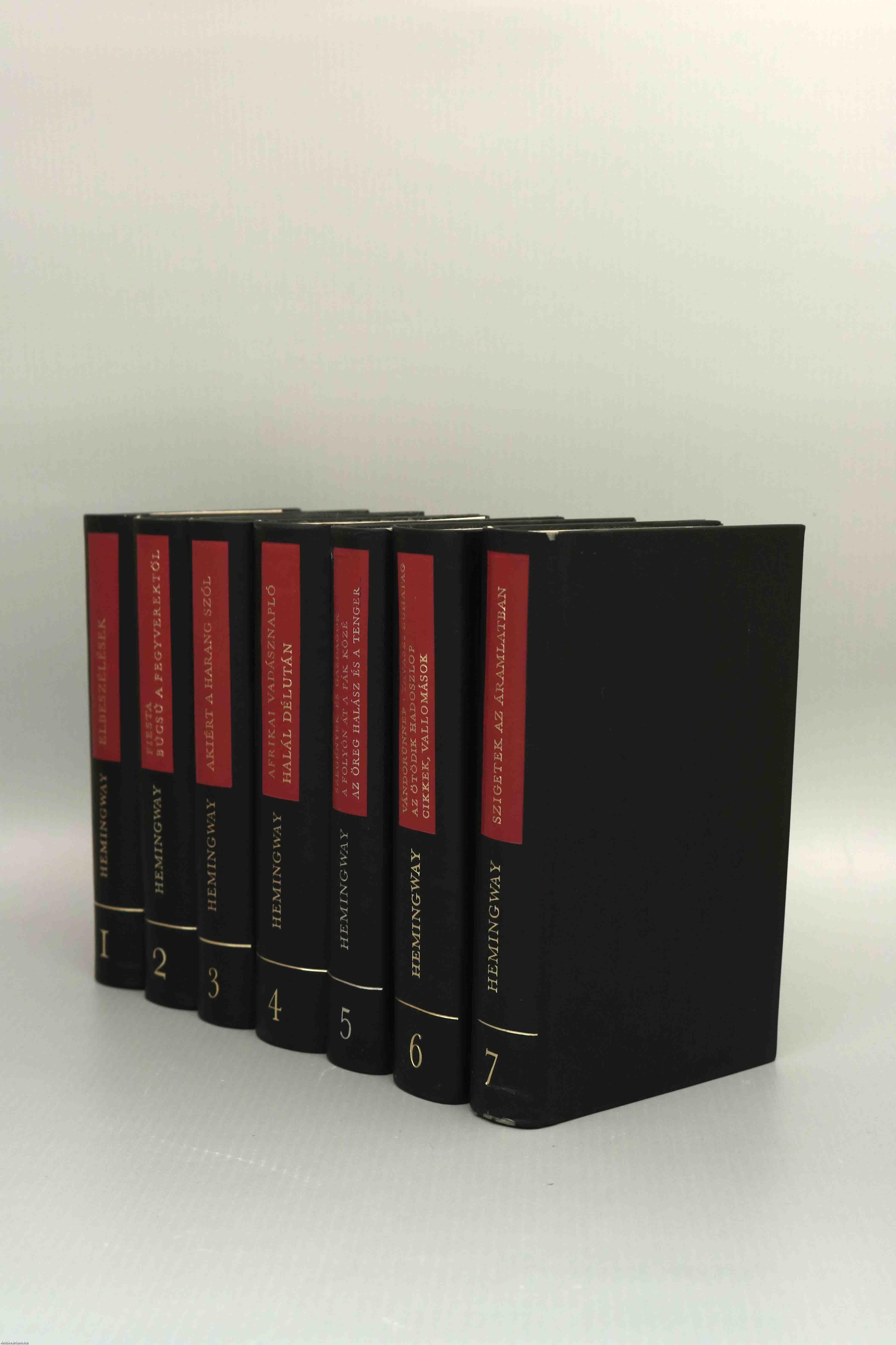 1. Elbeszélések 2. Fiesta/Búcsú a fegyverektől 3. Akiért a harang szól 4. Afrikai vadásznapló/Halál délután 5. Szegények és gazdagok/A folyón át a fák közé/Az öreg halász és a tenger 6. Vándorünnep/Tavaszi zuhatag/Az ötödik hadoszlop/Cikkek, vallomások 7. kötet: Szigetek az Áramlatban