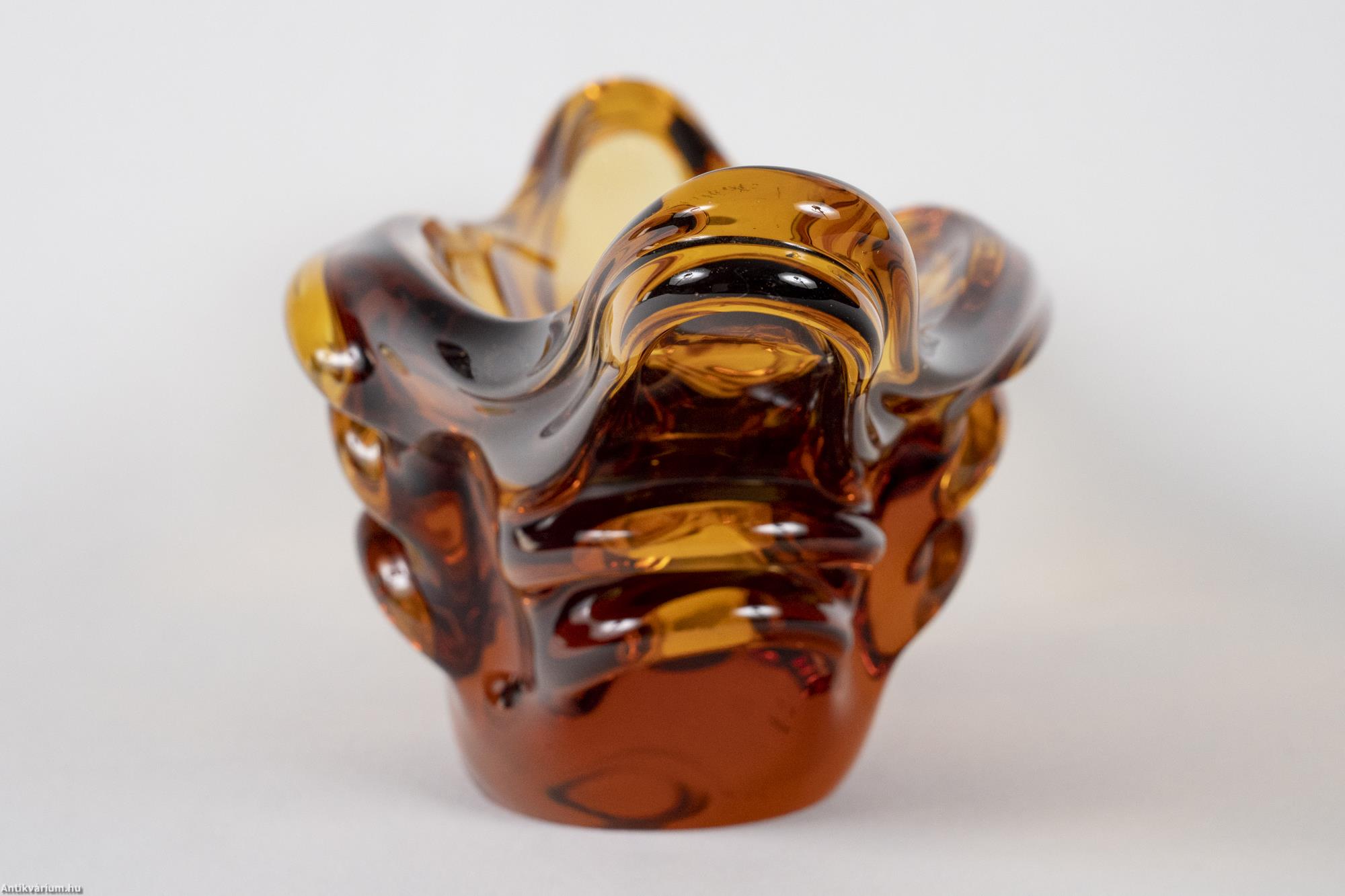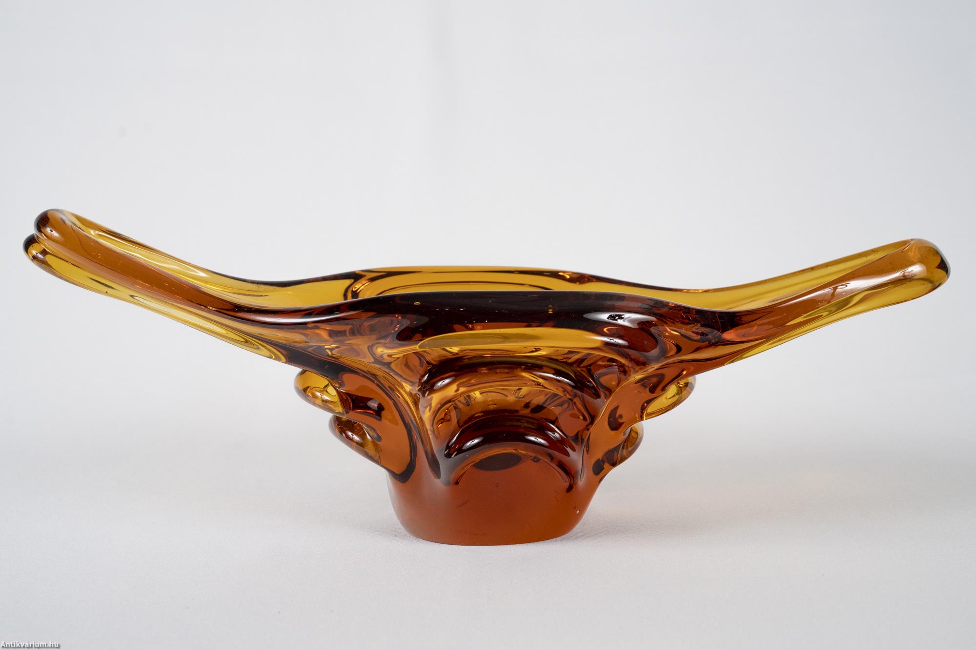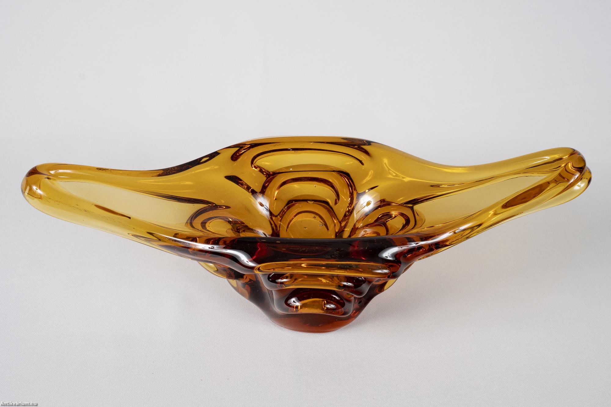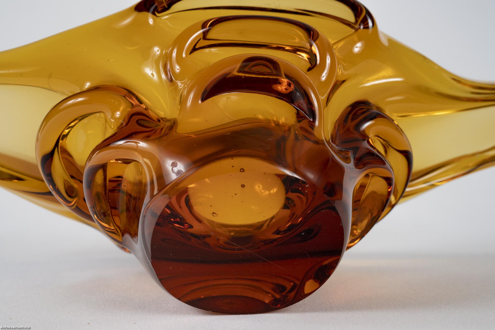 Hibátlan állapotú Parádi borostyán színű üveg tál. Fújt és kézzel formázott, tömör üveg tál különböző vastagságú, de azonos színű üvegrétegekkel. Hosszanti irányban erősen nyújtott formája kis felületű lapra csiszolt talpon áll. Ez a kontrasztos kialakítású forma mégis stabil, köszönhetően a vastag üvegrétegnek és a remek formai tervezésnek. Készítésének ideje a 20. század második fele.