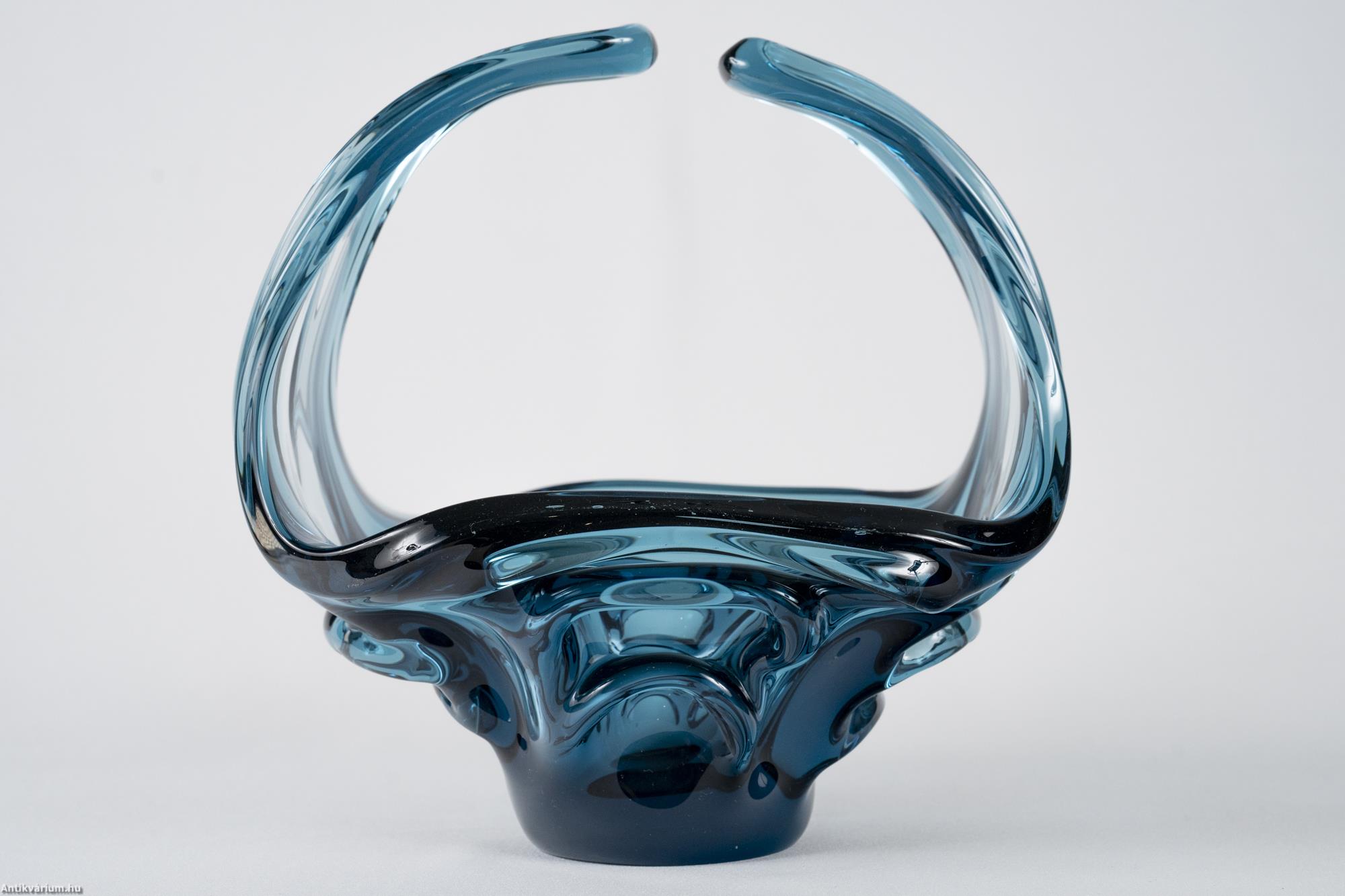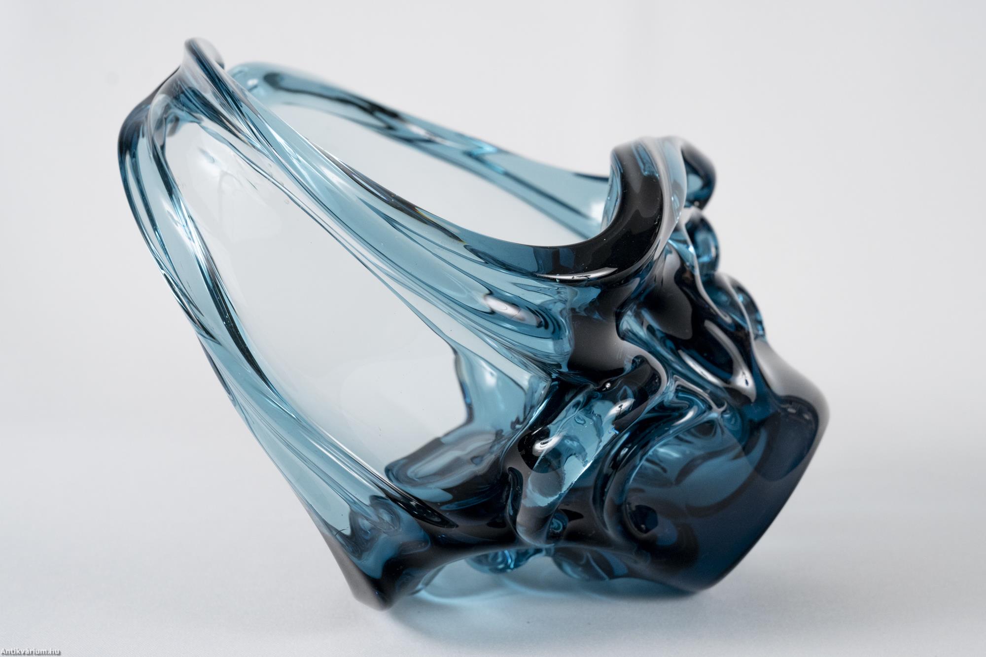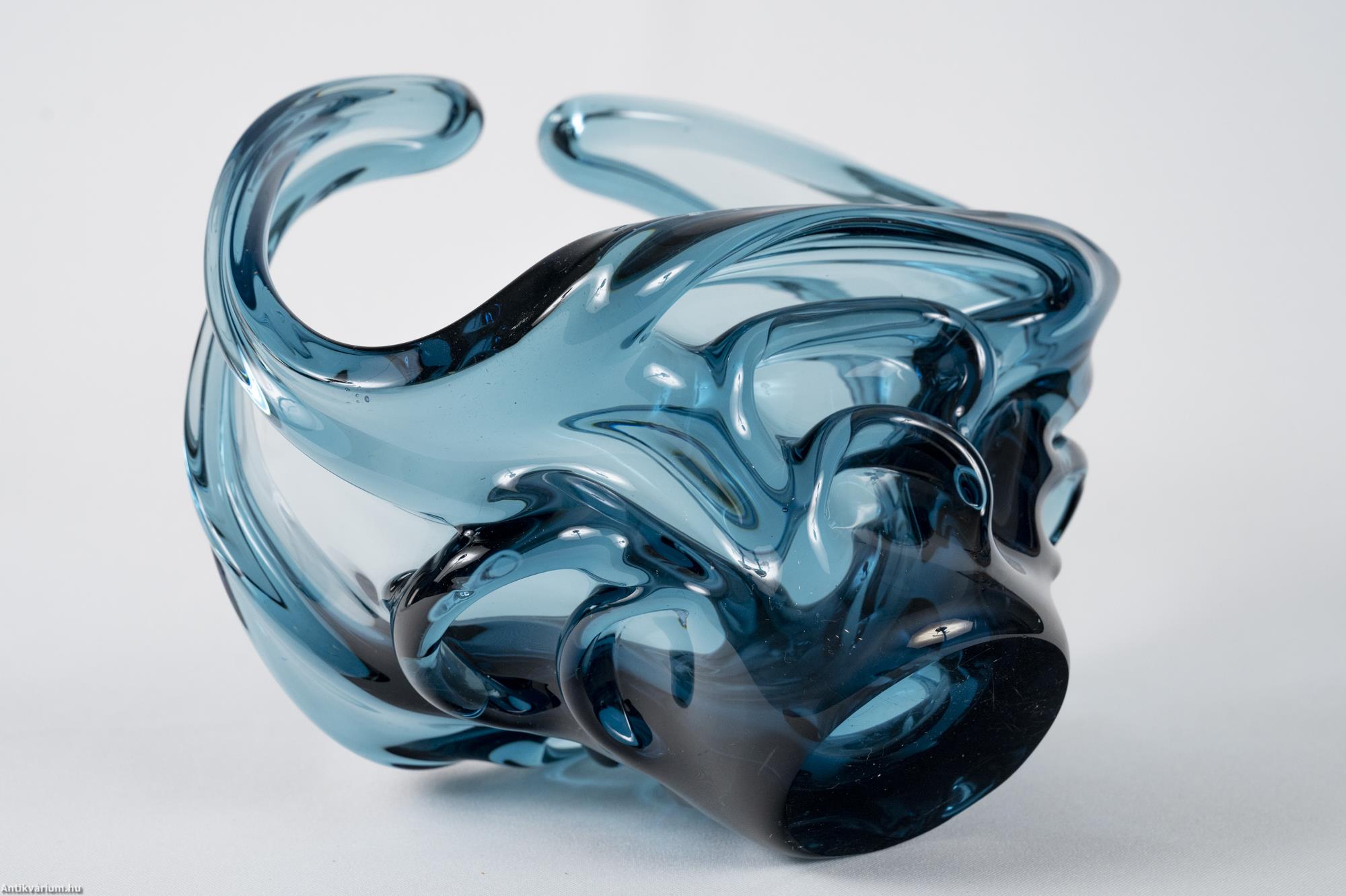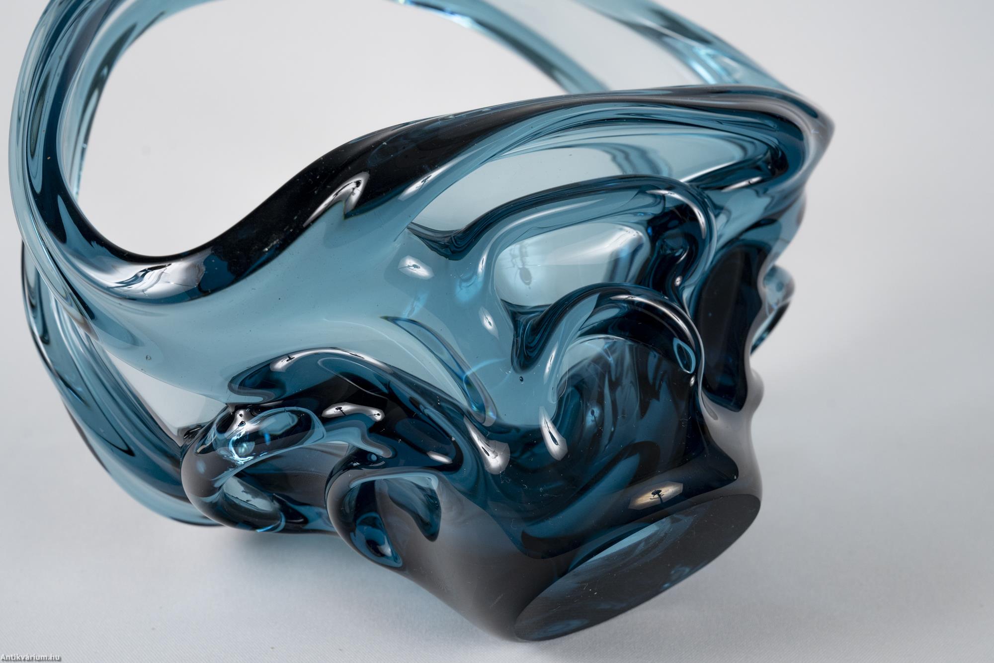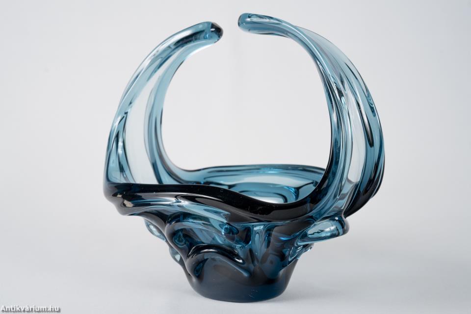 Hibátlan állapotú Parádi türkizkék üveg tál. Fújt és kézzel formázott, tömör üveg tál különböző vastagságú, de azonos színű üvegrétegekkel. A perem folytatásaként magasodó kétoldali széles üvegszál alkotja a tál két íves fogantyúját, amelyek szinte összeérnek. Ez a hullámmintás hatás adja az üveg tál egyedien organikus, vízhatású dizájnját. Magas és hosszanti irányban erősen nyújtott alakja kis felületű lapra csiszolt talpon áll. Ez a kontrasztos kialakítású forma mégis stabil, köszönhetően a vastag üvegrétegnek és a remek formai tervezésnek. Készítésének ideje a 20. század második fele.
