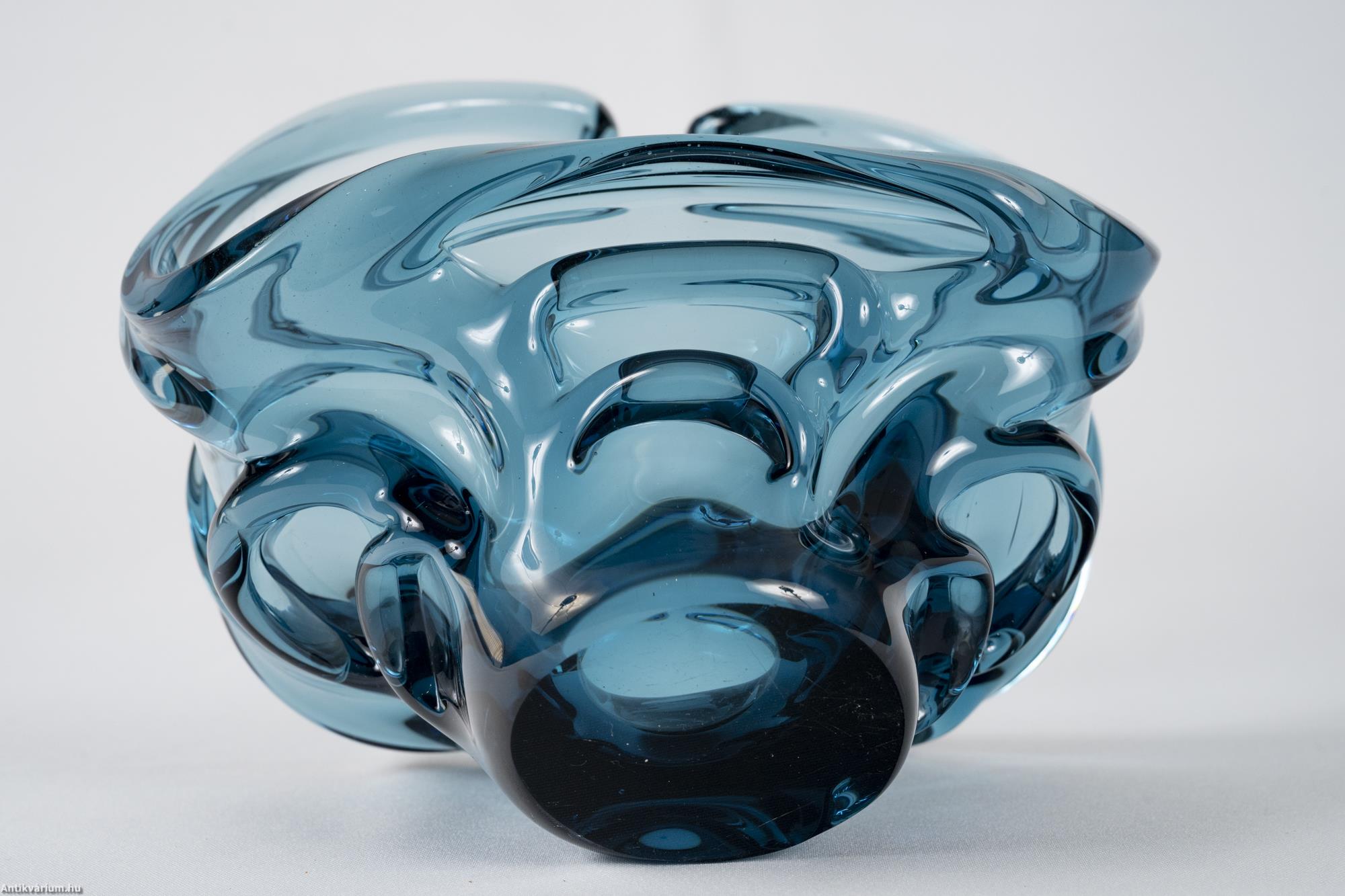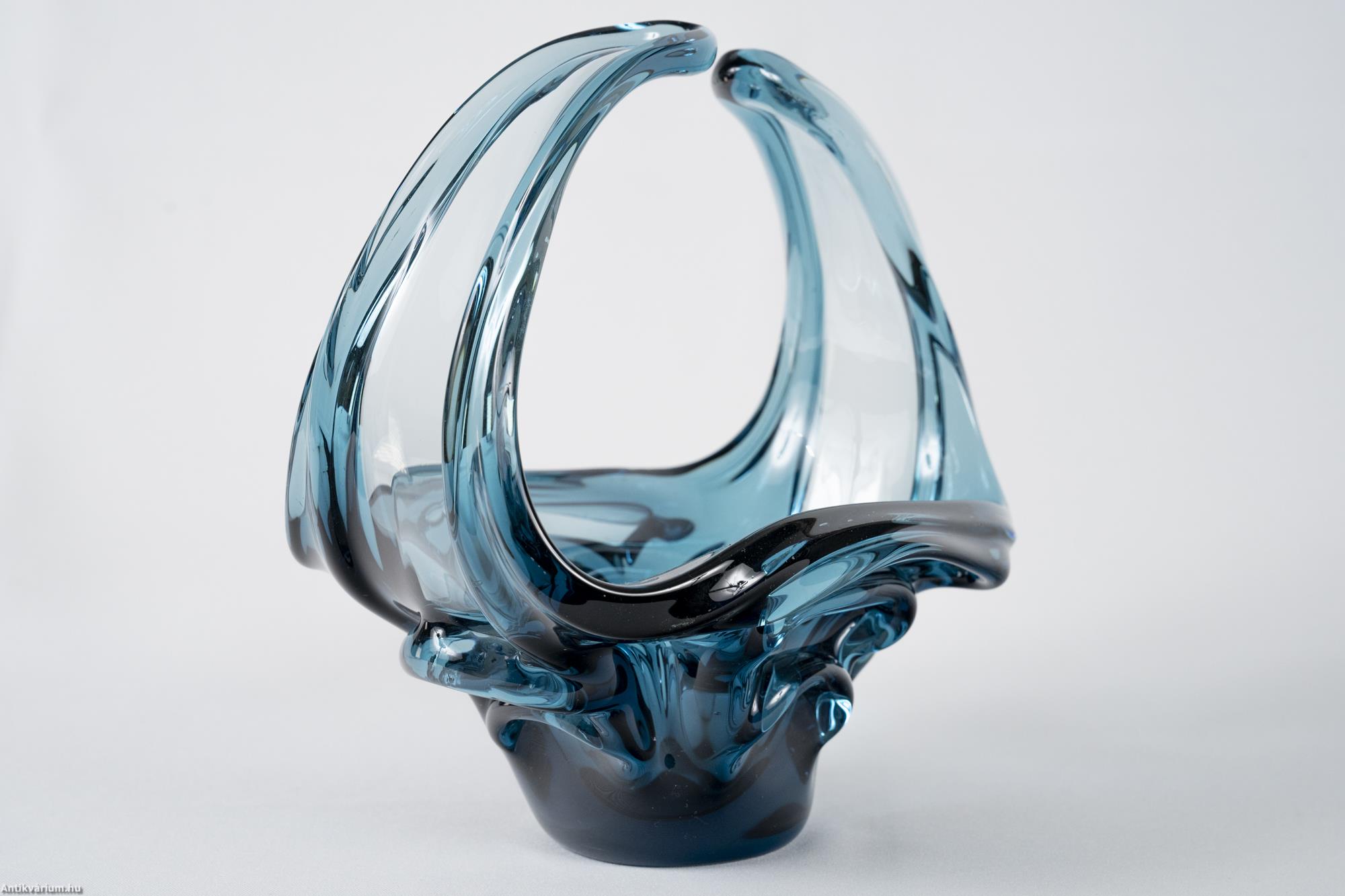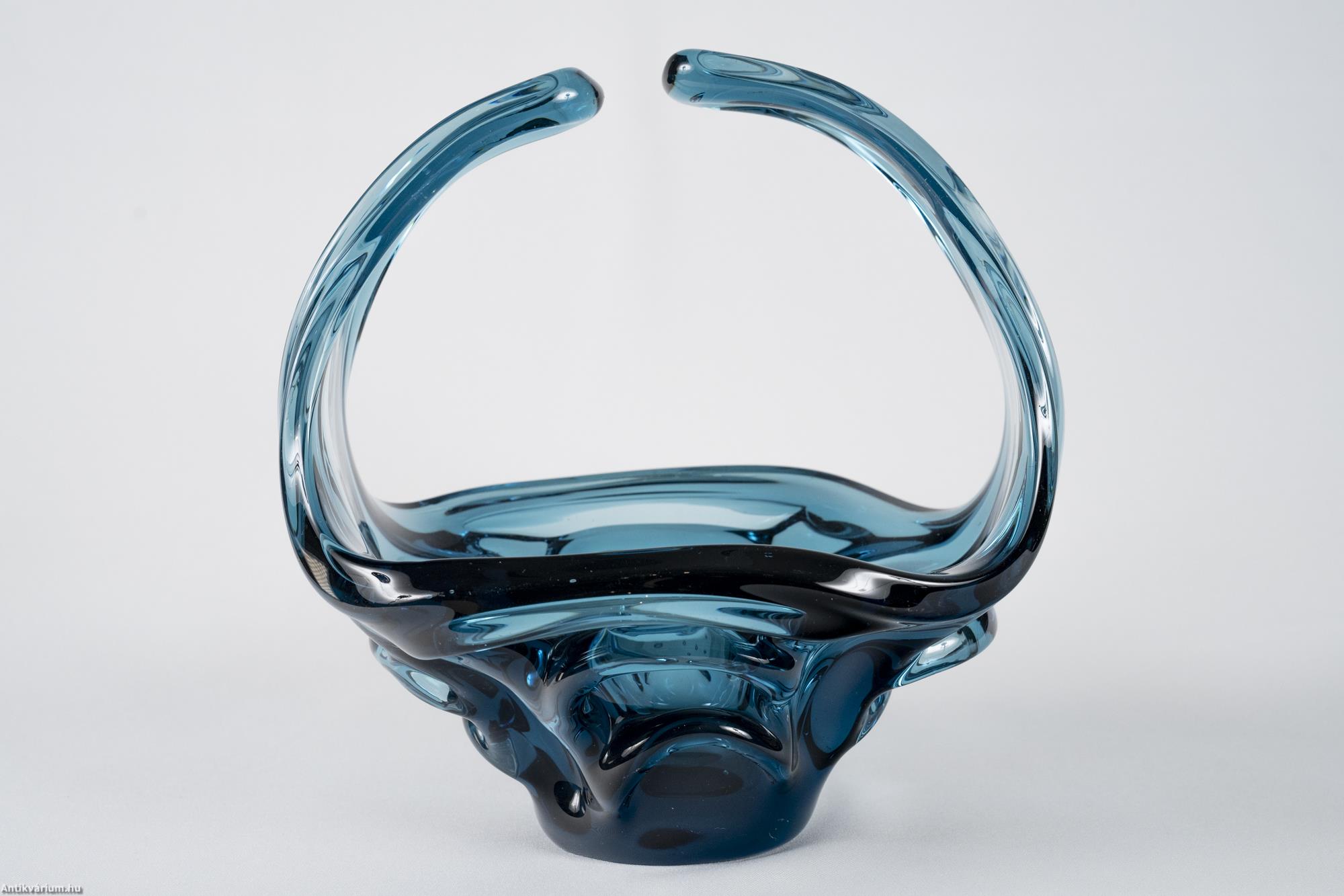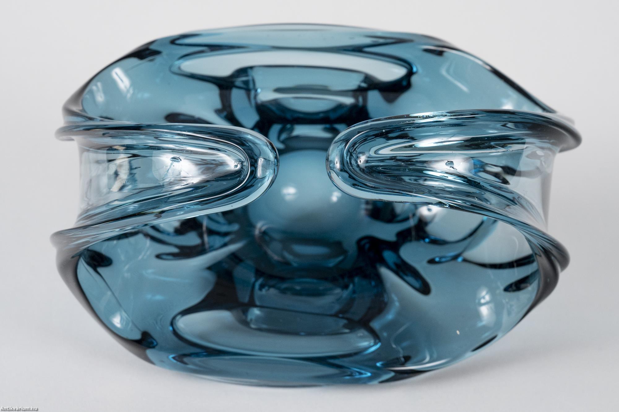 Hibátlan állapotú Parádi türkizkék üveg tál. Fújt és kézzel formázott, tömör üveg tál különböző vastagságú, de azonos színű üvegrétegekkel. A perem folytatásaként magasodó kétoldali széles üvegszál alkotja a tál két íves fogantyúját, amelyek szinte összeérnek. Ez a hullámmintás hatás adja az üveg tál egyedien organikus, vízhatású dizájnját. Magas és hosszanti irányban erősen nyújtott alakja kis felületű lapra csiszolt talpon áll. Ez a kontrasztos kialakítású forma mégis stabil, köszönhetően a vastag üvegrétegnek és a remek formai tervezésnek. Készítésének ideje a 20. század második fele.