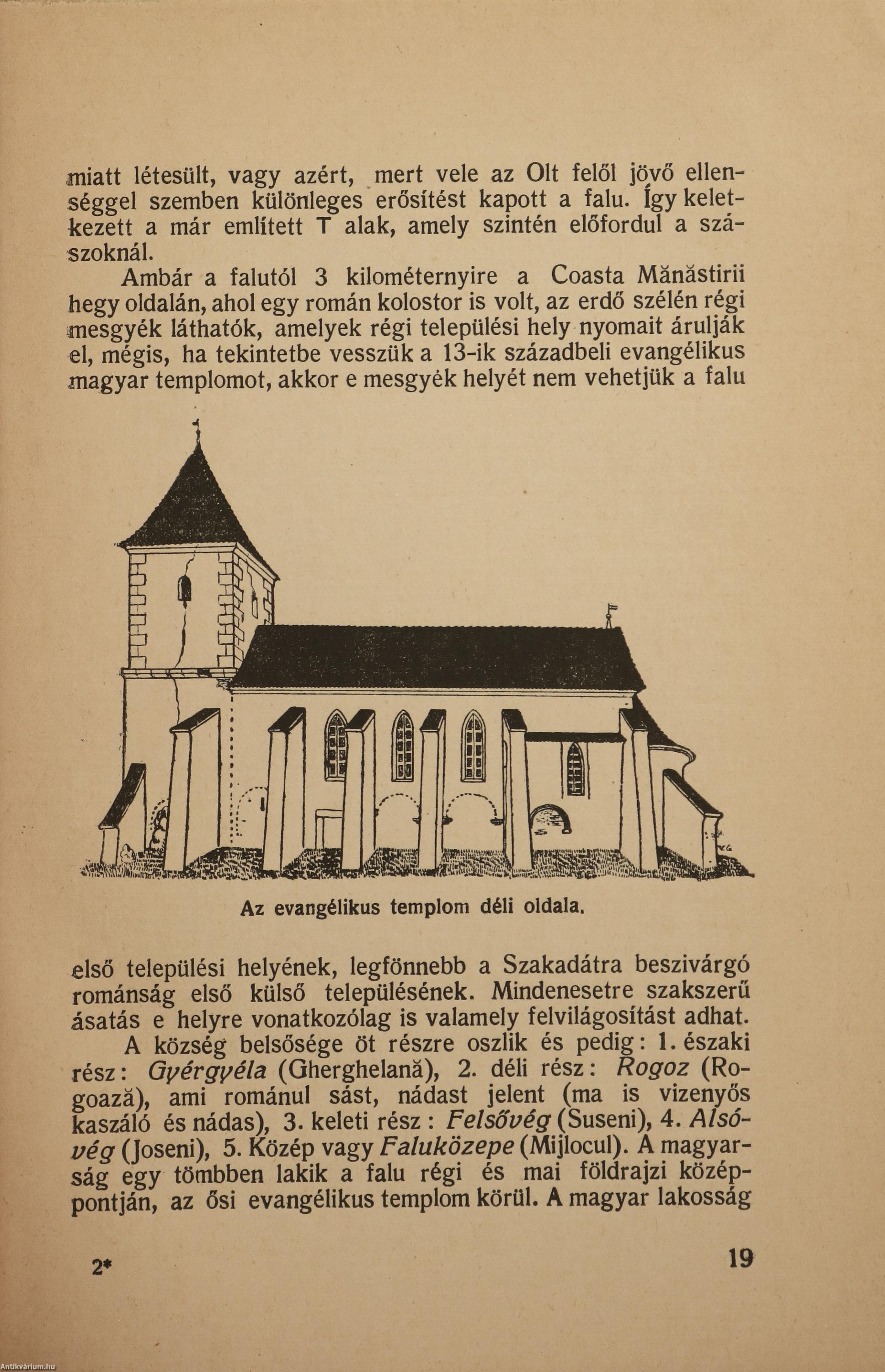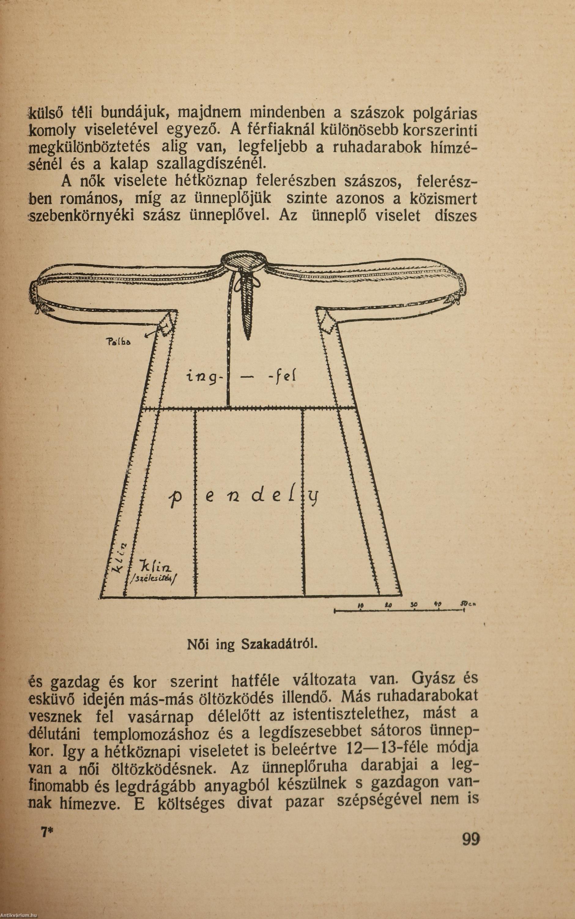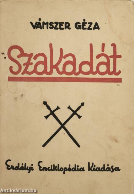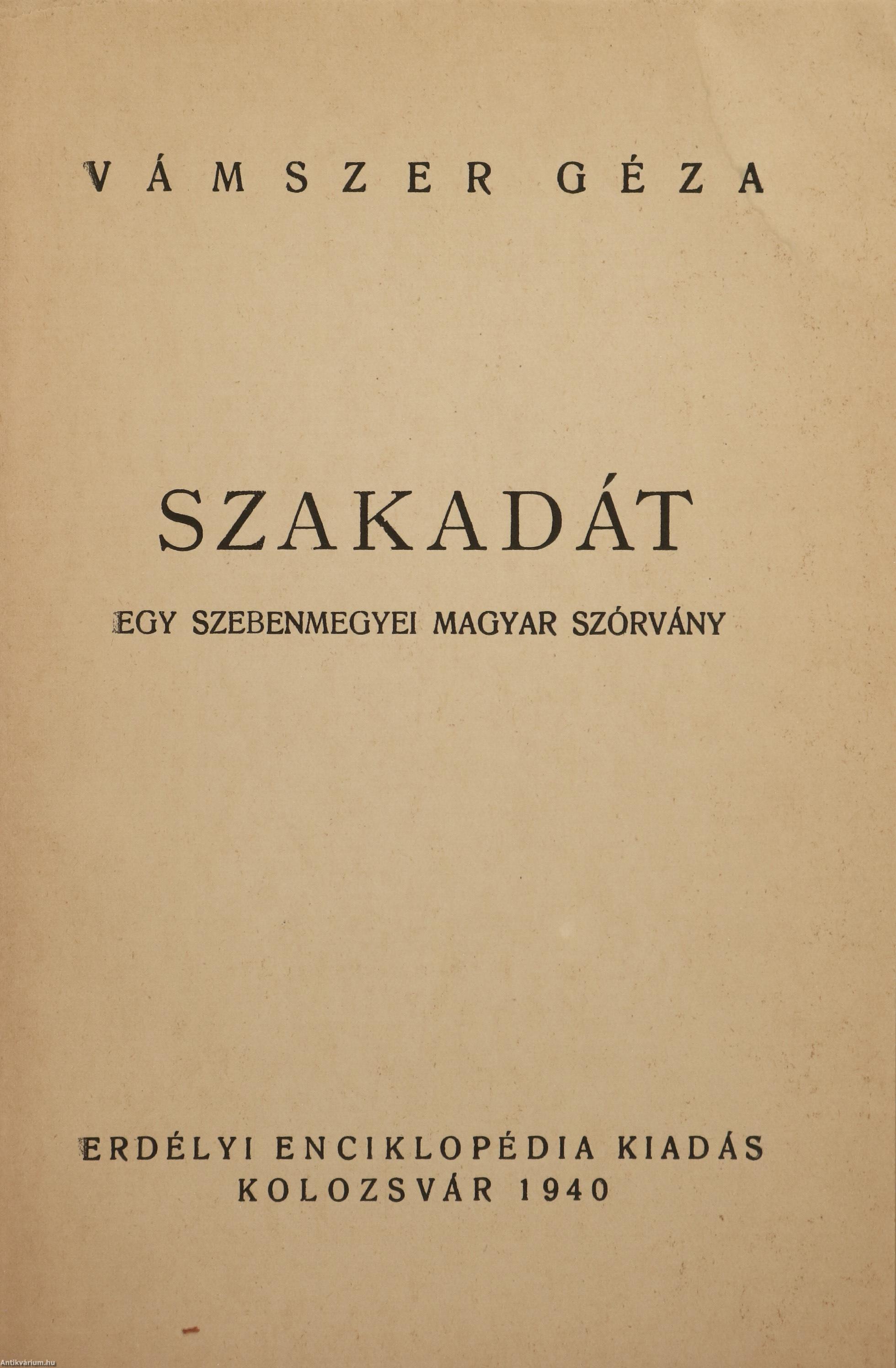 Első kiadás. Az Erdélyi Enciklopédia Könyvei. No.: 6. sz. Szakadát. Egy szebenmegyei magyar szórvány. Írta: Vámszer Géza. Számos szöveg közti, fekete-fehér, feliratos rajzzal, 2 képtáblán Fischer József 19 fekete-fehér, feliratos felvételével és 1 kötetvégi, kihajtható, fekete-fehér, magyarázattal ellátott, feliratos térképvázlattal (Oltszakadát község belsőségének vázlatos térképe) illusztrált, valamint szerzői bevezetéssel, jegyzetekkel, zárszóval és részletes tartalomjegyzékkel kiegészített kiadás. Nyomtatta a Grafica Könyvnyomda, Kolozsvárott (Cluj). Kiadói varrott papírkötésben lévő példány feliratozatlan címfedéllel, hátlappal és könyvgerinccel, néhány nedvességtől foltos lappal, hiánytalan állapotban, két színnel feliratozott, illusztrált, fülszöveges, foltos kiadói borítófedélben. A kötet szerzője, Vámszer Géza (Nagyszeben, 1896. augusztus 13. – Kolozsvár, 1976. szeptember 21.) erdélyi néprajzkutató, művészettörténész, középiskolai tanár. Sokáig járta a Székelyföld falvait, gyűjtőmunkája útján fényképek és rajzok segítségével örökítette meg a székelység életmódját, művelődéstörténeti értékeit és sajátos népi kultúráját. Kezdetben általános néprajzzal foglalkozott, később áttért a településtörténet és a falusi népi egyházművészet alapos kutatására. Életpályájának meghatározó állomása volt Csíkszereda, ahol 1929-1941 között a Római Katolikus Főgimnáziumban tanított. Tanári tevékenysége mellett bekapcsolódott a turistamozgalom és természetjárás megszervezésébe, 1931-ben az ő kezdeményezésére jött létre a Csíki Turista Egyesület. Diákjaival együtt bejárta a csíki, gyergyói, kászoni és gyimesi településeket. Fontos szerepet vállalt a csíki székely népviselet, népzene és néptánc szélesebb közönség előtt való megismertetésében is. Tanulmányozta az általa feltárt csíkrákosi Cserei-kúria falfestményeit, irányításával sikerült helyreállítani a csíkdelnei Szent János templomot. Ugyancsak az ő kezdeményezésére került sor a hosszúaszói Xántus-Kápolna romjainak feltárására. Megtervezte a csíkszeredai Márton Áron Gimnázium kápolnájának oltárát, amely az első népies stílusban készített berendezés volt a Székelyföldön. 1930 pünkösdjén Domokos Pál Péterrel és Nagy Imrével közösen egy nagyszabású művészettörténeti és néprajzi kiállítással fogadták a csíksomlyói pünkösdi búcsúra érkezőket. Az általuk összegyűjtött és kiállított anyag képezte a későbbi híres Csíki Székely Múzeum alapjait.