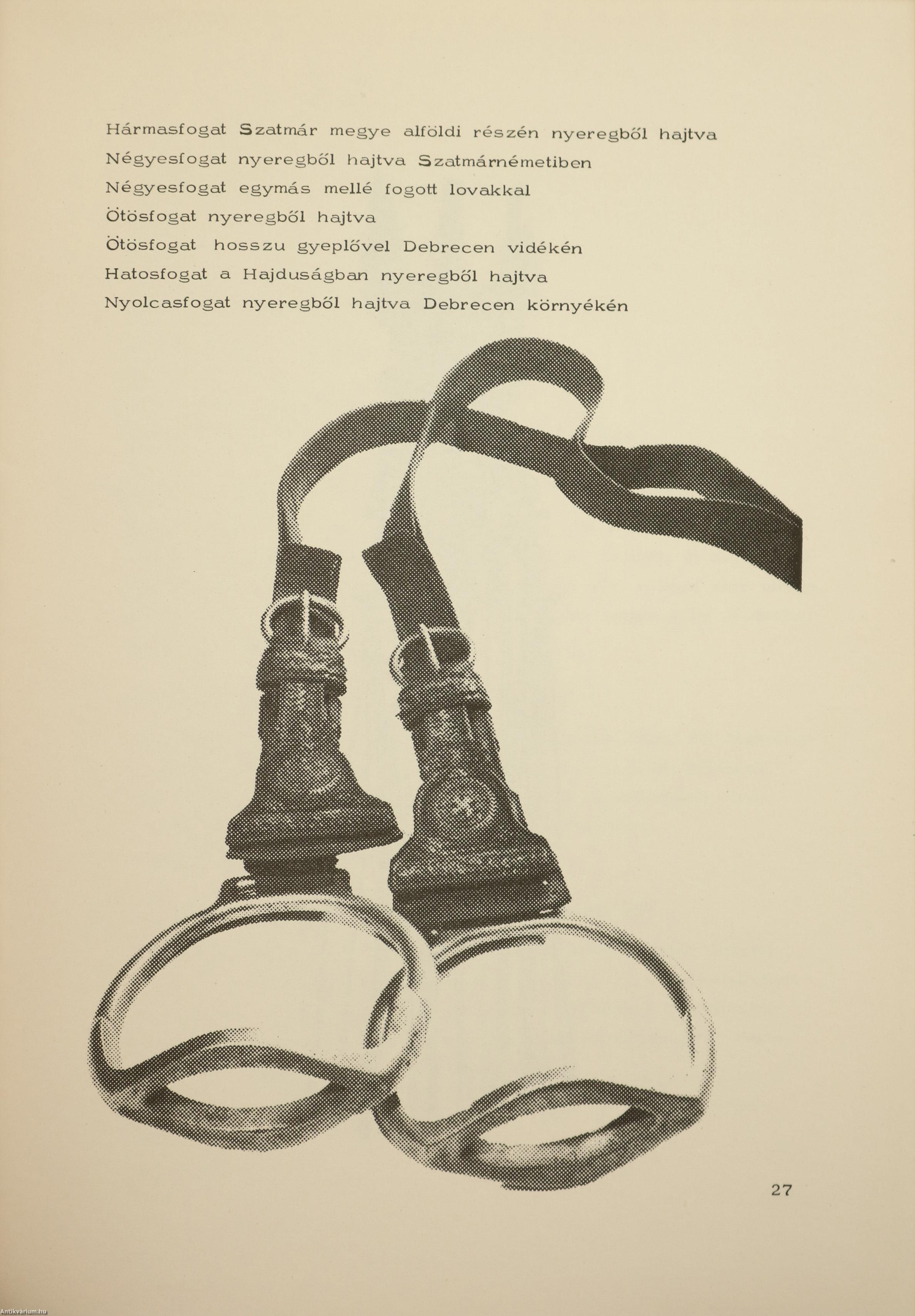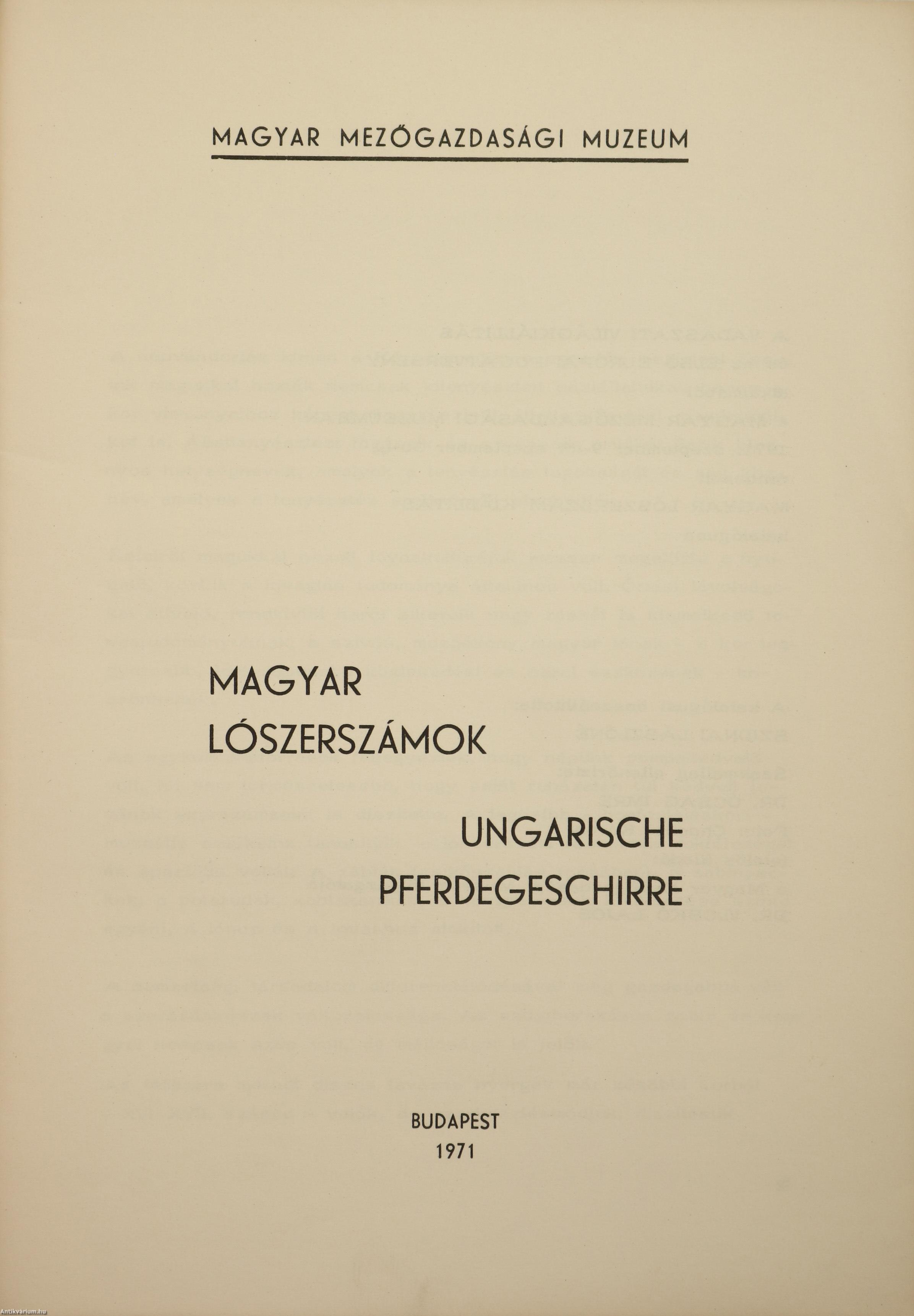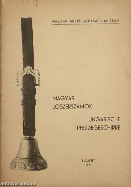 Magyar lószerszámok. / Ungarische Pferdegeschirre. A katalógust összeállította: Szidnai Lászlóné. Magyar és német nyelvű kiadás. A Vadászati Világkiállítás és az Első Európai Fogatverseny alkalmából a Magyar Mezőgazdasági Múzeumban 1971. szeptember 9-től szeptember 30.-ig rendezett Magyar Lószerszám Kiállítás katalógusa. Néhány szöveg közti fényképpel és 26 képtáblával illusztrált kötet. Fotó: Chochol Károly. Készült a Keszthelyi Agrártudományi Egyetem Sokszorosító Részlegében rotaprint lemezről. Kiadói tűzött papírkötésben lévő példány feliratozott, illusztrációval ellátott címfedéllel, feliratozatlan könyvgerinccel és hátlappal, hiánytalan állapotban. Részlet a könyvből: "...A kiállítási anyag könnyebb áttekintése érdekében csoportositjuk a hámjainkat. I. Csipkés veretü, csipkézett bőrdiszitésü hámok. II. Sima veretü hámok. A csipkés veretü, csipkézett bőrdiszitésü hámok minden korban elegánsabbak voltak. A kivitelezés módja szerint nehezebb és könnyebb kivitelben készülhetnek. A csipkés veretnél még régebbi a debreceni hámon látható veretek. A nehéz szerszámzat fékje és hámja gazdagon diszitett, de diszitése sohasem nehézkes. A hám huzója és kápája régen hámcsülökben végződött. A kápa vasváza, a tartószijkarika, a huzócsat később lett divatos..."
