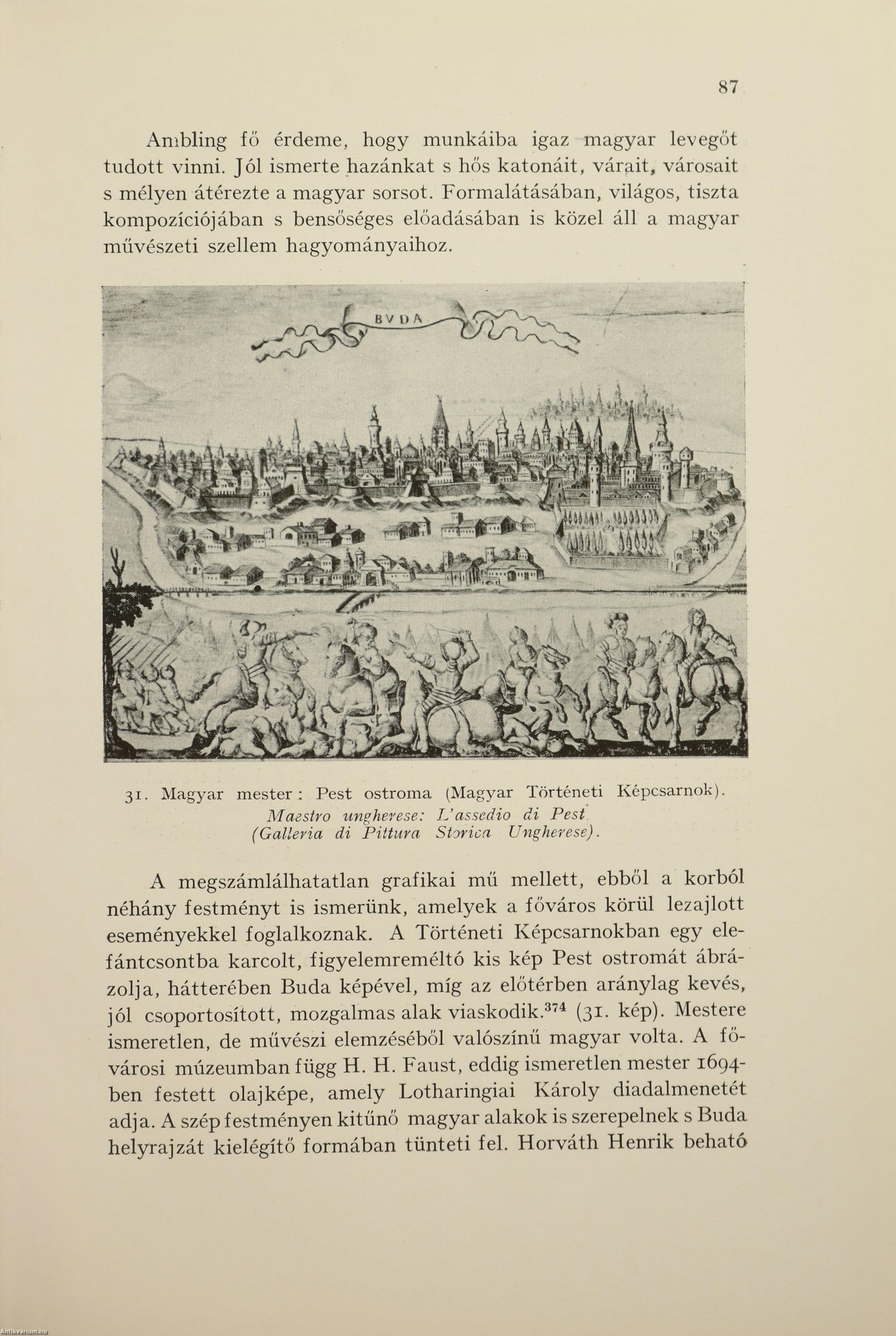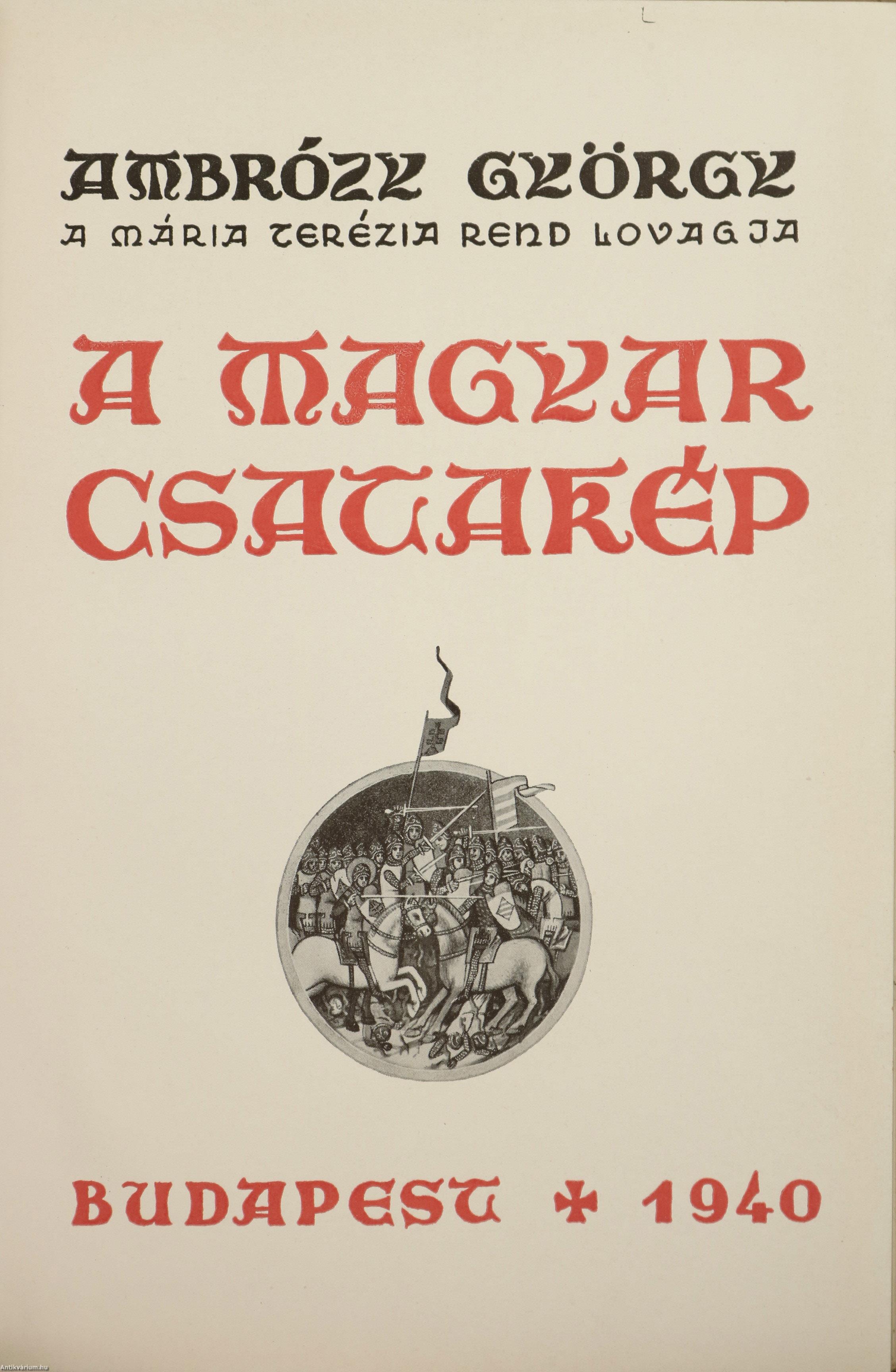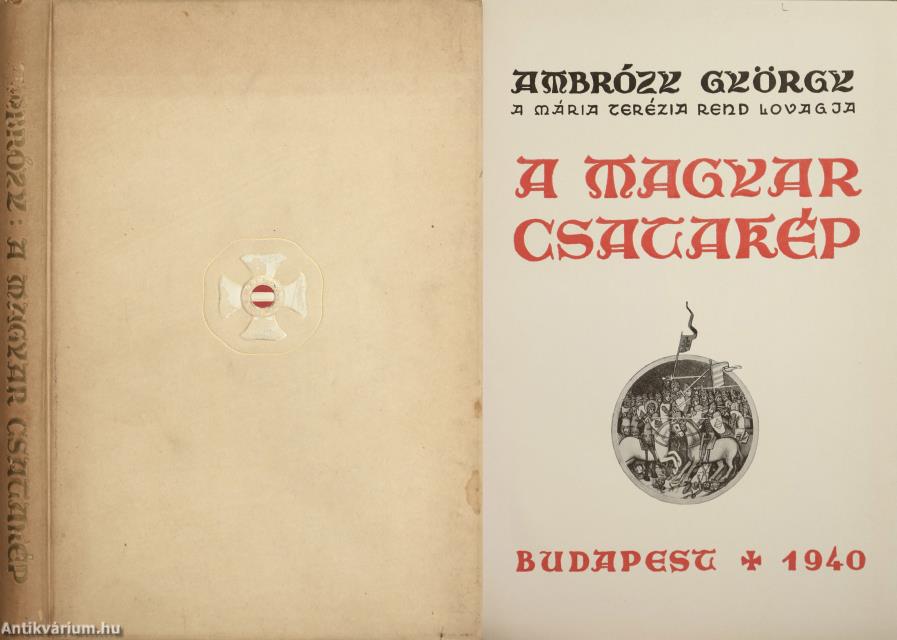 Első kiadás. A Budapesti Kir. Magyar Pázmány Péter Tudományegyetem Művészettörténeti és Keresztényrégészeti Intézetének dolgozatai. No.: 65. sz. Igazgató: Gerevich Tibor. A magyar csatakép. / La battaglia nell'antica arte ungherese. Írta: Ambrózy György a Katonai Mária Terézia Rend lovagja. 70 fekete-fehér, feliratos képpel és egy díszcímlappal illusztrált, valamint kétnyelvű (magyar-olasz) címlappal, előszóval, olasz nyelvű összefoglalóval, a sorozatban megjelent könyvek listájával és tartalomjegyzékkel ellátott kötet. Az előzéklapon tollal írt számjelzés és Tiszteletpéldány bélyegzés látható. Nyomtatta az Athenaeum r.-t. Budapesten. Kiadói pergamen kötésben lévő példány a katonai Mária Terézia Rend aranyozott, színes, dombornyomott emblémájával ellátott címfedéllel, aranyozott feliratos könyvgerinccel, hiánytalan állapotban. Különálló, a kötethez tartozó melléklet: Hibaigazítás. A kötet szerzője, sédeni lovag Ambrózy György (Sátoraljaújhely, 1885. március 7. – Budapest, 1970. január 18.) falerisztikai író, a Mária Terézia rend lovagja. A cs. és kir. 4. huszárezrednél kezdte katonai pályáját. 1908-ban hadnaggyá avatták. Ezt követően Tullnban, Medgyesen, Nagyszebenben, Debrecenben, Nagyváradon szolgált. Az első világháborúban már huszárként harcolt. A háború után századosi rangban Horthy segédtisztjeként tevékenykedett a Hadügyminisztériumban, valamint a Baross Szövetség vezetője volt. A "Magyar csatakép" (1940) című doktori értekezése, ami a magyar tárgyú csatakép-ábrázolások (festmények, szobrok, ötvösművek, plasztikák) remek áttekintése, gazdag anyagot szolgáltat a magyar történeti ikonográfiához.