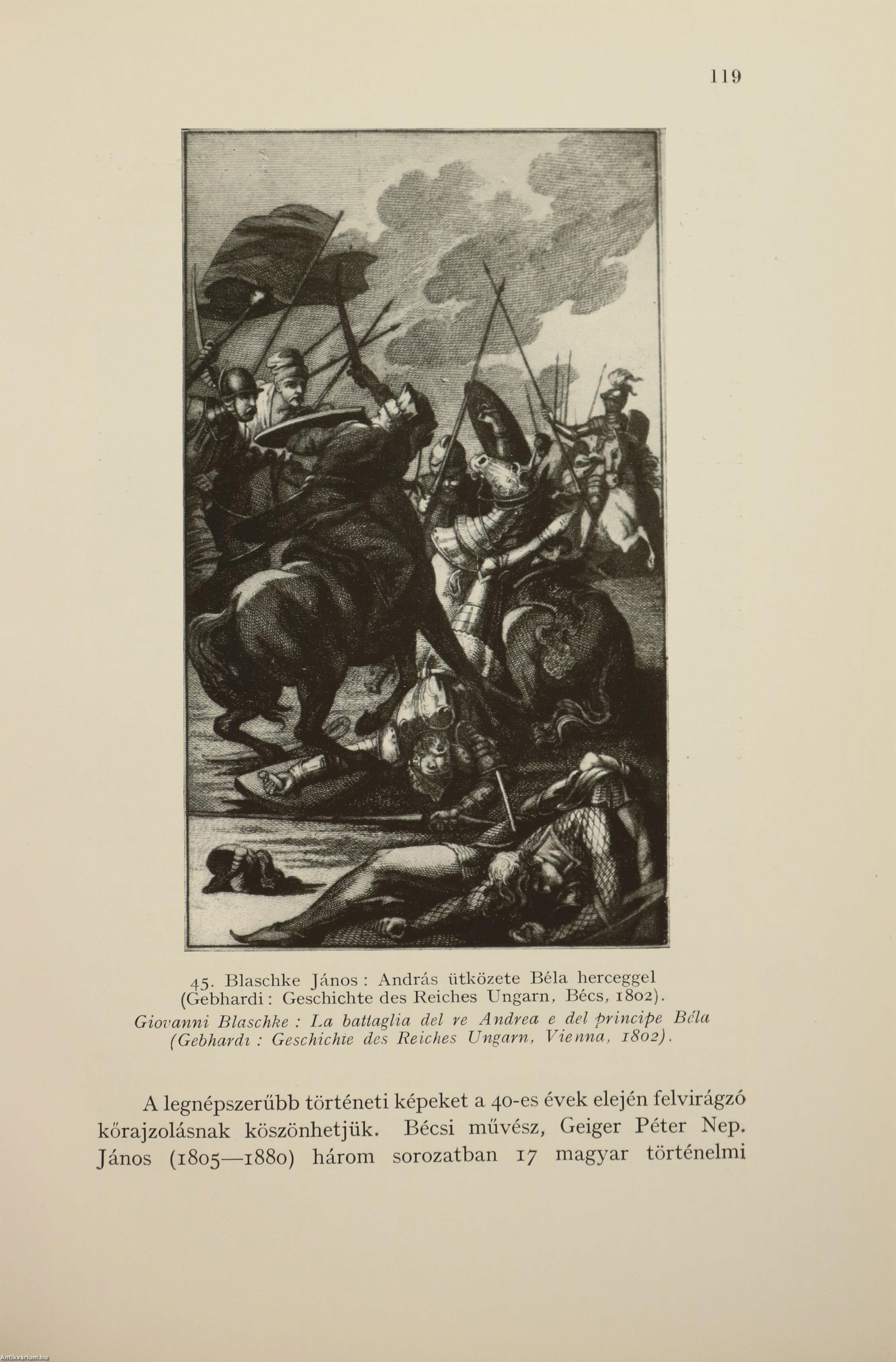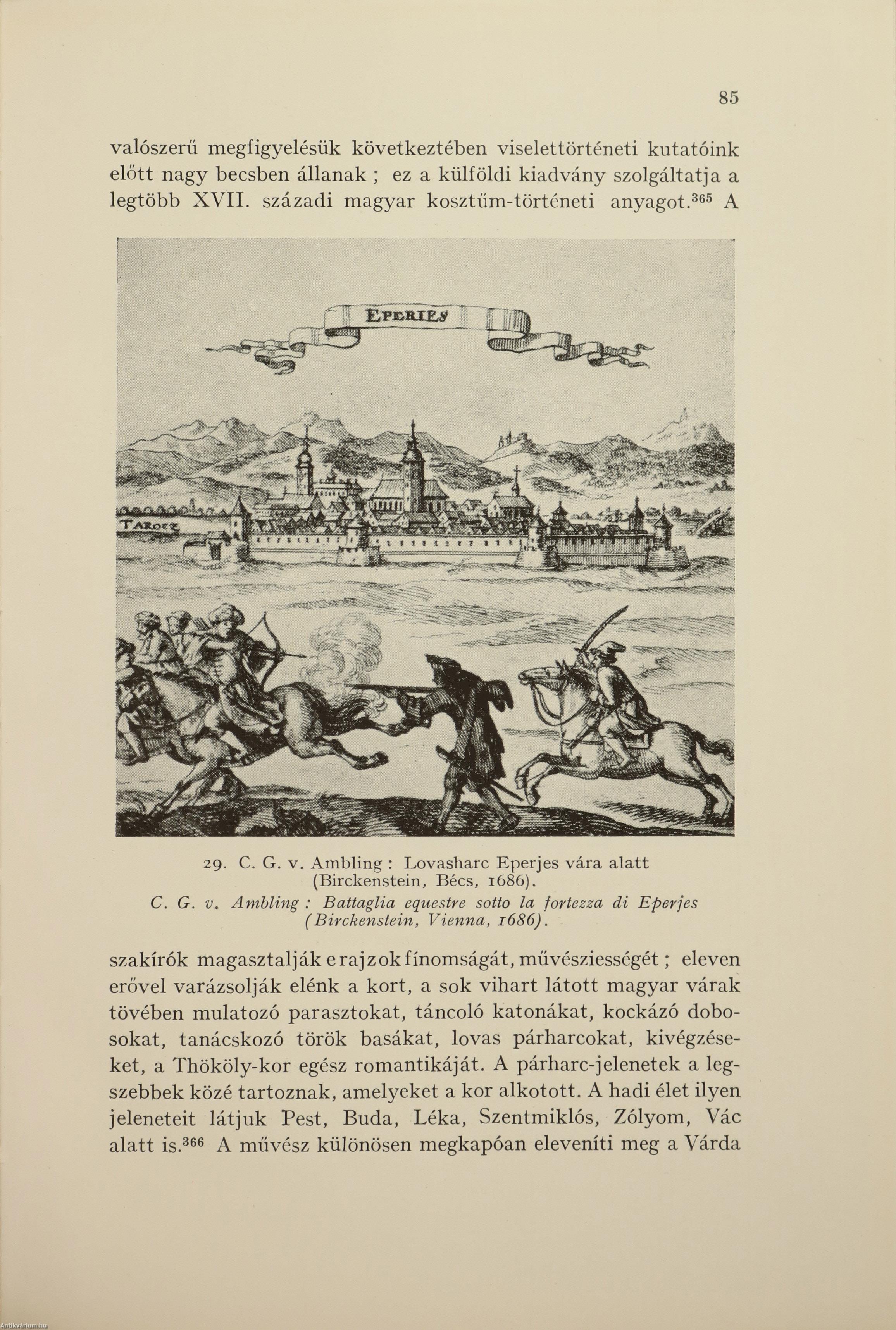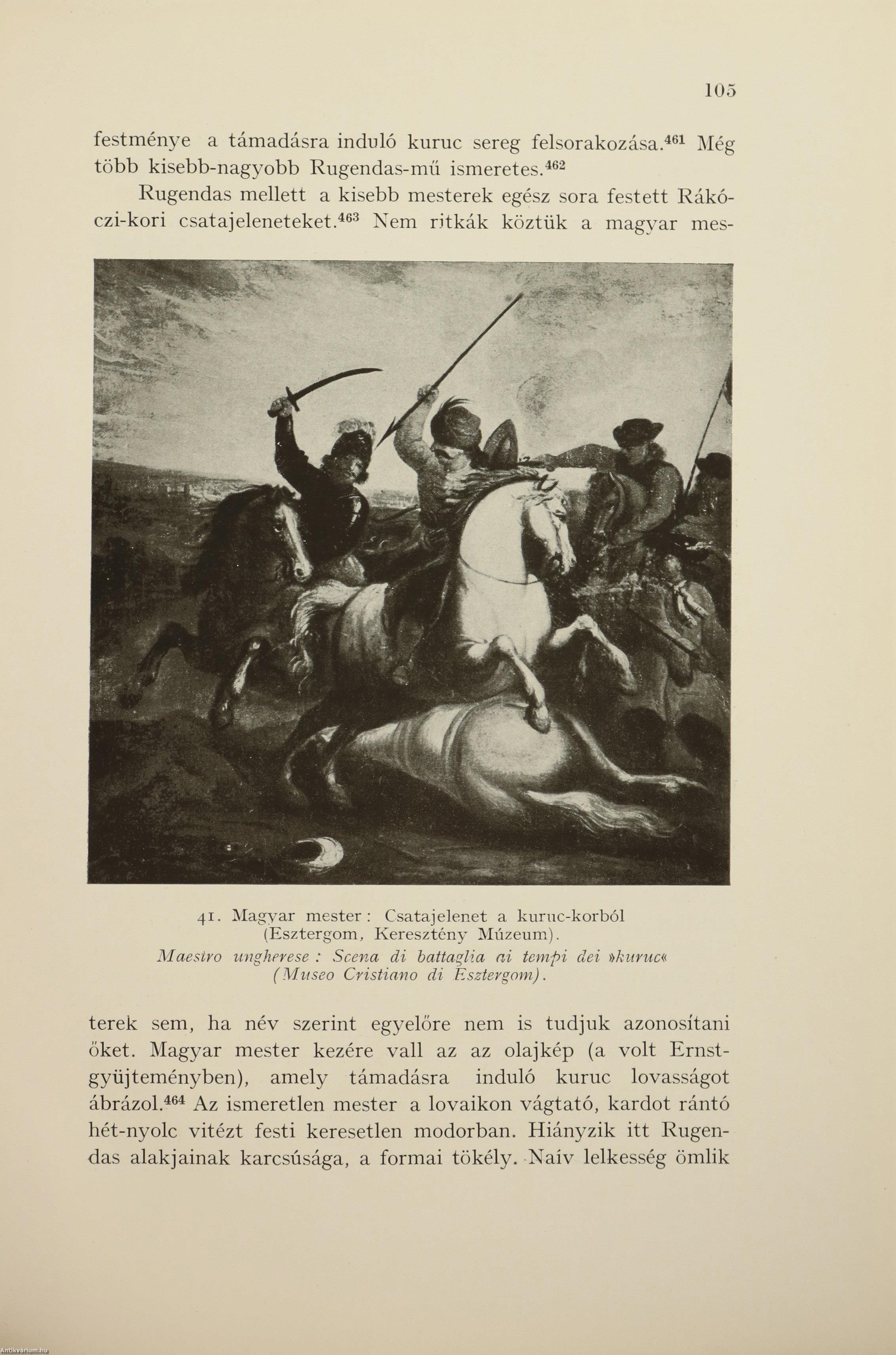 Első kiadás. A Budapesti Kir. Magyar Pázmány Péter Tudományegyetem Művészettörténeti és Keresztényrégészeti Intézetének dolgozatai. No.: 65. sz. Igazgató: Gerevich Tibor. A magyar csatakép. / La battaglia nell'antica arte ungherese. Írta: Ambrózy György a Katonai Mária Terézia Rend lovagja. 70 fekete-fehér, feliratos képpel és egy díszcímlappal illusztrált, valamint kétnyelvű (magyar-olasz) címlappal, előszóval, olasz nyelvű összefoglalóval, a sorozatban megjelent könyvek listájával és tartalomjegyzékkel ellátott kötet. Az előzéklapon tollal írt számjelzés és Tiszteletpéldány bélyegzés látható. Nyomtatta az Athenaeum r.-t. Budapesten. Kiadói pergamen kötésben lévő példány a katonai Mária Terézia Rend aranyozott, színes, dombornyomott emblémájával ellátott címfedéllel, aranyozott feliratos könyvgerinccel, hiánytalan állapotban. Különálló, a kötethez tartozó melléklet: Hibaigazítás. A kötet szerzője, sédeni lovag Ambrózy György (Sátoraljaújhely, 1885. március 7. – Budapest, 1970. január 18.) falerisztikai író, a Mária Terézia rend lovagja. A cs. és kir. 4. huszárezrednél kezdte katonai pályáját. 1908-ban hadnaggyá avatták. Ezt követően Tullnban, Medgyesen, Nagyszebenben, Debrecenben, Nagyváradon szolgált. Az első világháborúban már huszárként harcolt. A háború után századosi rangban Horthy segédtisztjeként tevékenykedett a Hadügyminisztériumban, valamint a Baross Szövetség vezetője volt. A "Magyar csatakép" (1940) című doktori értekezése, ami a magyar tárgyú csatakép-ábrázolások (festmények, szobrok, ötvösművek, plasztikák) remek áttekintése, gazdag anyagot szolgáltat a magyar történeti ikonográfiához.
