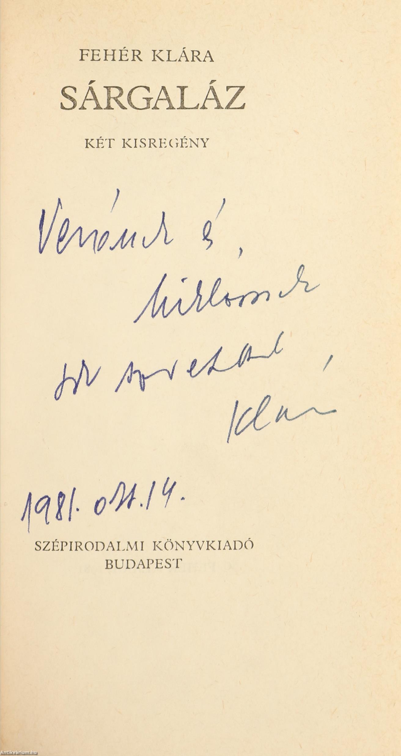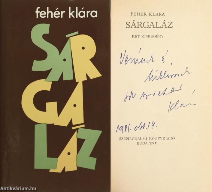 Szerző által dedikált példány.Első kiadás. Sárgaláz. Két kisregény. Írta: Fehér Klára. A címlapon a szerző, Fehér Klára tollal beírt, névre szóló dedikációja olvasható: "V.-nak és M.-nak sok szeretettel Klára 1981. okt. 14." A borító- és kötésterv Pap Klára munkája. A szerző fényképét Rédner Márta készítette. Tartalomjegyzékkel kiegészített kiadás. Nyomtatta a Alföldi Nyomda, Debrecenben. Kiadói egészvászon kötésben lévő példány feliratozatlan, illusztrációval ellátott címfedéllel, feliratos könyvgerinccel, tiszta belívekkel, hiánytalan, megkímélt, jó állapotban, több színnel feliratozott, fülszöveges, az írónő fekete-fehér fotójával ellátott, jó állapotú kiadói borítófedélben. Jelen kötetben olvasható két kisregény egyértelműen azokhoz szól, akik távol állnak minden igazságtalanságtól, kétszínűségtől. Ők azok, akik a létezés viharában inkább a nehezebbik utat választják, de ragaszkodnak az egyenességhez és a tisztasághoz. A kötet szerzője, Fehér Klára (Újpest, 1919. május 21. – Budapest, 1996. szeptember 11.) József Attila-díjas író, újságíró. Férje Nemes László író. Fiatalon gyári tisztviselőként dolgozott, majd a második világháború után a kiépülő, szovjet típusú rendszer elkötelezett agitátoraként a Szabad Nép munkatársa volt. Kommunista érzelmű cikkek, riportok szerzőjeként vált híressé. Az 1956-os forradalom után a Magyar Nemzet publicistája, majd szabadfoglalkozású író lett. Színdarabokat, ifjúsági regényeket, szépirodalmi műveket írt. Műveiben jellemzően a hétköznapi, gyakran a hatalomnak kiszolgáltatott kisemberek alakja jelenik meg; a lényeges problémák, sorsok, élethelyzetek bemutatása mellett a humor is fontos szerepet tölt be írásaiban.