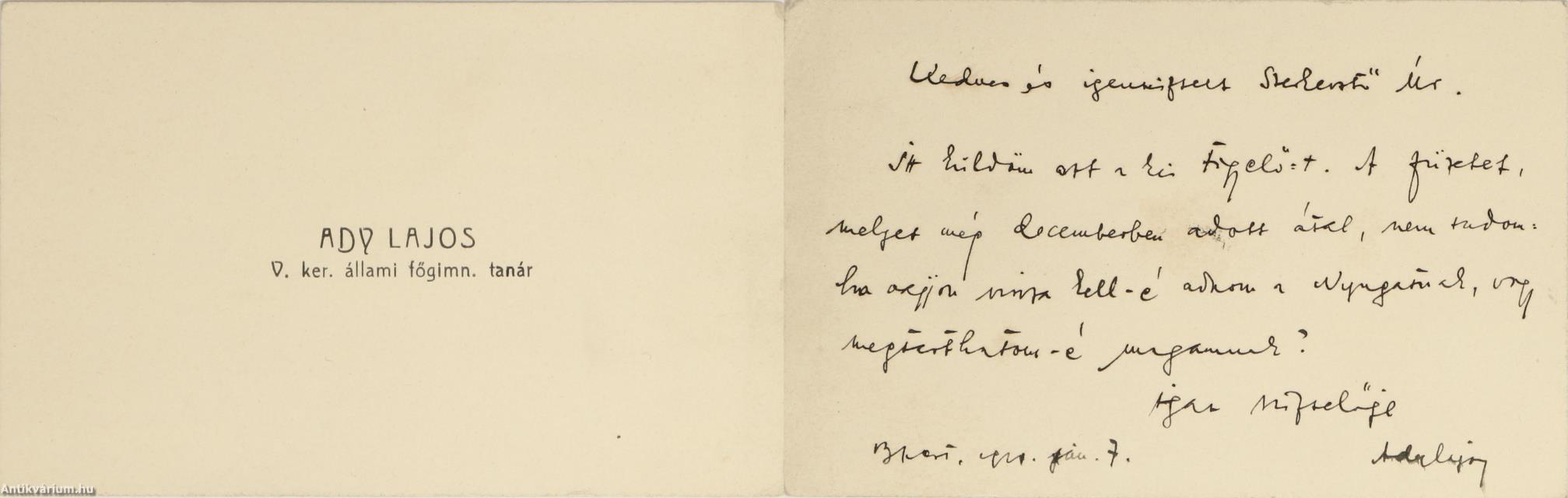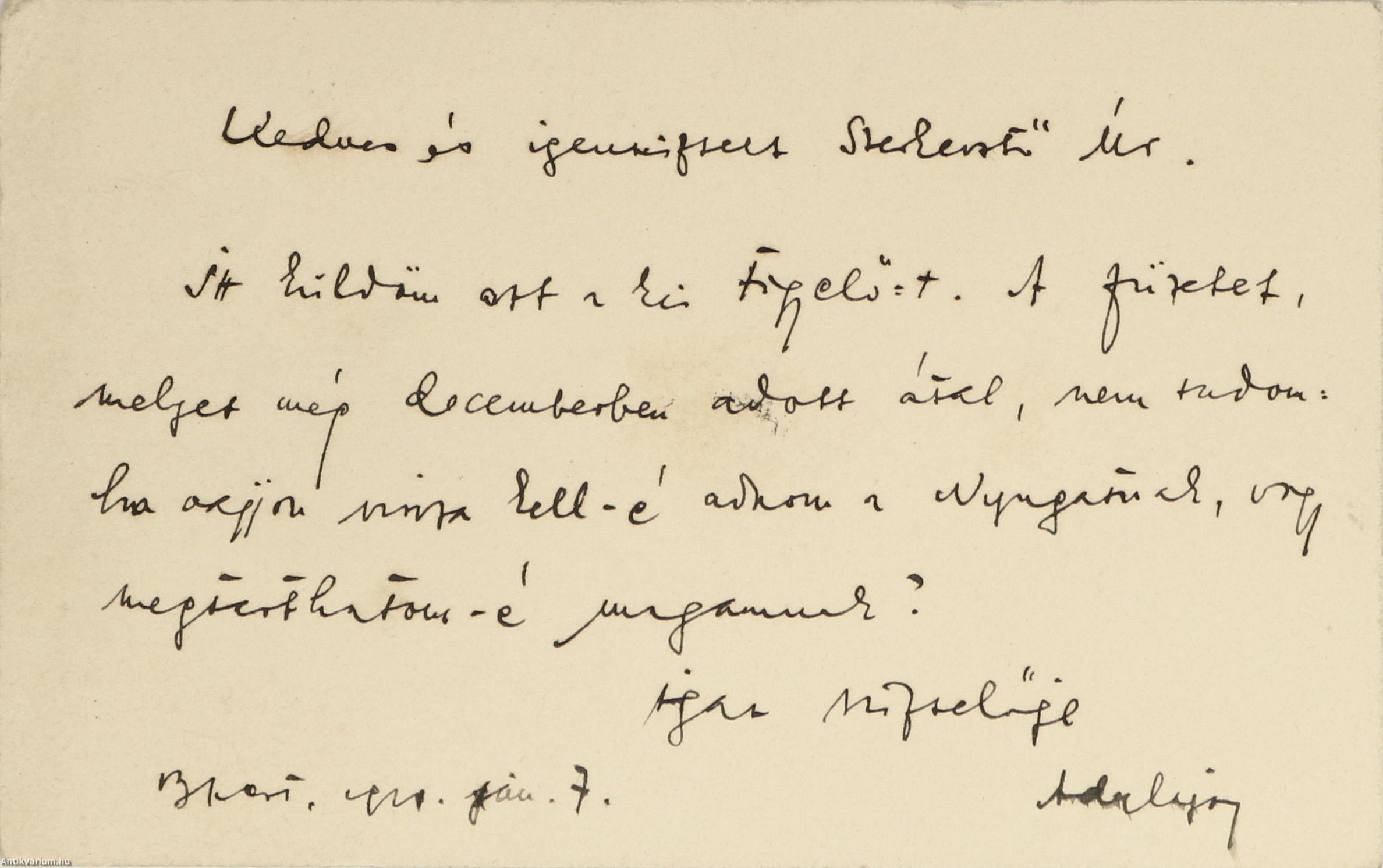 A tétel korábban a Portobello aukciósház egyik 2014-es árverésén szerepelt; a kutatás azóta a levél meg nem nevezett címzettjét Osvát Ernő személyében azonosította. Közölve: Tessék színt vallani. Osvát Ernő szerkesztői levelezése. Sajtó alá rend. Kosztolánczy Tibor és Nemeskéri Erika. Bp., 2019. I: 513.