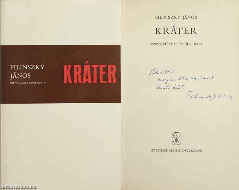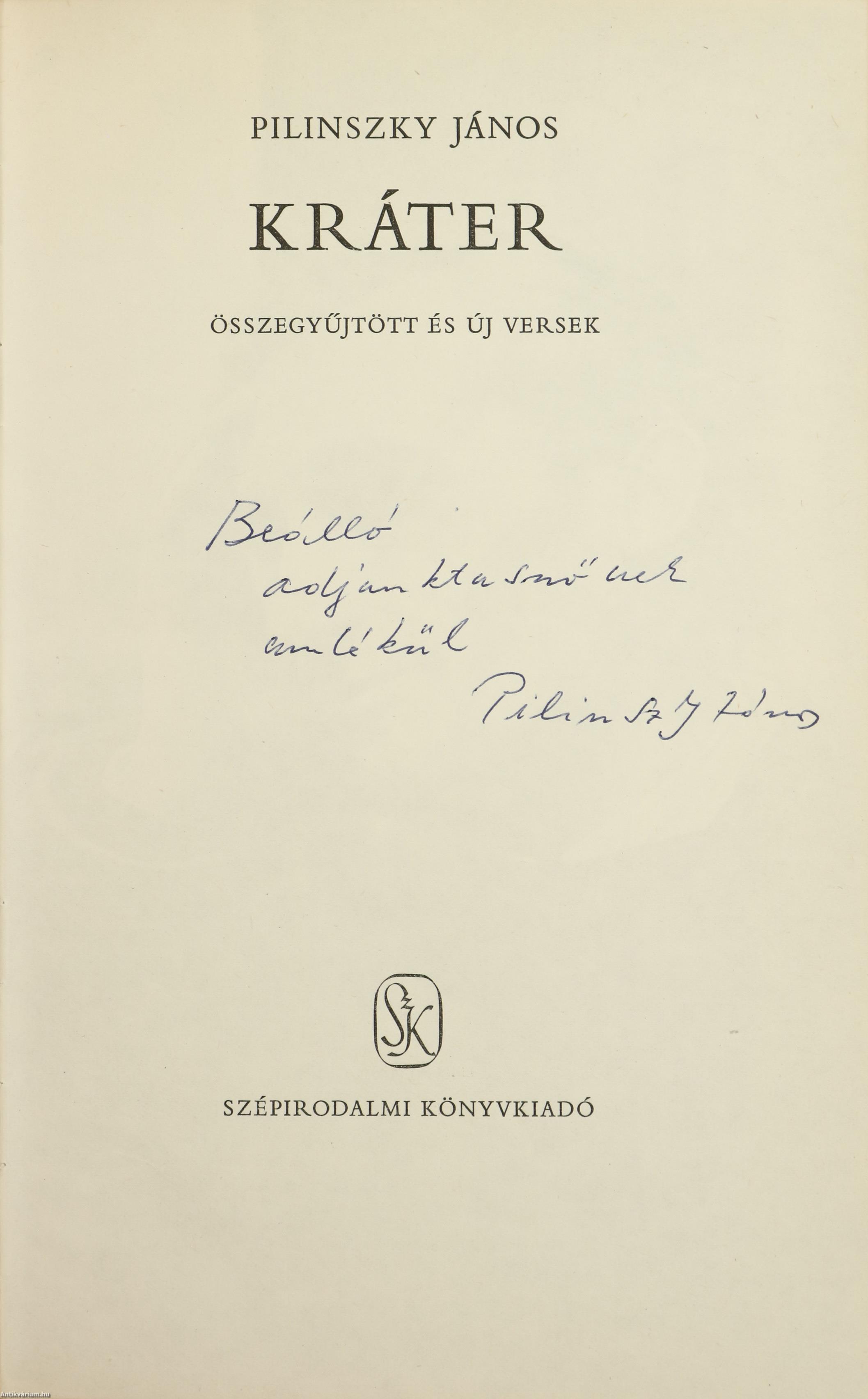Szerző által dedikált példány. Első kiadás. Kráter. Összegyűjtött és új versek. Írta: Pilinszky János. A címlapon a szerző, Pilinszky János költő tollal beírt dedikációja olvasható: "Beálló adjunktusnőnek emlékül Pilinszky János". A szerző fekete-fehér, egész oldalas portréjával illusztrált, valamint részletes tartalomjegyzékkel kiegészített kötet. A költő fényképét Koffán Károly készítette. A borító-, kötésterv és tipográfia Pintér László munkája. Nyomtatta a Kner Nyomda Gyomán. Kiadói fűzött kemény papírkötésben lévő példány aranyozott feliratos címfedéllel és könyvgerinccel, tiszta oldalakkal, hiánytalan, jó állapotban, feliratos, fülszöveges, jó állapotú kiadói borítófedélben. A kötet szerzője, Pilinszky János (Budapest, 1921. november 27. – Budapest, 1981. május 27.) a huszadik század meghatározó magyar költője. A Nyugat irodalmi folyóirat negyedik, az Újhold köré csoportosult írónemzedékének a tagja. Az Újhold társszerkesztője (1946-48) volt. Verseit az Élet, a Vigília, az Ezüstkor és az Új Ember is gyakran közölte. Költészetében a hit, a spiritualitás, a humánum, az emberi szenvedés, a megértés és az emberi kapcsolatok nagy jelentőséggel bírnak és a lírai magasságokban új értelmet, új dimenziót nyernek. A költő keresztény hitelveket felvállaló, egzisztenciális, finom lírája a magyar irodalom kincsei közé tartozik.