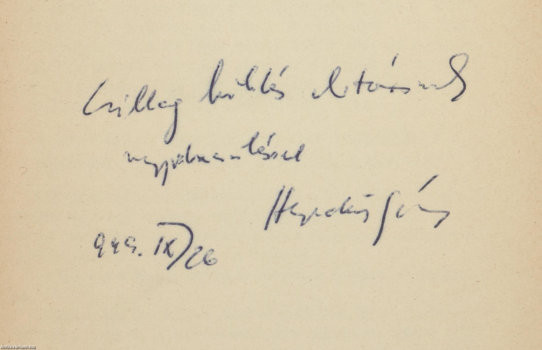 A címlapon a szerző, Hegedűs Géza tollal beírt, névre szóló dedikációja olvasható: "Cs. M. elvtársnak nagyrabecsüléssel Hegedűs Géza. 949. IX/26.".