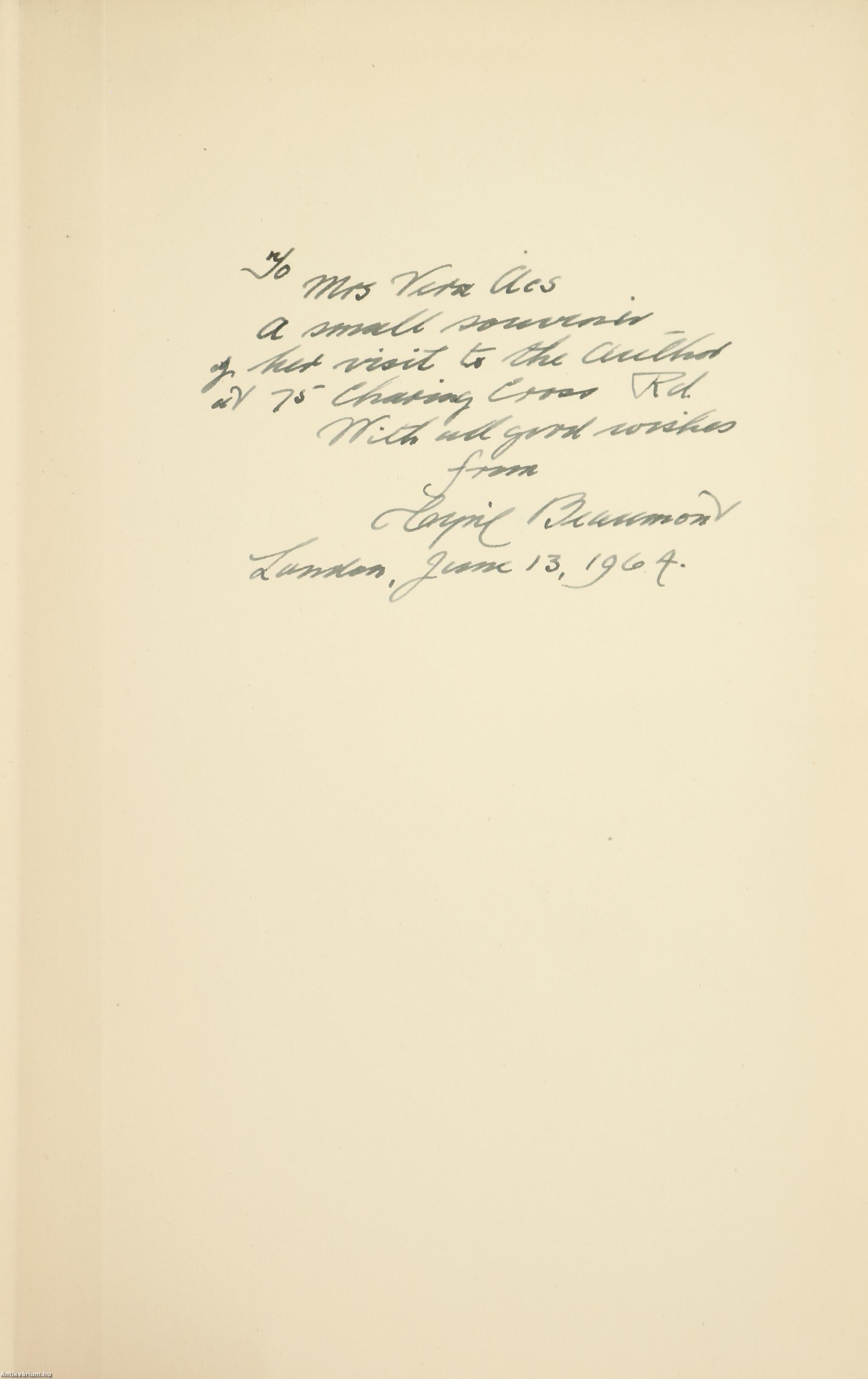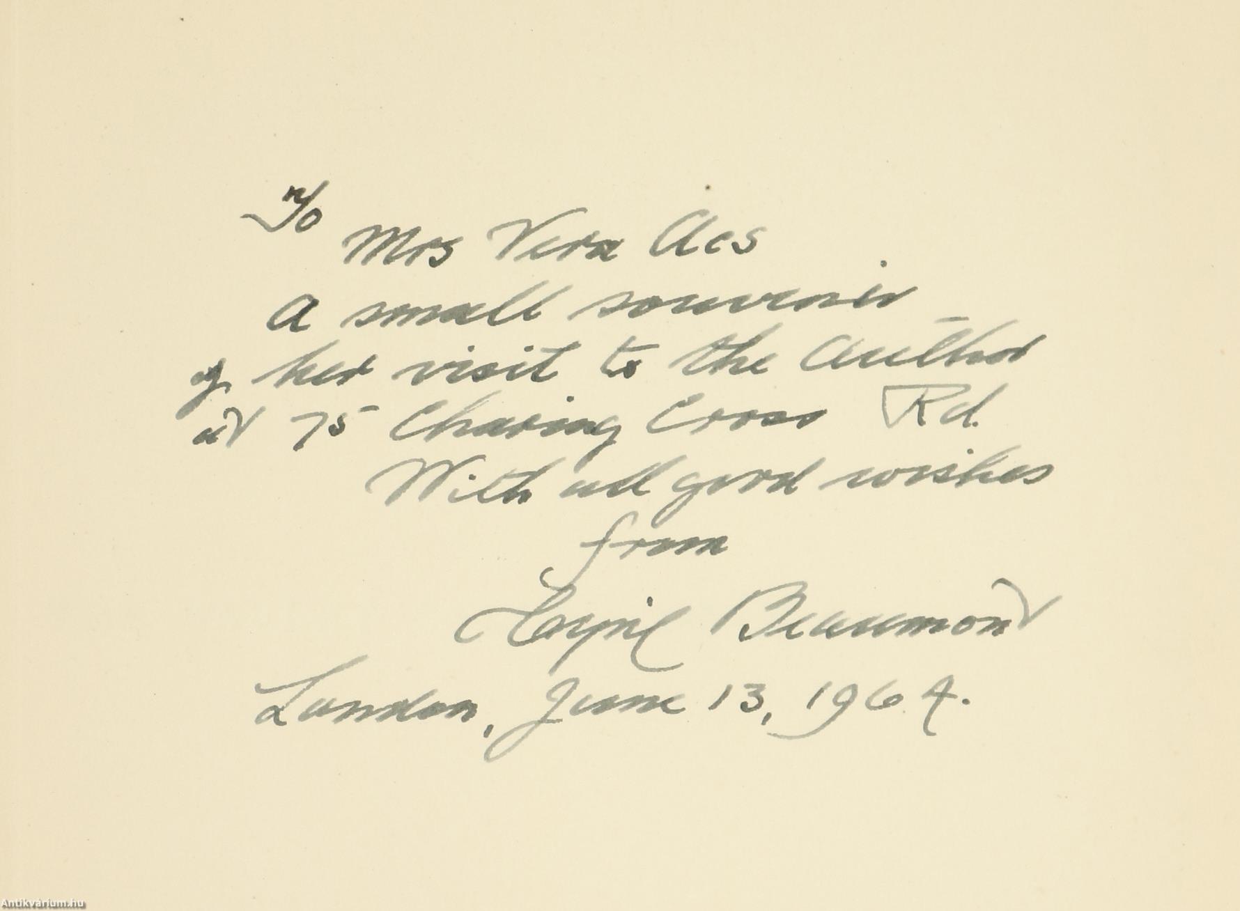 Az előzéklapon a szerző, Cyril W. Beaumont tollal beírt, névre szóló dedikációja olvasható: "To Mrs. V. Á. a small souvenir of her visit the author at 75 Charing Cross Rd. With all good wishes from Cyril Beaumont. London, June 13. 1967. / Á. V.-nak, egy kis emléktárgy a szerzőnél tett látogatásáról, 75 Charing Cross Rd. Minden jót kíván Cyril Beaumont. London, 1967. június 13.".