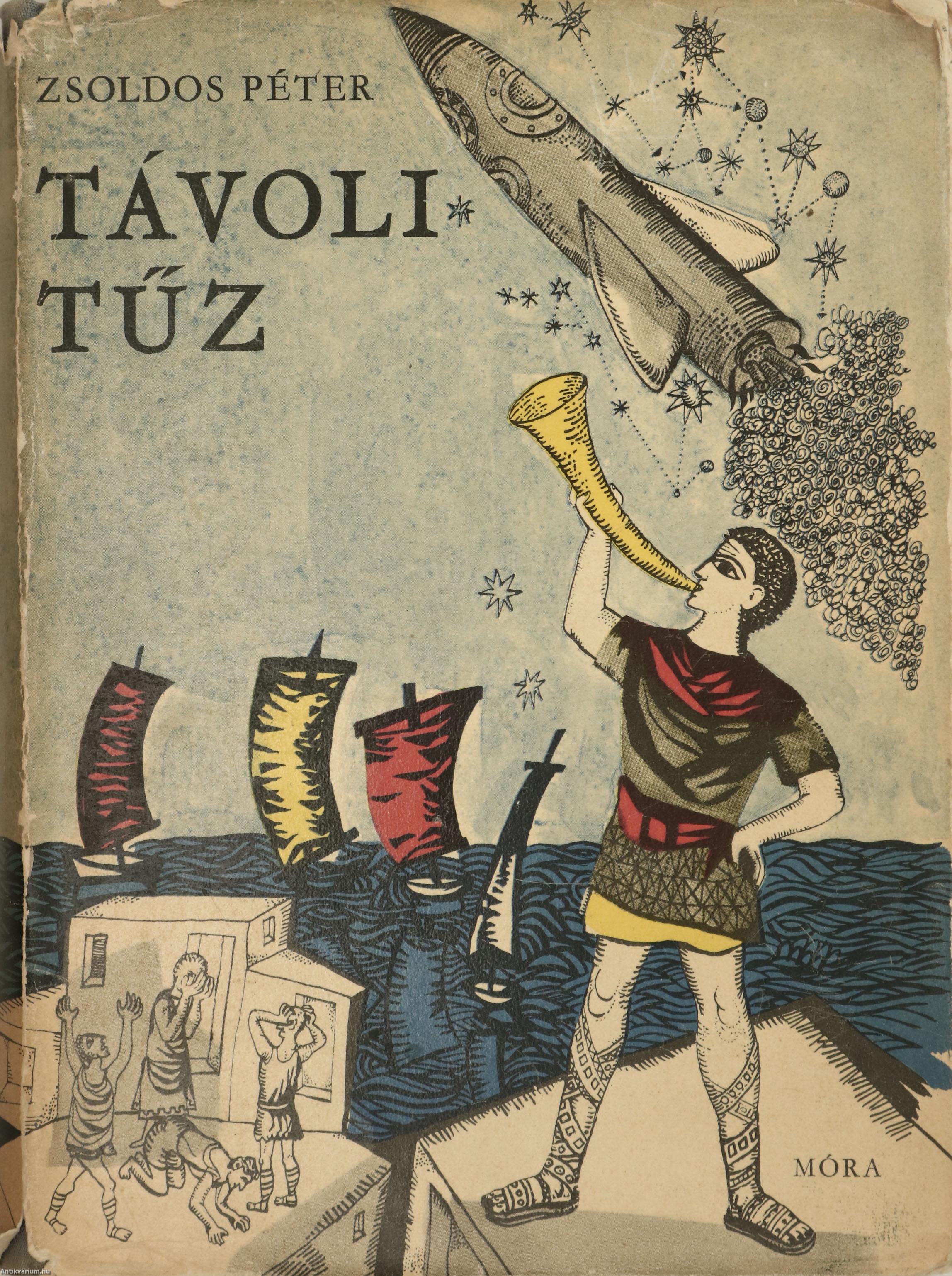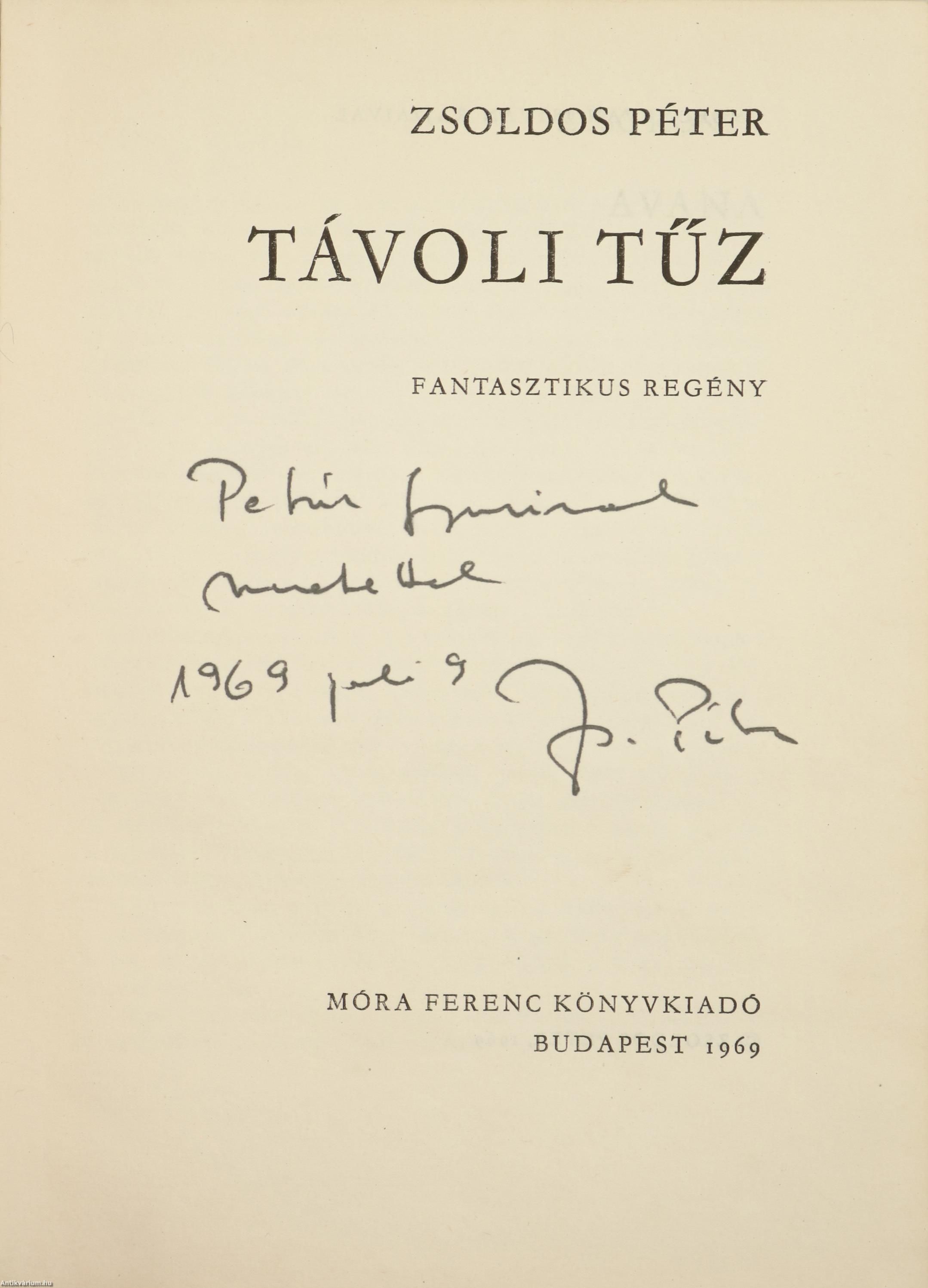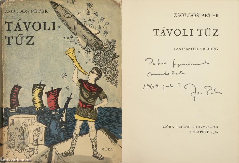Szerző által dedikált példány. Első kiadás. Távoli tűz. Fantasztikus regény. Írta: Zsoldos Péter. A címlapon a szerző, Zsoldos Péter tollal beírt, névre szóló dedikációja olvasható: "P Gy.-nek szeretettel. 1969. júli. 9. Zs. Péter". Engel-Tevan István szöveg közti, fekete-fehér rajzaival illusztrált, valamint tartalomjegyzékkel kiegészített kötet. Nyomtatta a Pécsi Szikra Nyomda. Kiadói félvászon kötésben lévő példány, feliratozatlan, illusztrációval ellátott címfedéllel, feliratos könyvgerinccel, térképvázlattal illusztrált, kiadói előzéklapokkal, hiánytalan állapotban, feliratozott, színes illusztrációval ellátott, fülszöveges, kiadói borítófedélben (rajta apróbb sérülésekkel). A kötet szerzője, Zsoldos Péter (Szentes, 1930. április 20. – Budapest, 1997. szeptember 26.) sci-fi író, zeneszerző. Fiatalkorában sokat olvasott olyan szerzőktől, mint Jack London vagy Kipling. Később tudományos könyvek érdekelték a csillagászattól, a földrajzon és geológián át a régészetig. A Zeneművészeti Főiskolán szerzett zenetanári és kóruskarnagyi diplomát. Ezt követően a Magyar Rádióban lett zenei szerkesztő-riporter, miközben 1963 és 1967 között a bölcsészkaron pszichológiát tanult. A tudományos-fantasztikus irodalommal 1957 után kezdett foglalkozni. Elsősorban tudományos-fantasztikus műveiről ismert Magyarországon. Stanisław Lemhez hasonlóan kritikusan nyilatkozott a 80-as évek közepén a sci-fi műfaj népszerűségének negatív hatásáról, annak felhígulásáról és műfaj mellett megjelenő szubkultúráról.