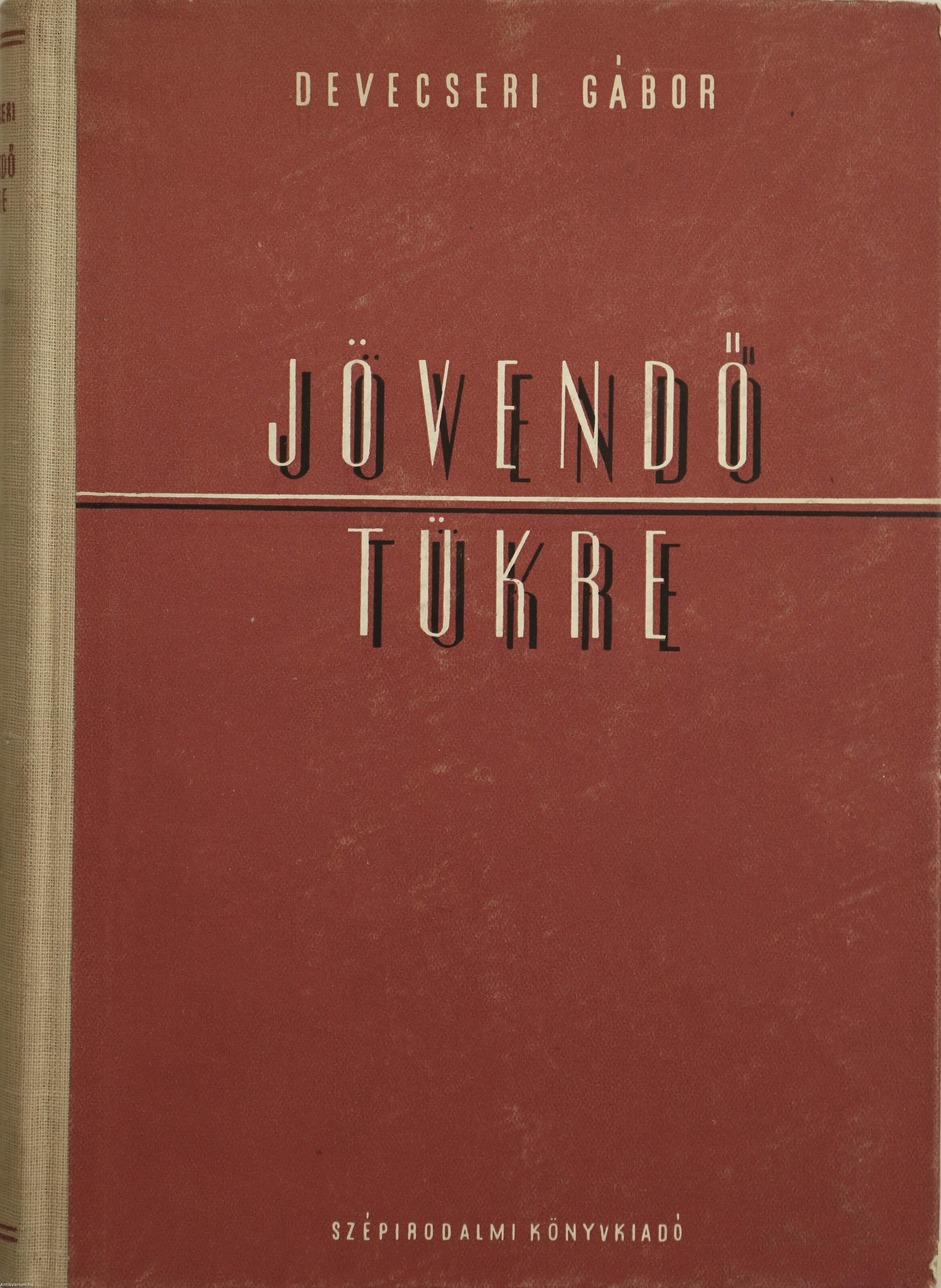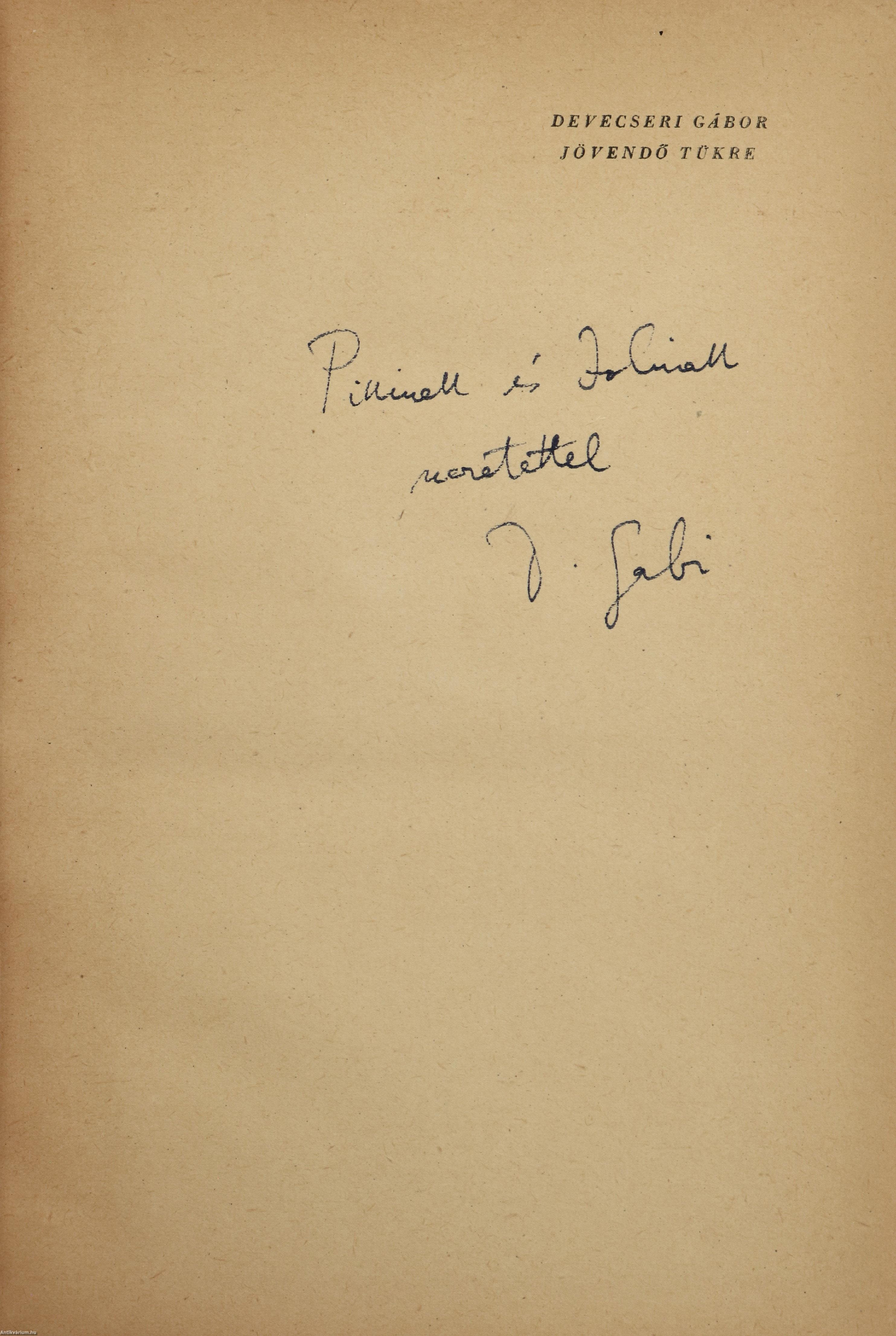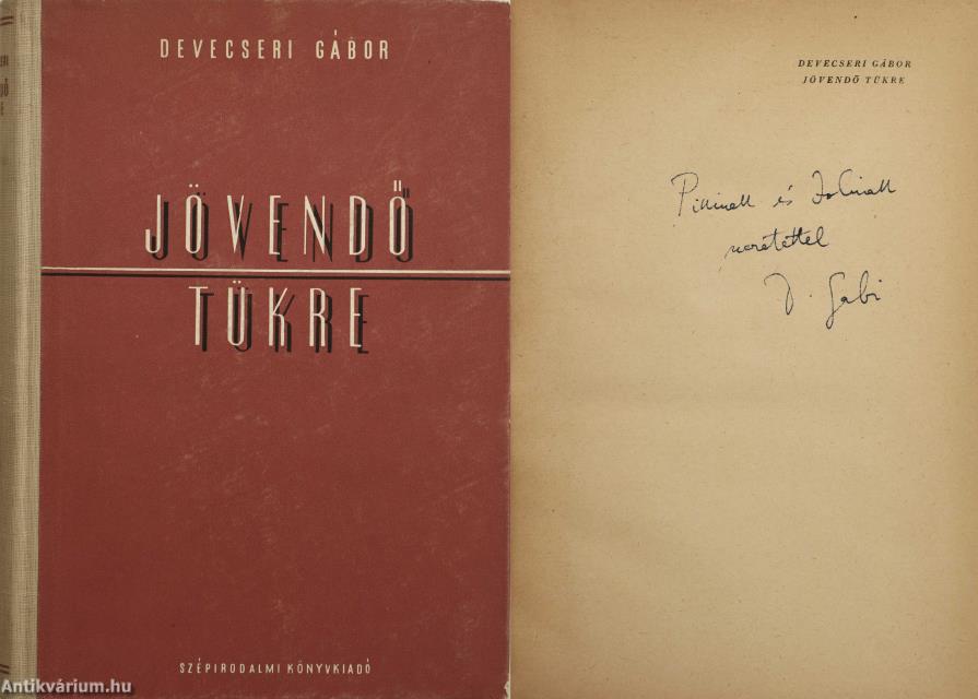 Szerző által dedikált példány.Első kiadás. Jövendő tükre. Versek 1950-1954. Írta: Devecseri Gábor. Az előlapon a szerző, Devecseri Gábor tollal beírt, névre szóló dedikációja olvasható: "P.-nak és J.-nak szeretettel D. Gabi".