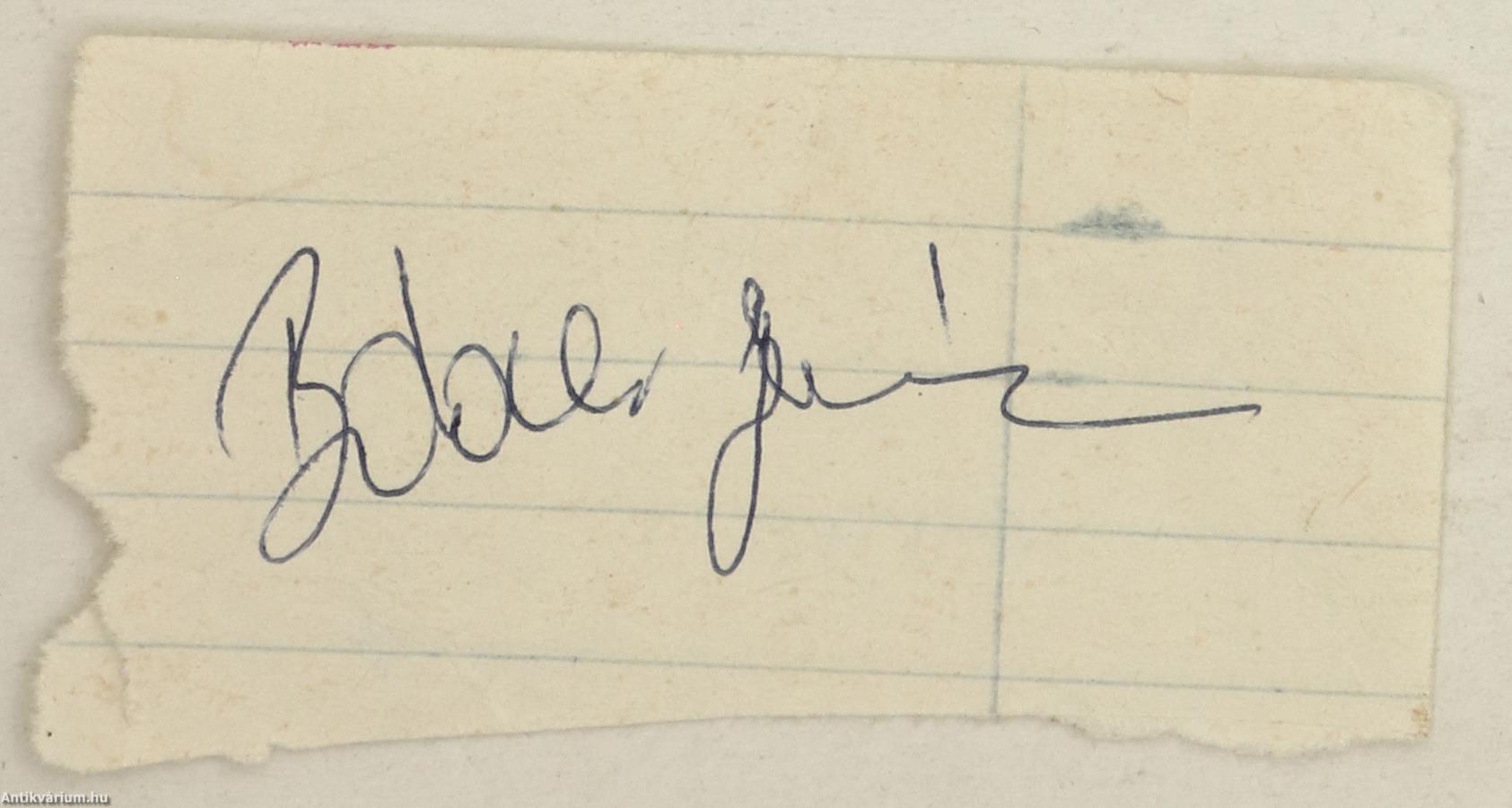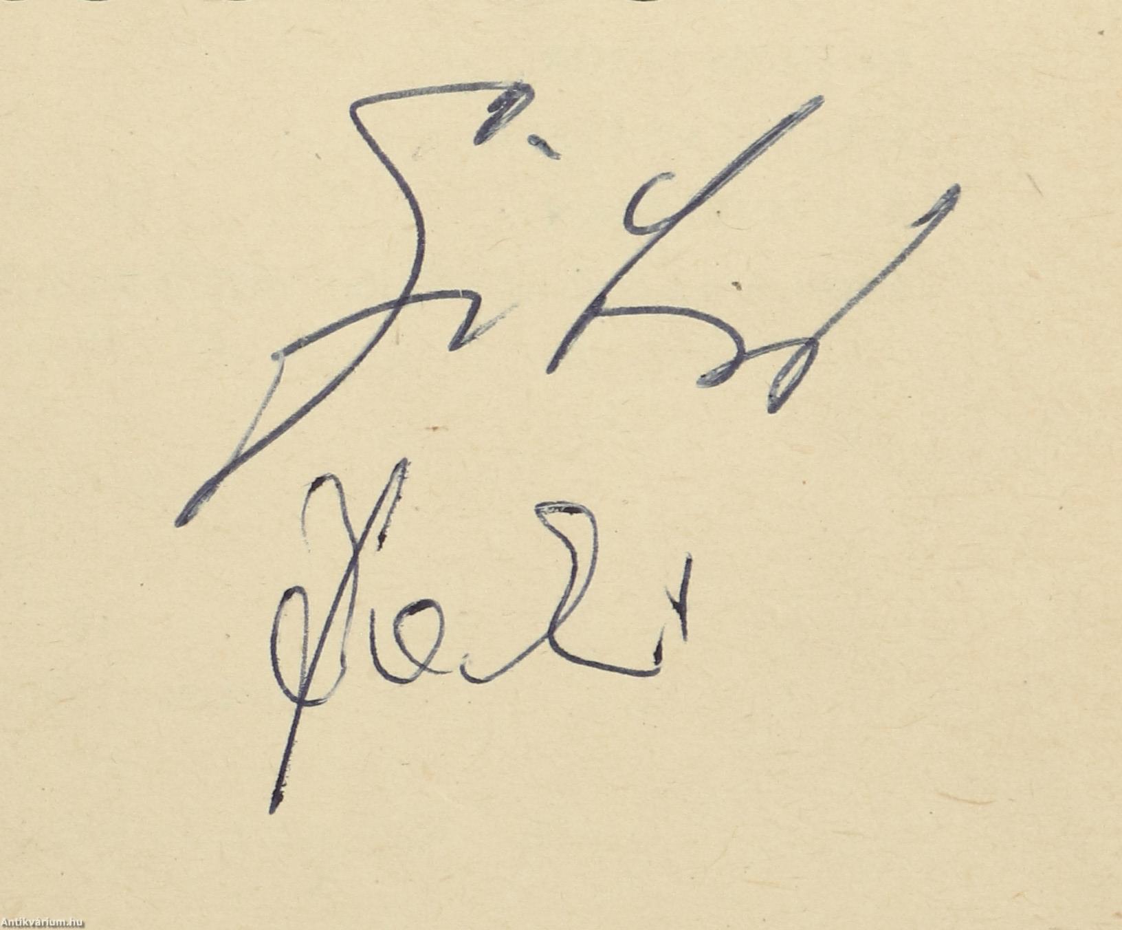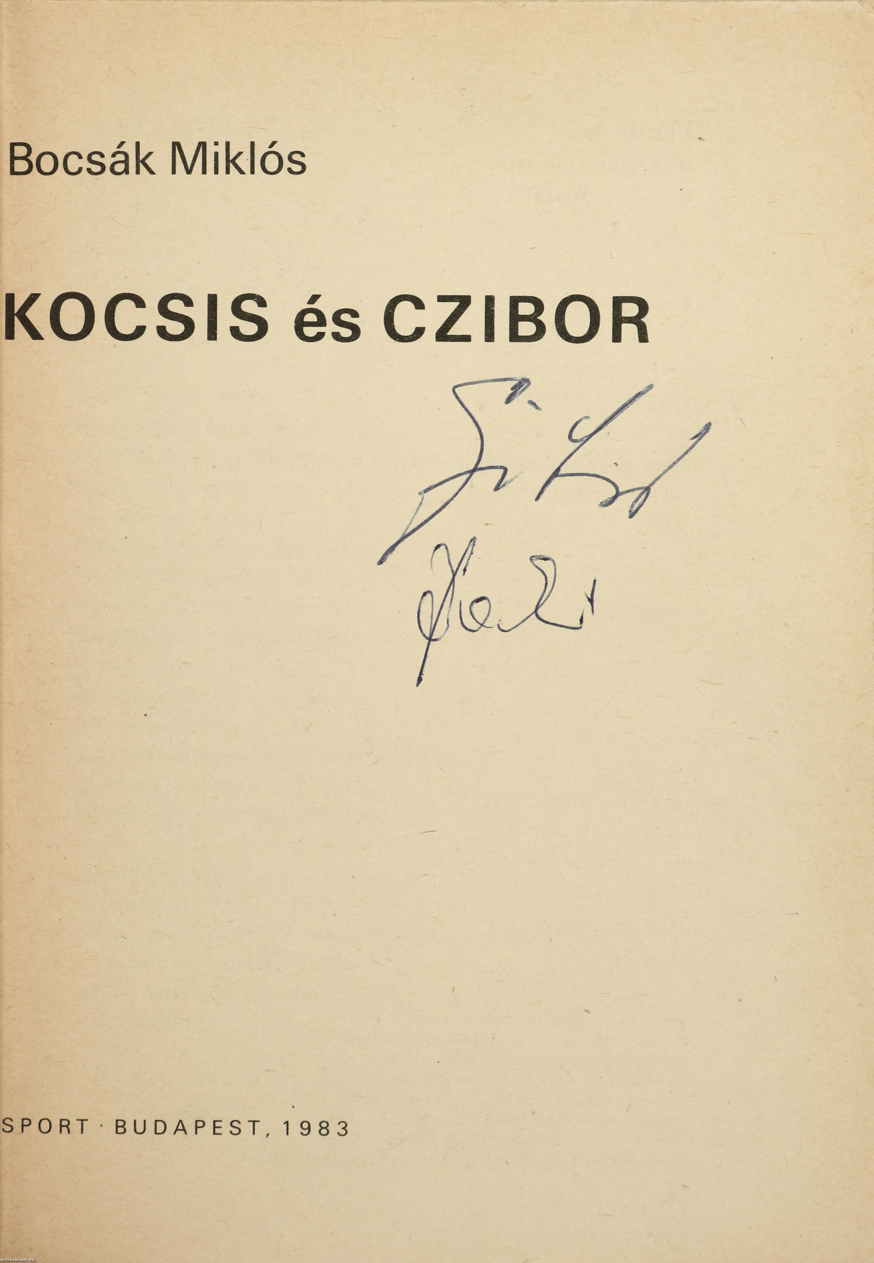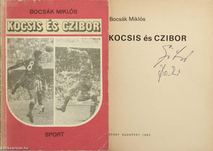 Czibor Zoltán, Báder János, Mucha József labdarúgók és Bocsák Miklós szerző által aláírt, valamint Rudplf Péter színész és további 1 személy által dedikált példány. Kocsis és Czibor. Írta: Bocsák Miklós. A címlapon a szerző, Bocsák Miklós és Czibor Zoltán válogatott labdarúgó tollal beírt aláírása, valamint négy különálló lapon Báder János, Mucha József aláírása látható, illetve Rudolf Péter színész és további 1 személy dedikációja olvasható: "Sok szeretettel Rudolf Péter. 1989. febr. 11.". A fedéltervet készítette: Thaly Zoltán. 55 fekete-fehér eredeti fotóval illusztrált, valamint részletes tartalomjegyzékkel kiegészített kötet. Fényképek: Bojár Sándor, Komlós Tibor, Magdics László, Záhonyi Iván, illetve a szerző, a Kocsis és Czibor családok archívumából. A címfedél verzóján illusztrációval és névvel ellátott ex-libris címke található. Nyomtatta a Sylvester János Nyomda Szombathelyen. Kiadói ragasztott papírkötésben lévő példány feliratos, illusztrált címfedéllel, feliratos, elszíneződött, kopott könyvgerinccel, tiszta belívekkel, feliratos hátlappal, hiánytalan állapotban. „Bocsák Miklós vállalkozása (Kocsis és Czibor) viszont izgalmas, értékes könyvet eredményezett. A szerző amellett, hogy végigkíséri Kocsis és Czibor sportpályafutását, megrajzolja emberi portréjukat is, és pontos képet fest arról a társadalmi közegről, amelyben itthon, majd később Spanyolországban mozogtak.” - írta a könyvről Filep Tibor (Alföld. Irodalmi, művelődési és kritikai folyóirat/1984 február/2. szám). Az aláírók és dedikálók közül néhány: Czibor Zoltán (Kaposvár, 1929. augusztus 23. – Győr, 1997. szeptember 1.) olimpiai bajnok és világbajnoki ezüstérmes magyar labdarúgó, az Aranycsapat tagja. Játékosként a balszélső poszton gyors, kiszámíthatatlan és gólerős csatár volt. Rudolf Péter (Budapest, 1959. október 15. –) Kossuth- és Jászai Mari-díjas színész, színházi-, és filmrendező, producer, forgatókönyvíró, a Halhatatlanok Társulatának örökös tagja. 1983-tól a Vígszínház társulatának tagja, 2003-tól az Újszínház művészeti vezetője volt, 2020-ban pedig kinevezték a Vígszínház igazgatójának.
