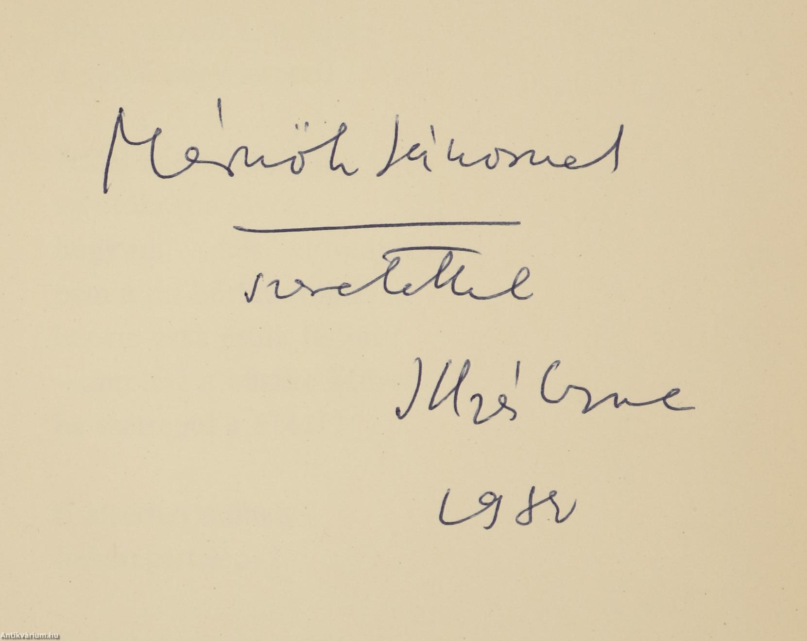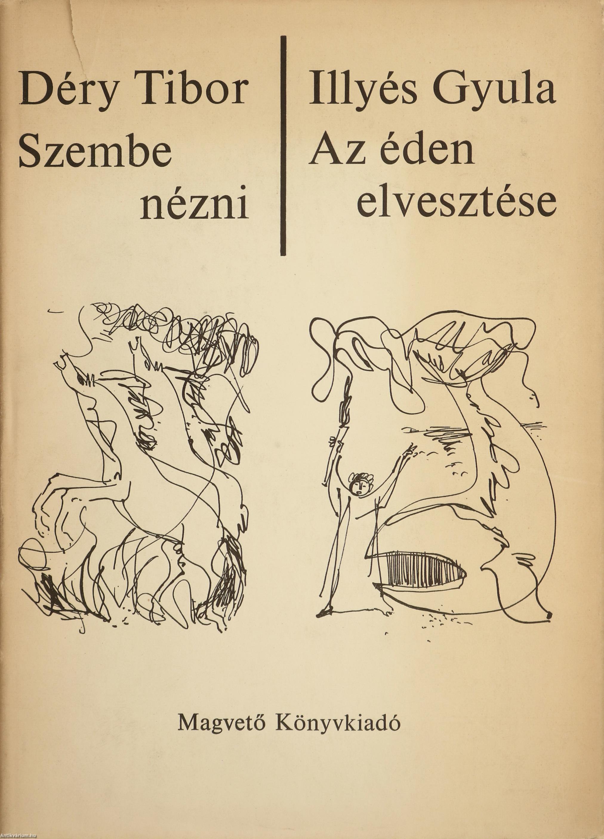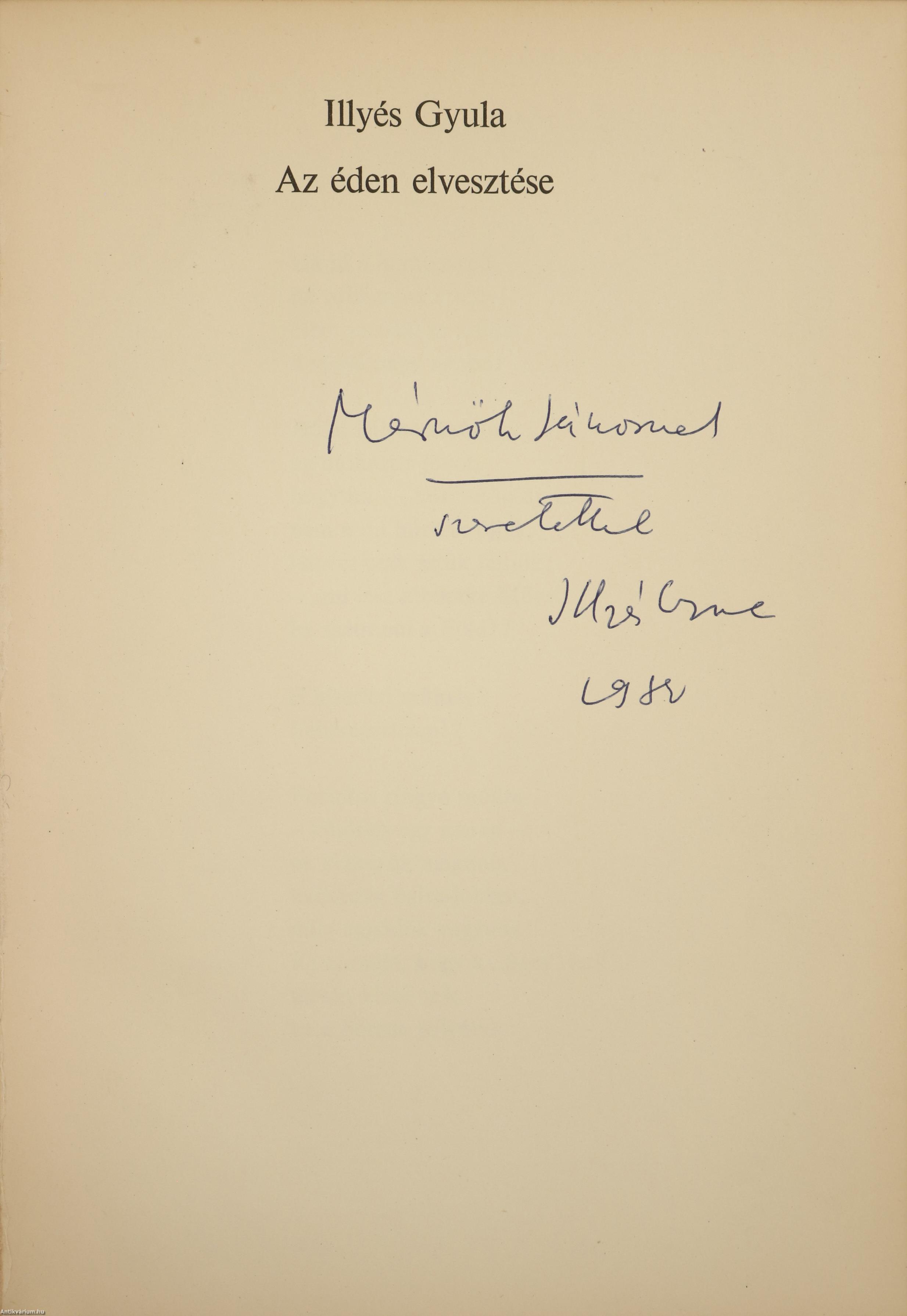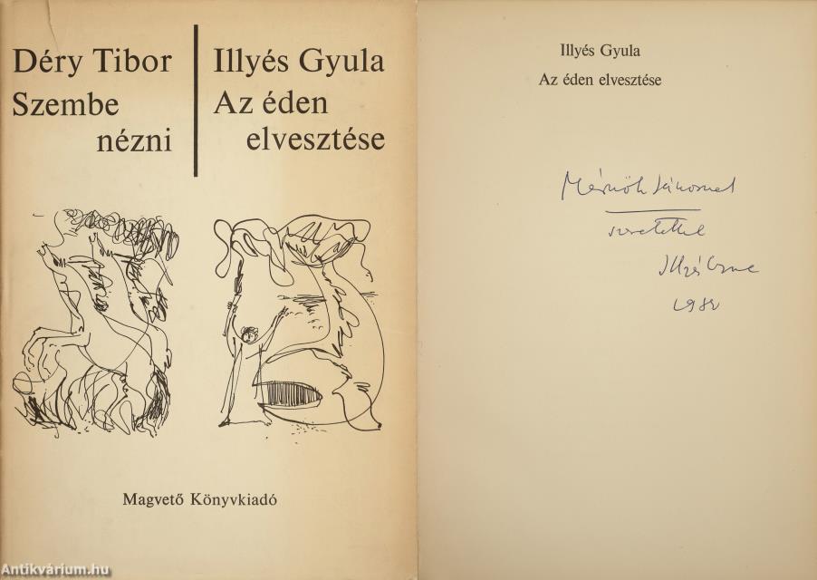 Illyés Gyula által dedikált példány. Szembenézni. Írta: Déry Tibor / Az éden elvesztése. Írta: Illyés Gyula. (két mű egy kötetben) Az éden elvesztése c. mű címlapján a szerző, Illyés Gyula tollal beírt, névre szóló dedikációja olvasható: "Mérnök Jánosnak szeretettel Illyés Gyula. 19...". A dedikáció címzettje, Mérnök János (1926-1988) zongoraművész, zenetanár. A Zeneművészeti Főiskolán Kadosa Pálnál tanult. Oklevele megszerzése után rövid ideig Szegeden, majd Budapesten tanított. 1961-ben az Országos Filmharmónia művészeti vezetőségének tagja, 1966-tól a Bartók Béla Zeneművészeti Szakiskola és a Liszt Ferenc Zeneművészeti Főiskola tanára volt. Szöveg közti, fekete-fehér rajzokkal illusztrált, valamint tartalomjegyzékkel kiegészített kötet. Tipográfia, védőborító és kötésterv Benzúr Györgyi. Illusztrációk: Csohány Kálmán. Nyomtatta a Zrínyi Nyomda, Budapesten. Kiadói egészvászon kötésben lévő példány, feliratos címfedéllel és könyvgerinccel, tiszta belívekkel, hiánytalan állapotban, feliratozott, illusztrációval ellátott, fülszöveges, kiadói borítófedélben. A kötetet dedikálta, Illyés Gyula (Sárszentlőrinc-Felsőrácegrespuszta, 1902. november 2. – Budapest, 1983. április 15.) háromszoros Kossuth-díjas költő, író, drámaíró, műfordító, lapszerkesztő, a Magyar Tudományos Akadémia tagja. A Nyugat kiadásában jelent meg első verseskötete (Nehéz föld, 1928). A két háború közötti fiatal magyar költőnemzedék legelismertebb tagjai közé tartozott. Irodalmi műveinek fő megjelenési helye közel másfél évtizedig a Nyugat volt. 1928-tól szoros barátságot ápolt József Attilával, az 1930-as évek elejétől pedig nemzedéke több más jeles tagjával, irodalmi és világnézeti eszmetársaival: Erdélyi Józseffel, Kodolányi Jánossal, Szabó Lőrinccel, Németh Lászlóval és Gelléri Andor Endrével. Több nemzedéktársával együtt a harmincas évek közepén csatlakozott a népi írók mozgalmához, s annak egyik vezető alakja lett. Közös gondolkodásuk eredményeként látott napvilágot 1932-ben a "Tanú" c. lap, egy évvel később pedig Debreceni Káté címmel megszületett egy új, társadalmilag érzékeny népi írói mozgalom cselekvési programja. Illyés maga is részese, nemegyszer elindítója volt a különféle folyóiratok hasábjain folyó világnézeti és kritikai vitáknak. Így például az irodalmi zsidókérdésről, a katolikus költészetről, a jobb- és baloldali irodalomról, a Zilahy Lajos nevével fémjelzett Új Szellemi Front irodalmi programjáról, stb. Letisztult, kifinomult költészetére az emberi helytállás, a szociális érzékenység és a lírai képek egymásba fonódása egyaránt jellemző.