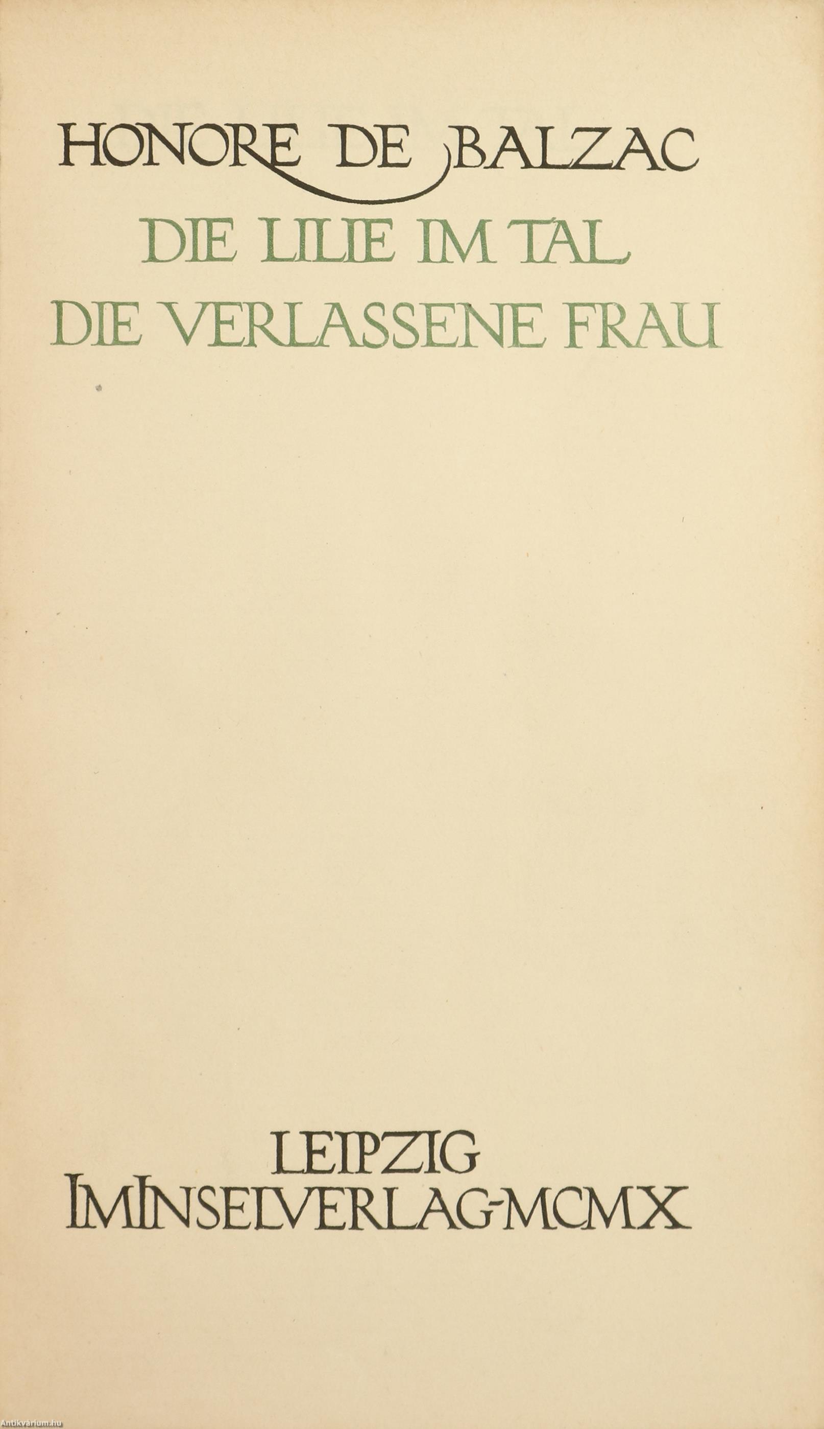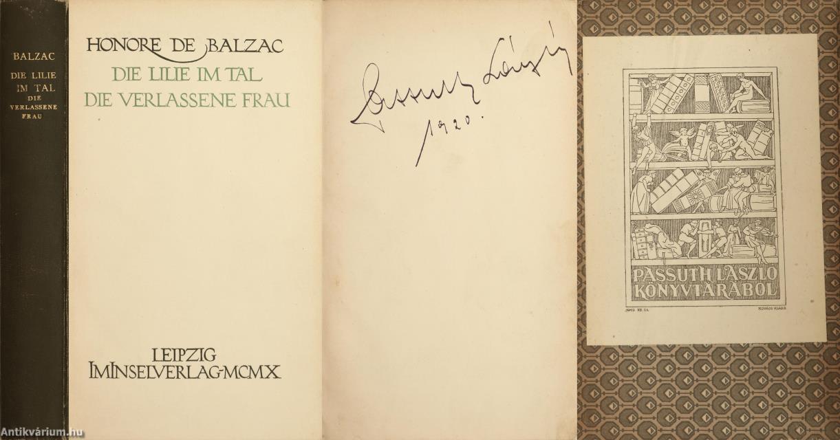 Passuth László tulajdonosi bejegyzésével ellátott példány. Die Lilie im Tal. / Die verlassene Frau. - A völgy lilioma. / Az elhagyott asszony. (két mű egy kötetben) Írta: Honoré de Balzac. Fordította René Shickele.