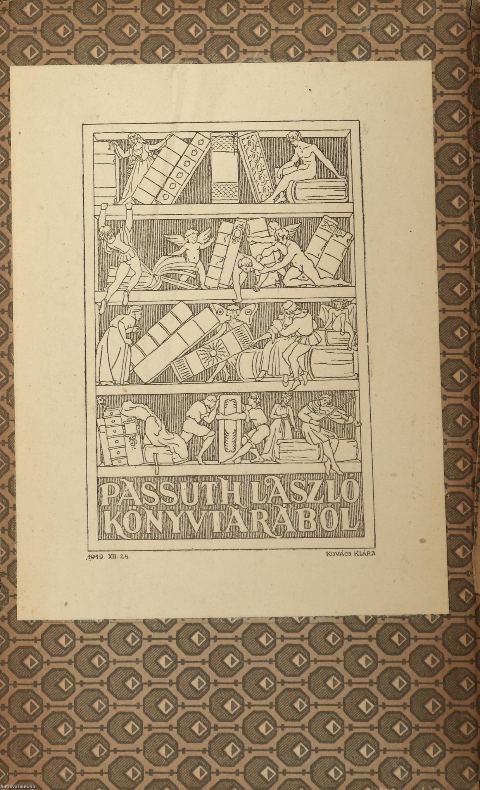 Az előlapon Passuth László író tollal beírt, jól olvasható tulajdonosi bejegyzése, valamint a címfedél belső oldalán illusztrált, 9,7 cm x 12,7 cm nagyságú Ex-libris címkéje (Kovács Klára, 1919) látható.