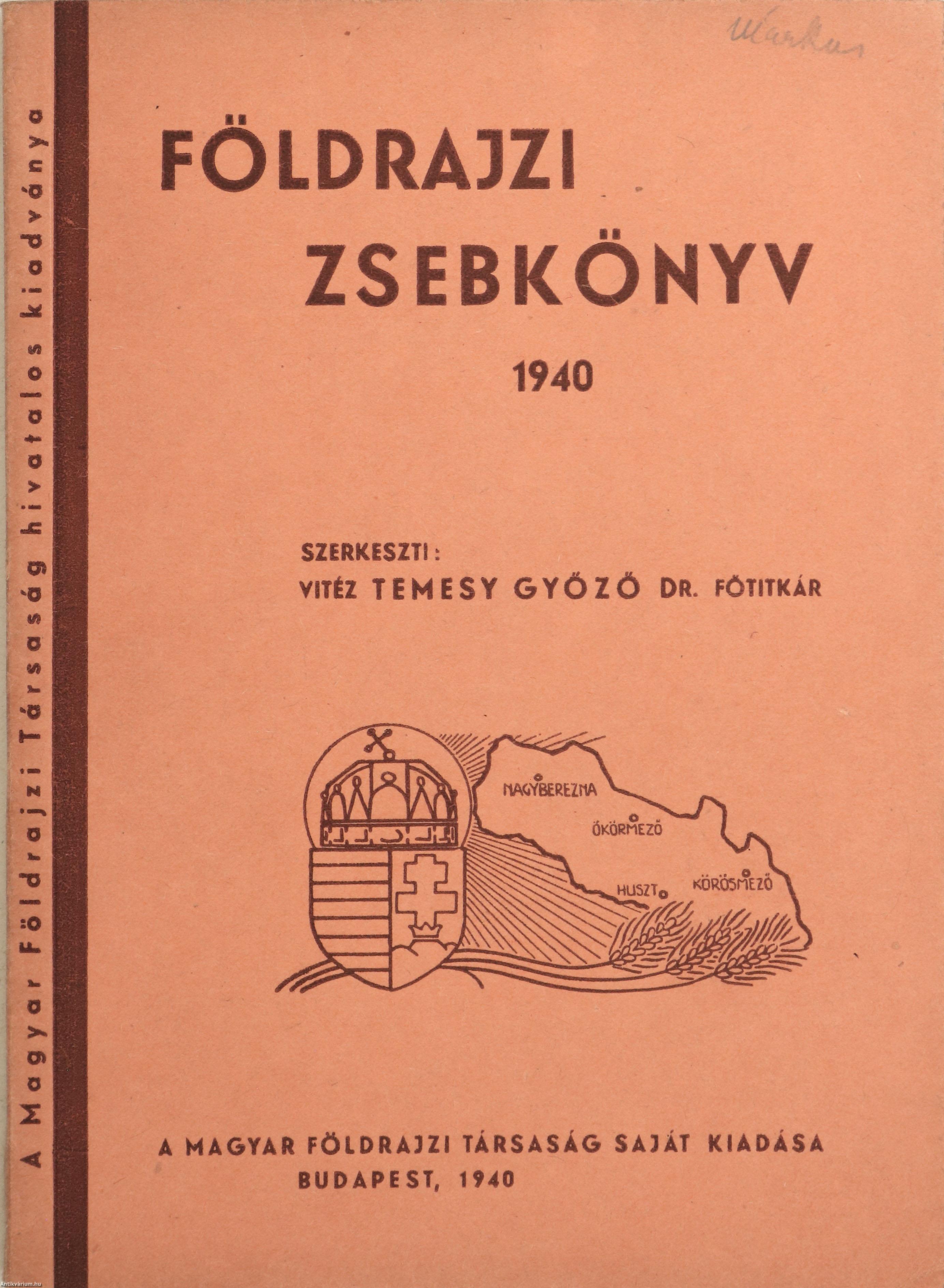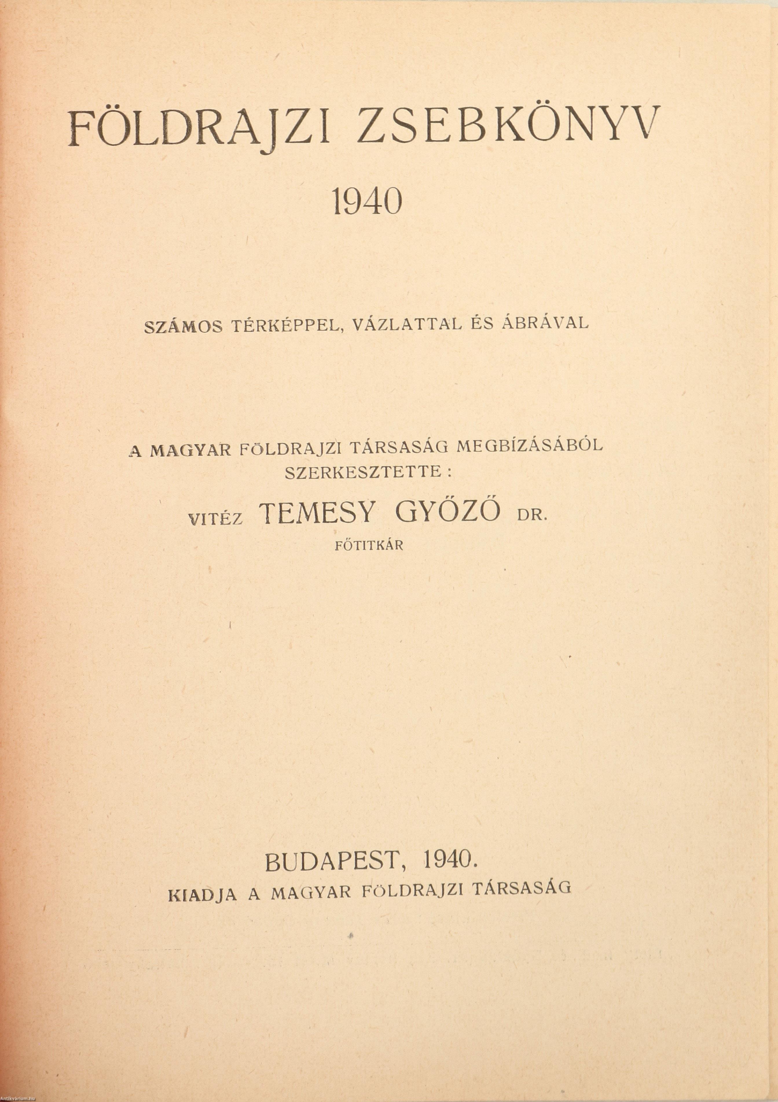 Földrajzi zsebkönyv 1940. A Magyar Földrajzi Társaság megbízásából szerkesztette: vitéz Temesy Győző.