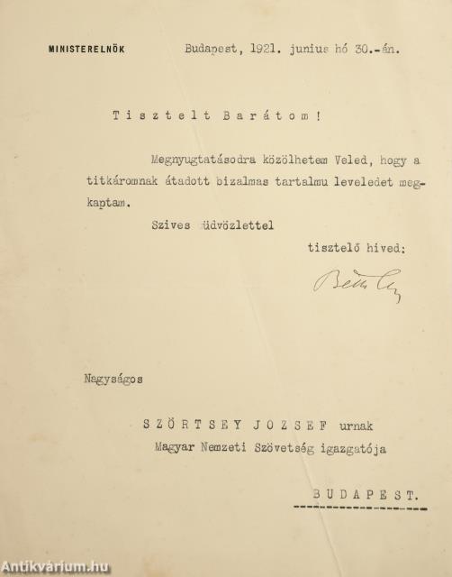 Bethlen István miniszterelnök személyes levele Szörtsey József részére.