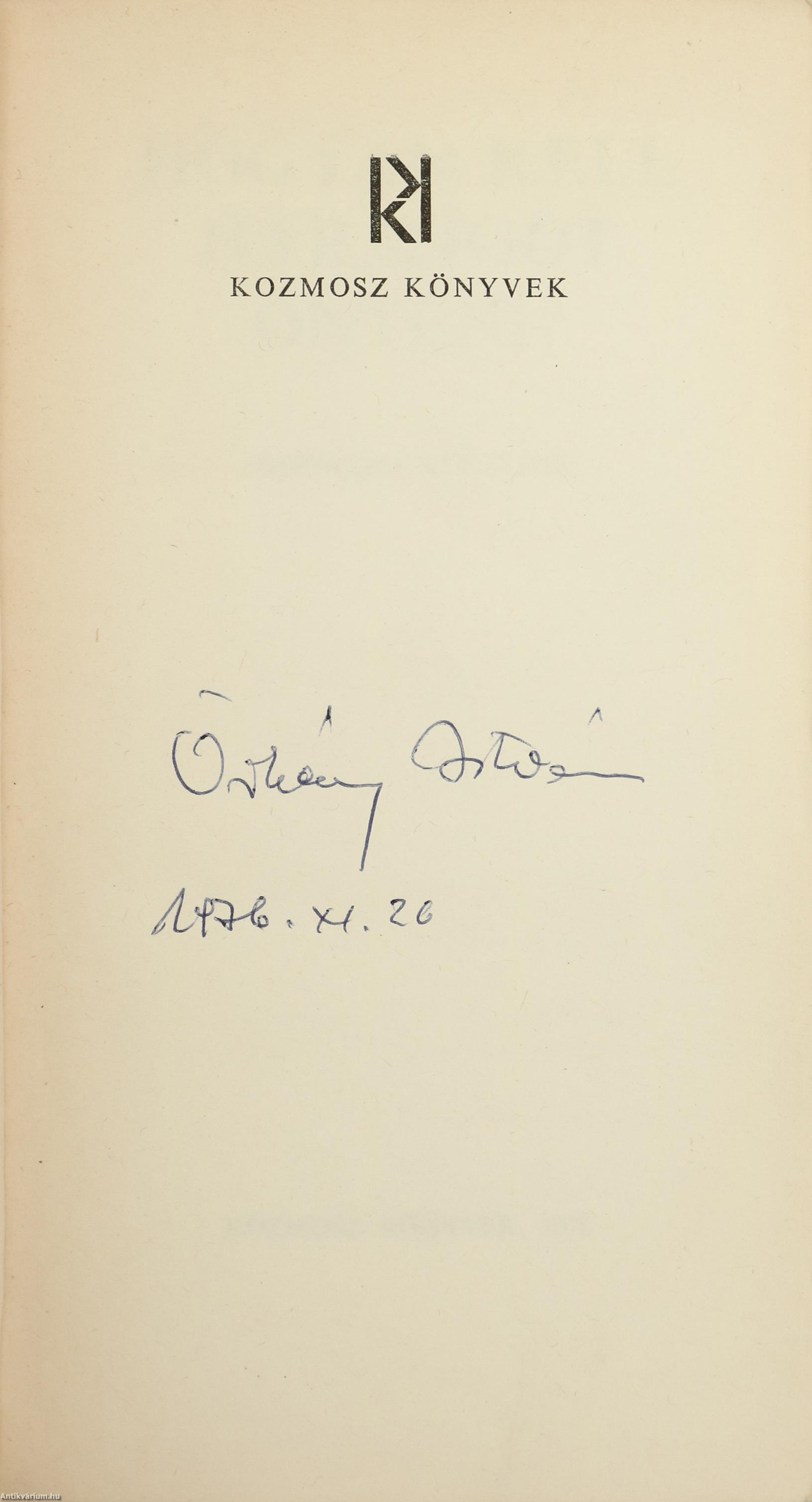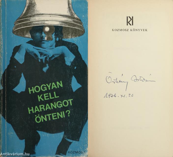 Örkény István Kossuth- és kétszeres József Attila-díjas író által aláírt példány. A Kozmosz Könyvek c. sorozatban (számjelzés nélkül) megjelent mű. Hogyan kell harangot önteni? Irodalmi riportok. Válogatta és szerkesztette: Székely Éva. Az előlapon Örkény István tollal beírt, jól olvasható aláírása látható. A fedél Szabó Árpád munkája. A könyv ismertetőjével, a sorozatban megjelent könyvek jegyzékével és tartalomjegyzékkel kiegészített kötet. Nyomtatta az Egyetemi Nyomda, Budapesten. Kiadói ragasztott papírkötésben lévő példány feliratozott, illusztrációval ellátott címfedéllel, feliratos könyvgerinccel, hiánytalan állapotban. A kötetet aláírta Örkény István (Budapest, 1912. április 5. – Budapest, 1979. június 24.) Kossuth- és kétszeres József Attila-díjas író, gyógyszerész, az "Újhold" c. meghatározó irodalmi lap elismert társszerkesztője. A világirodalmi színvonalú magyar groteszk próza kiemelkedő, egyedi hangú, elismert megteremtője. Színműveire a jól kidolgozott karakterek, a meghökkentő cselekménybonyolítás és az egyedi abszurd helyzetek a jellemzők.