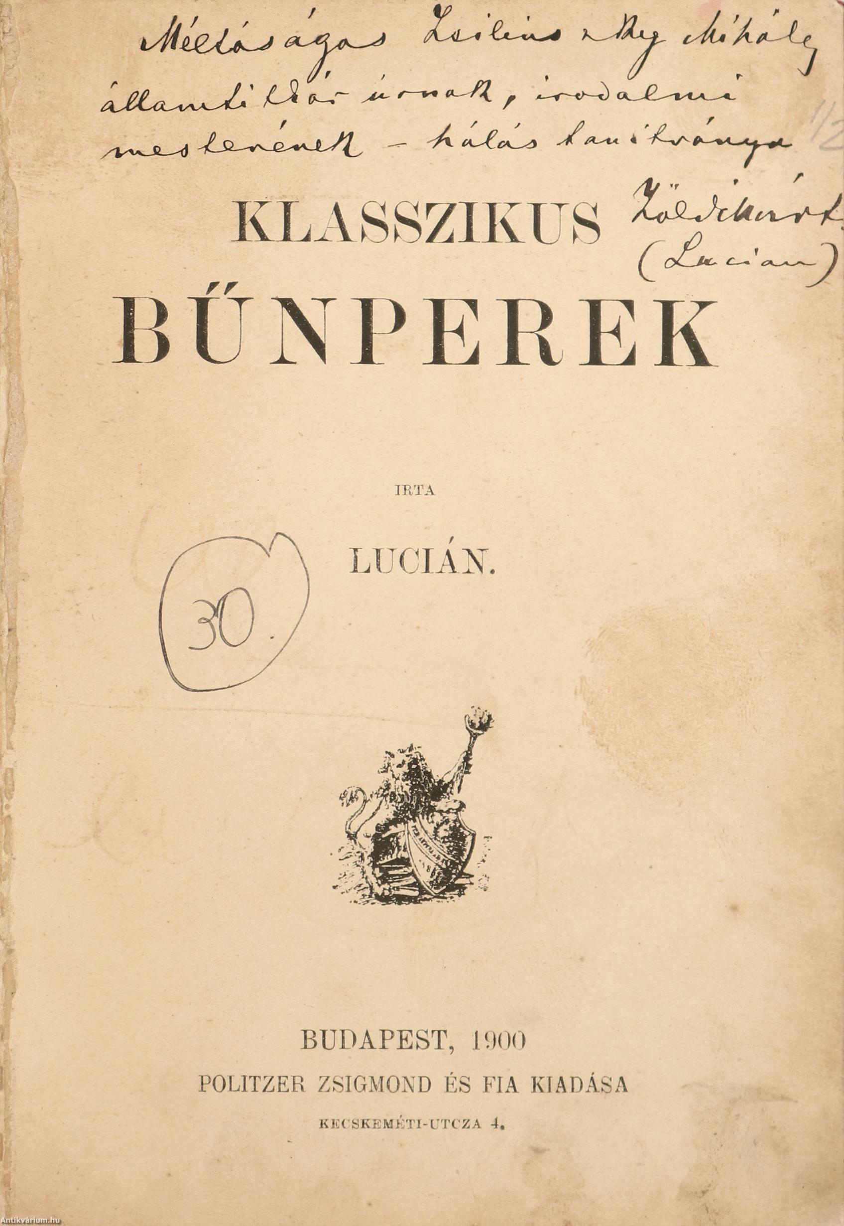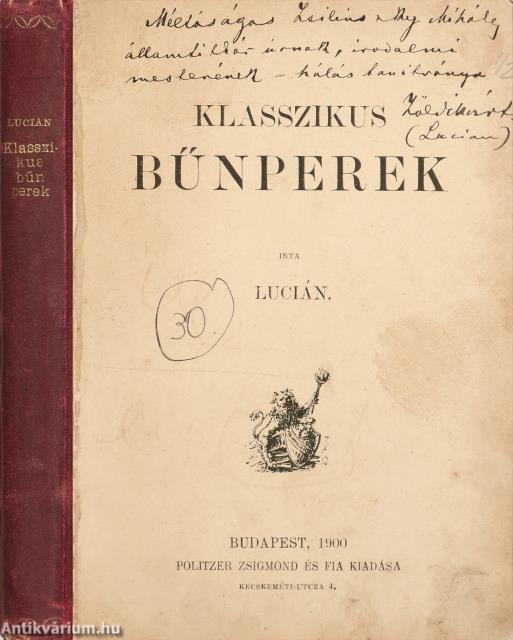 Szerző által dedikált példány. Első kiadás. Klasszikus bűnperek. Írta: Lucián [Zöldi Márton].