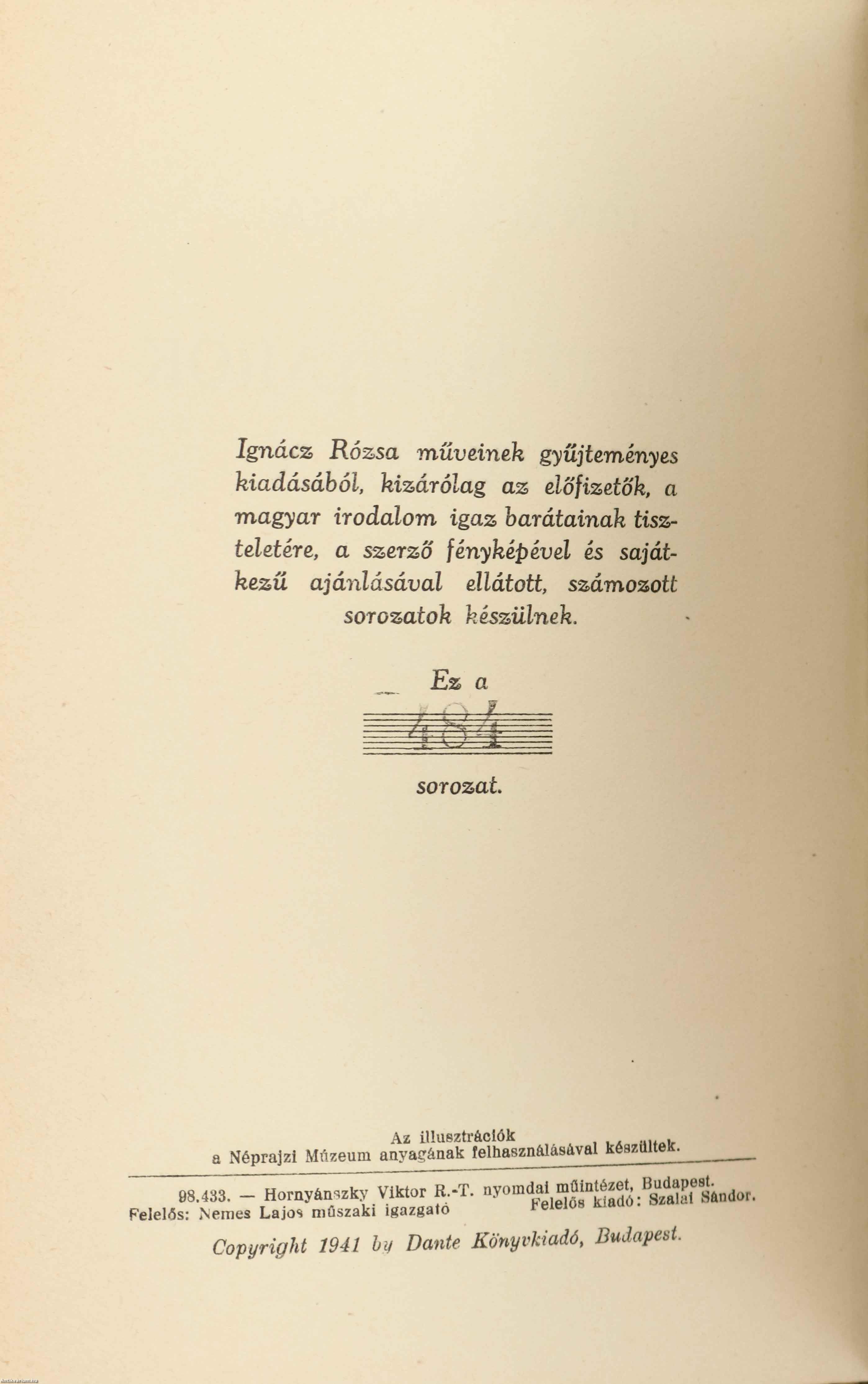 "Ignácz Rózsa műveinek gyűjteményes kiadásából, kizárólag az előfizetők, a magyar irodalom igaz barátainak tiszteletére, a szerző fényképével és saját kezű ajánlásával ellátott, számozott sorozatok készülnek." Ez a 484. sorozat.